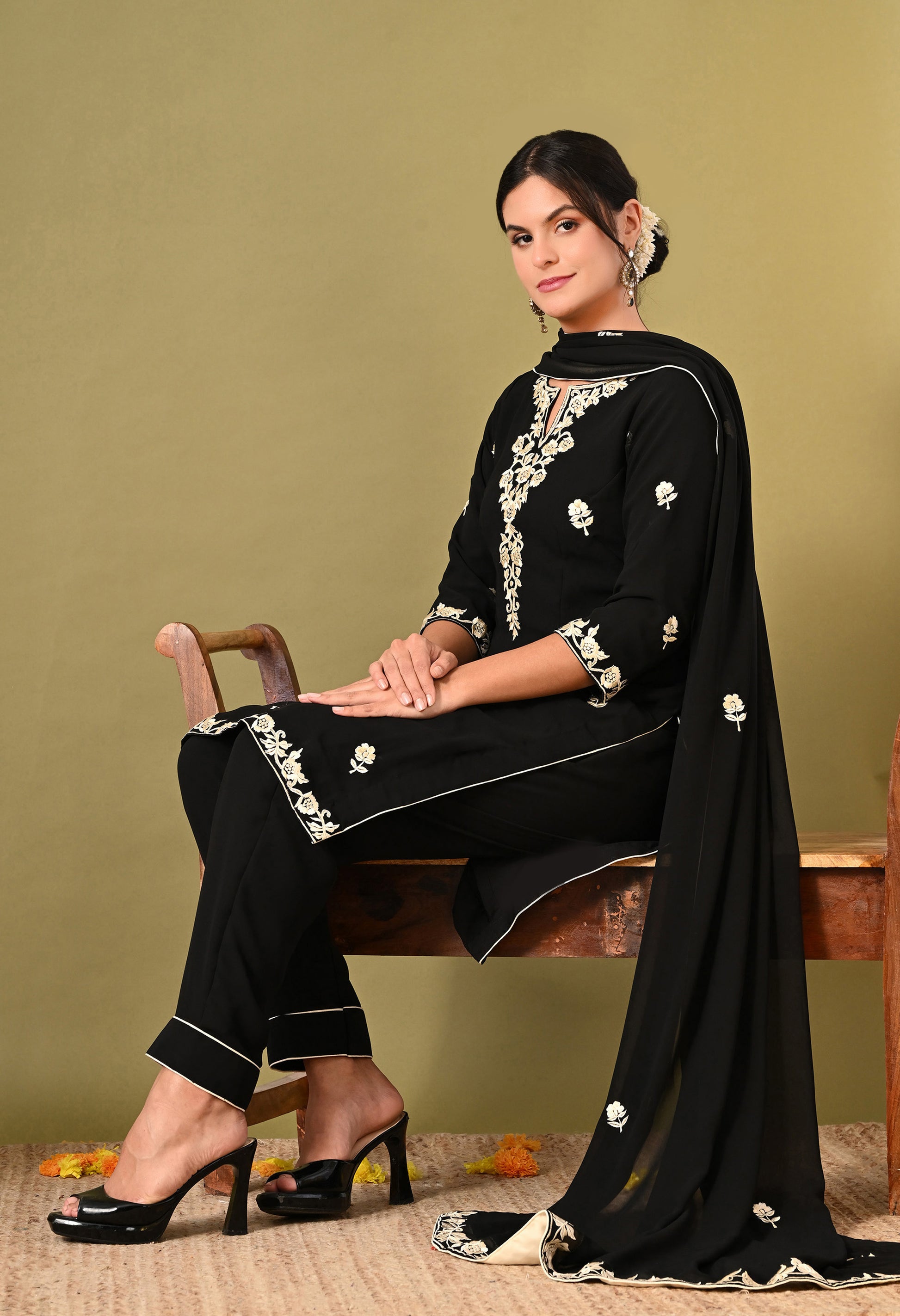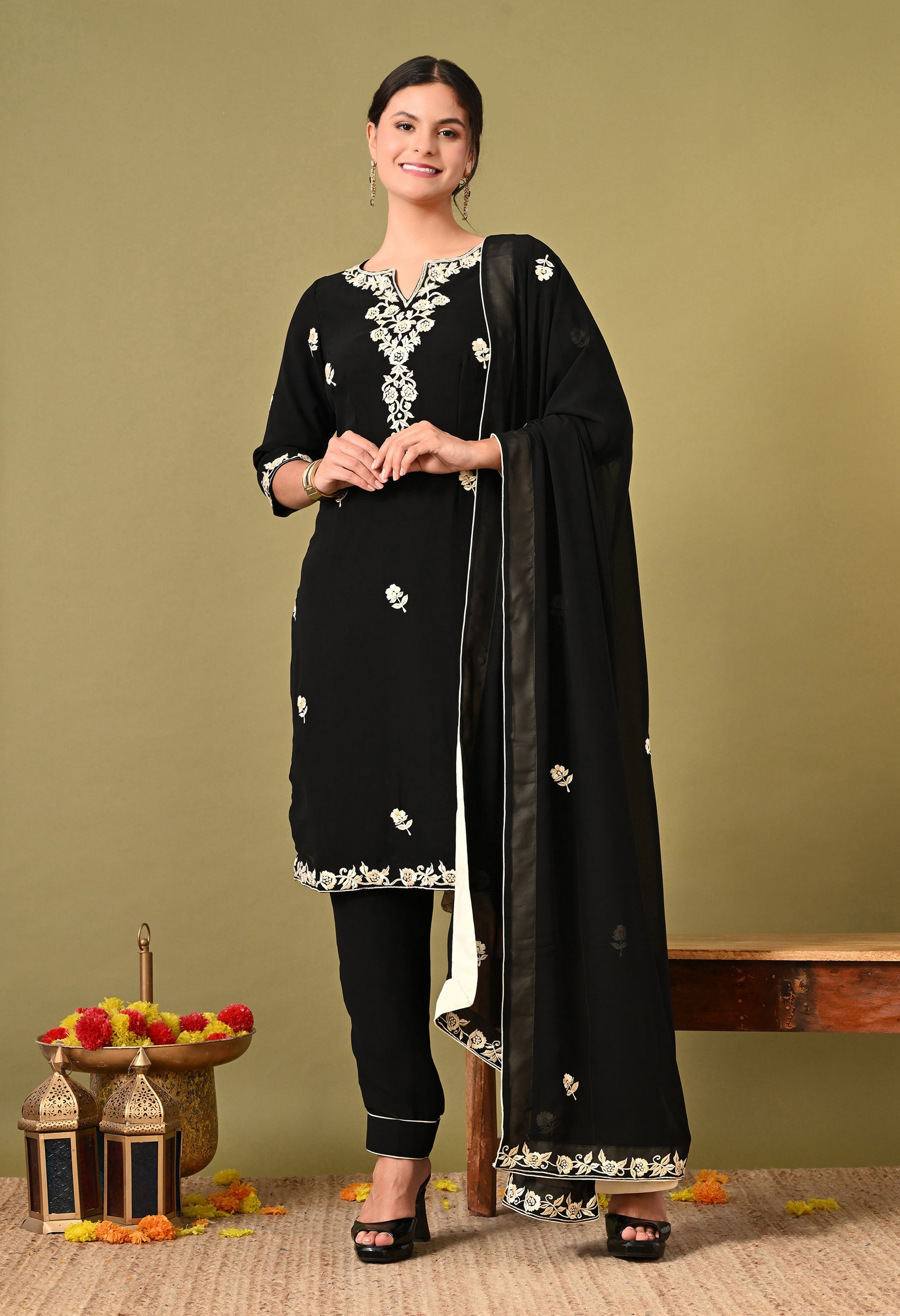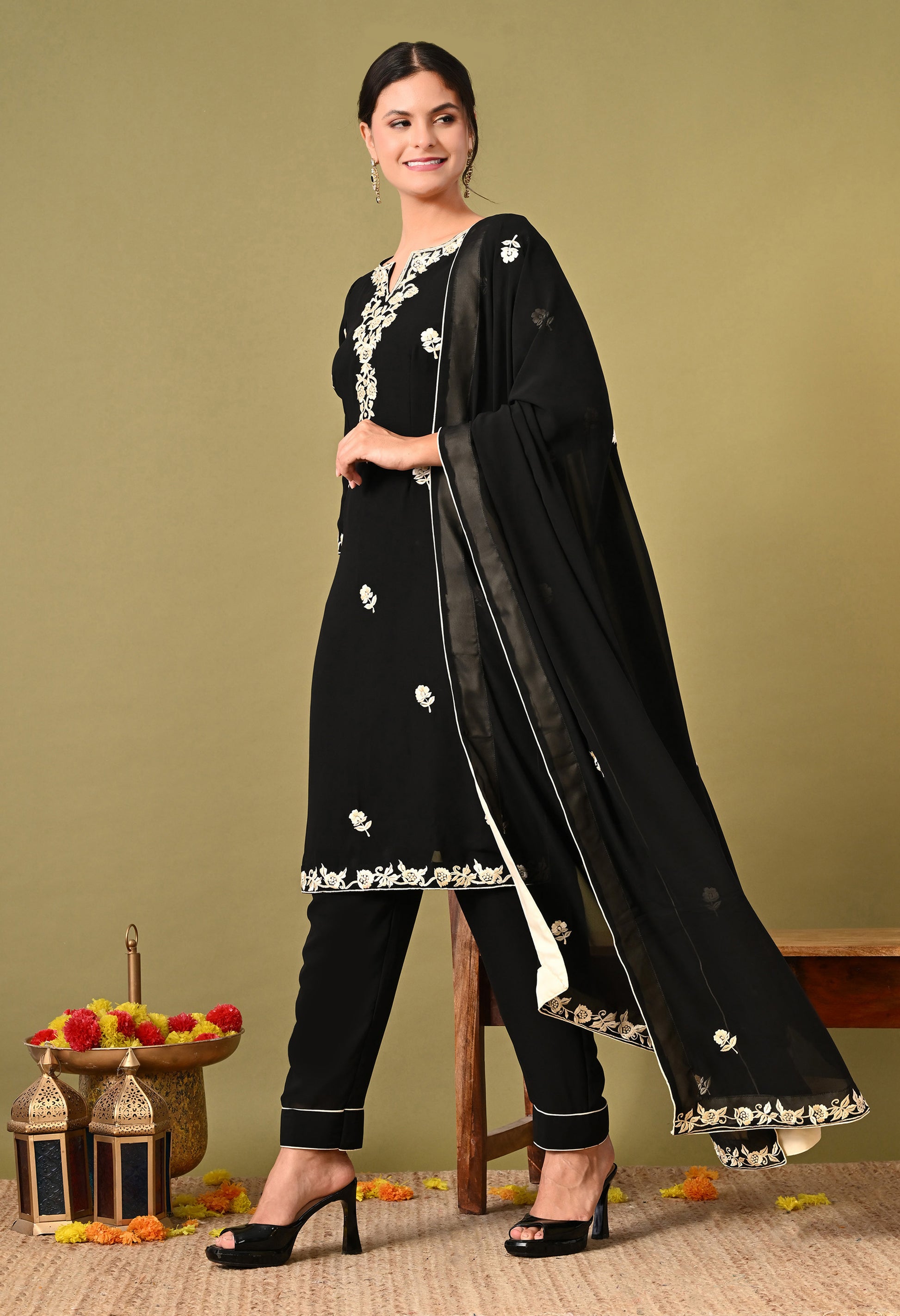 Capture hearts in our black Kurta Set, adorned with a soft georgette dupatta, an expertly crafted georgette kurta, and a chic georgette bottom. The amazing parsi work makes it a standout piece. Embrace luxury with ease!