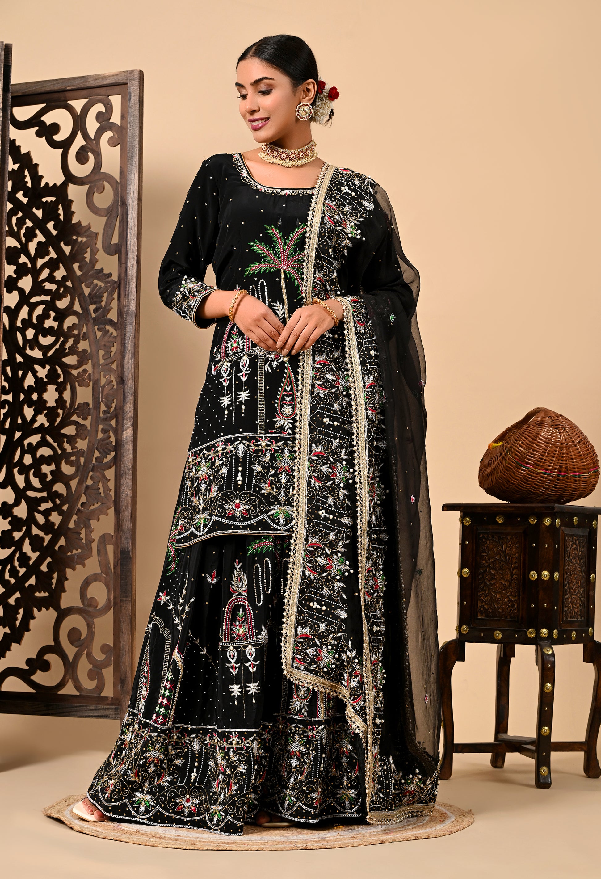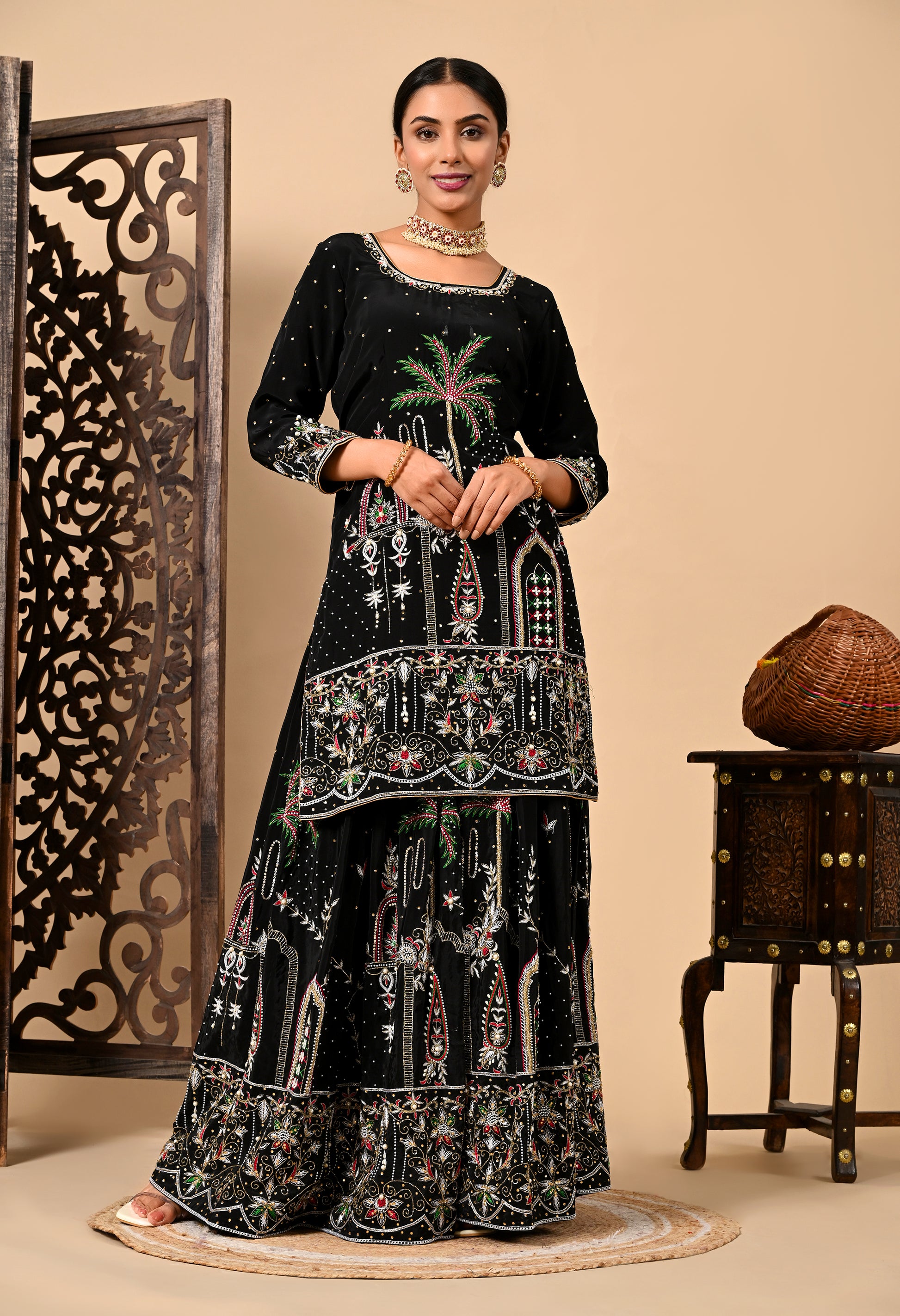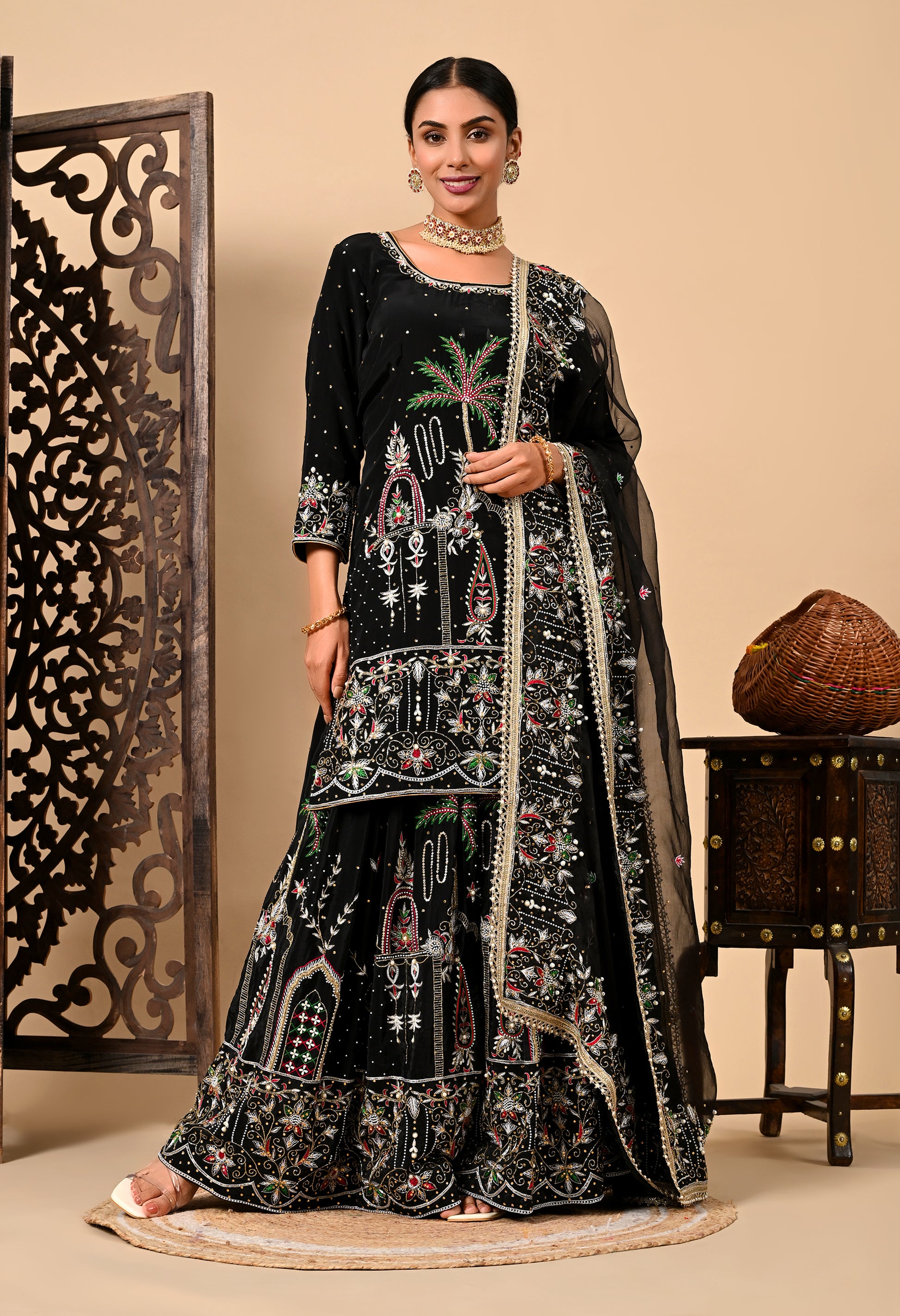 Graceful Dark Black Sharara Set with Excellent Work and Embroidery