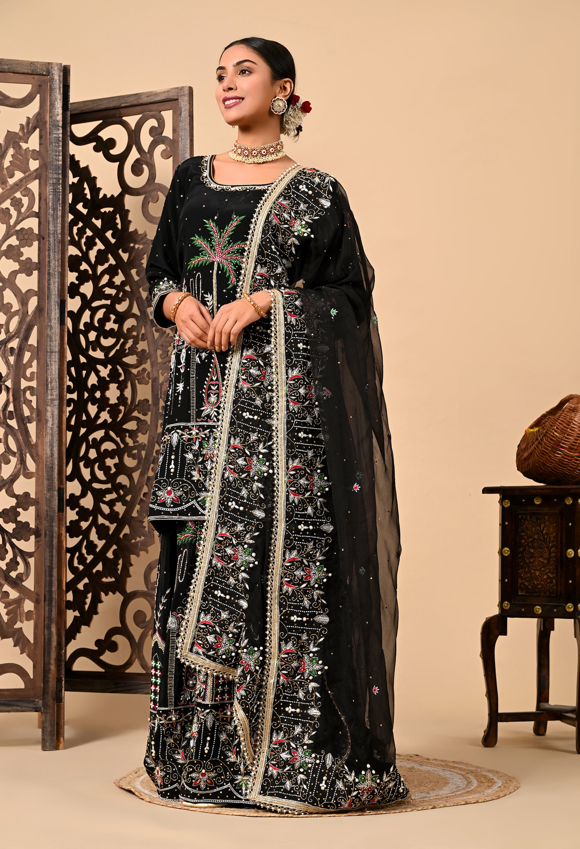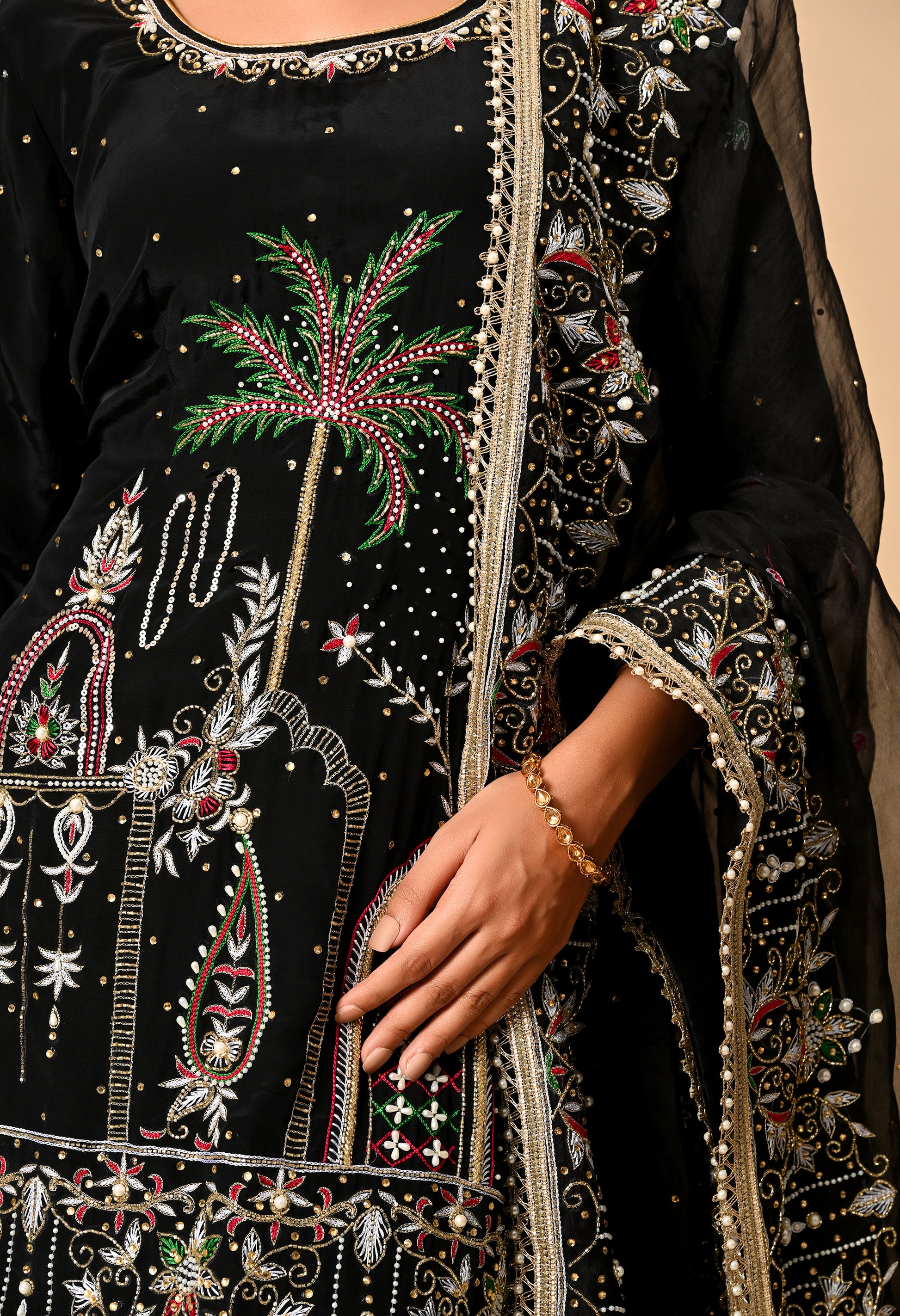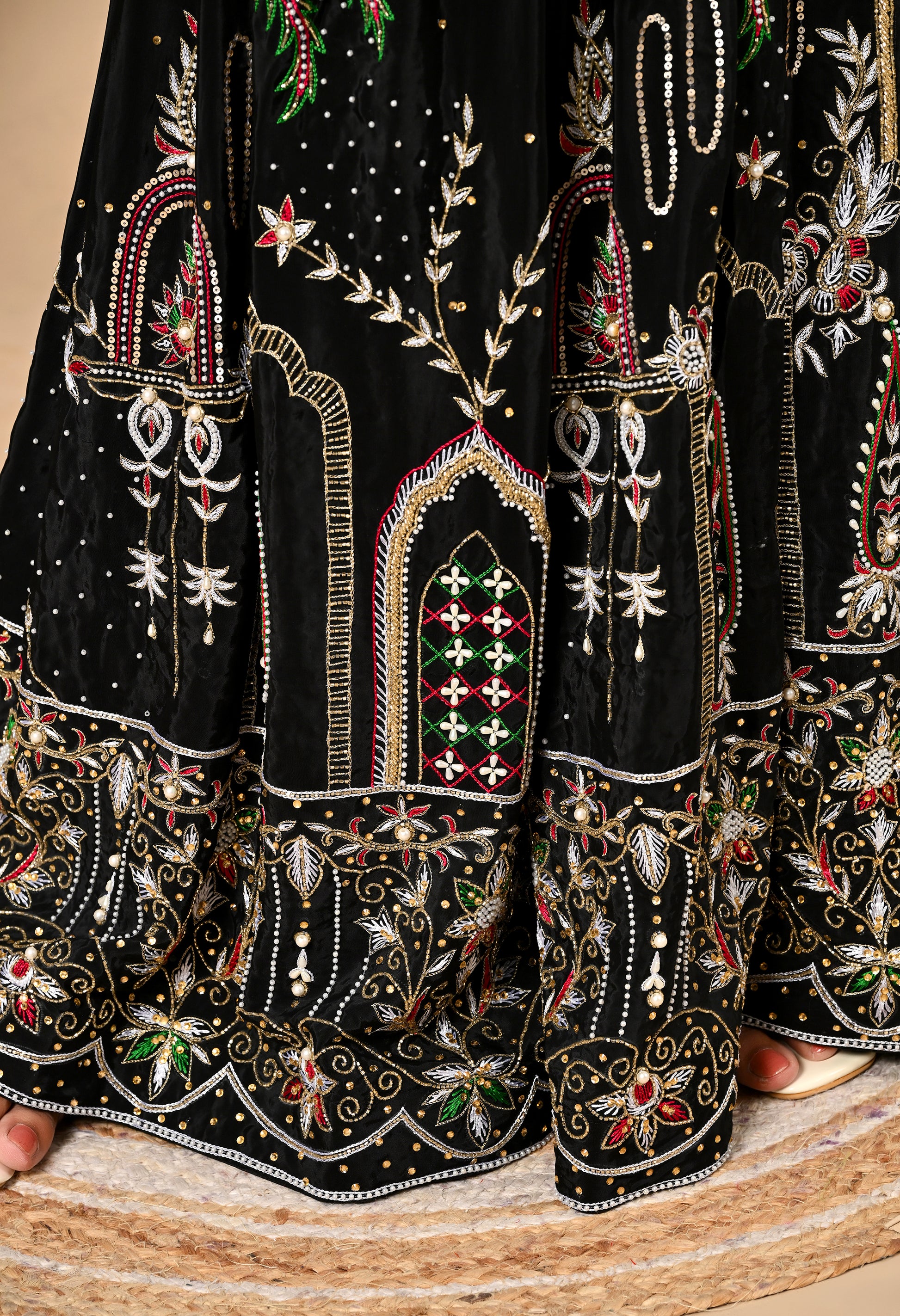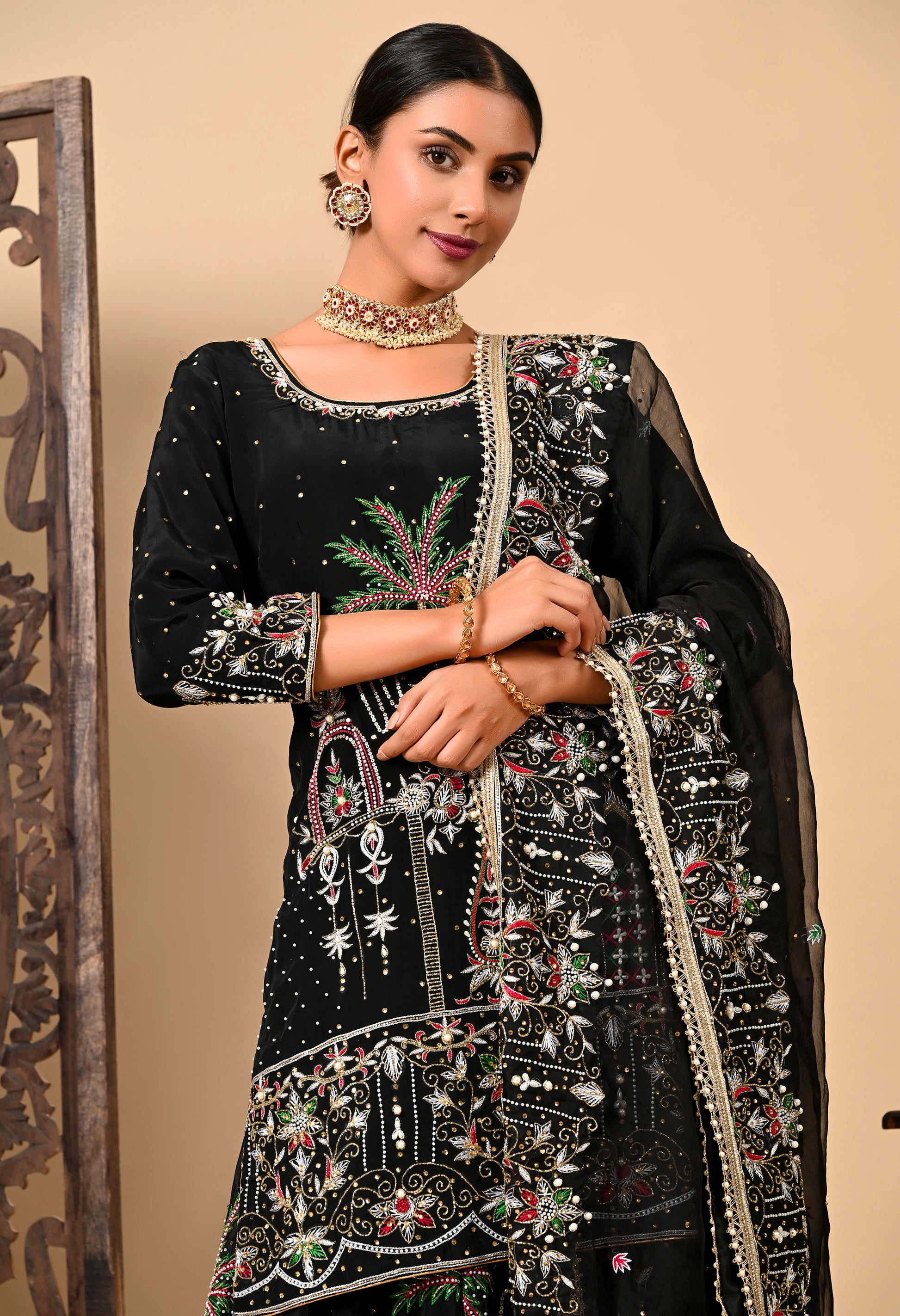Graceful Dark Black Sharara Set with Excellent Work and Embroidery