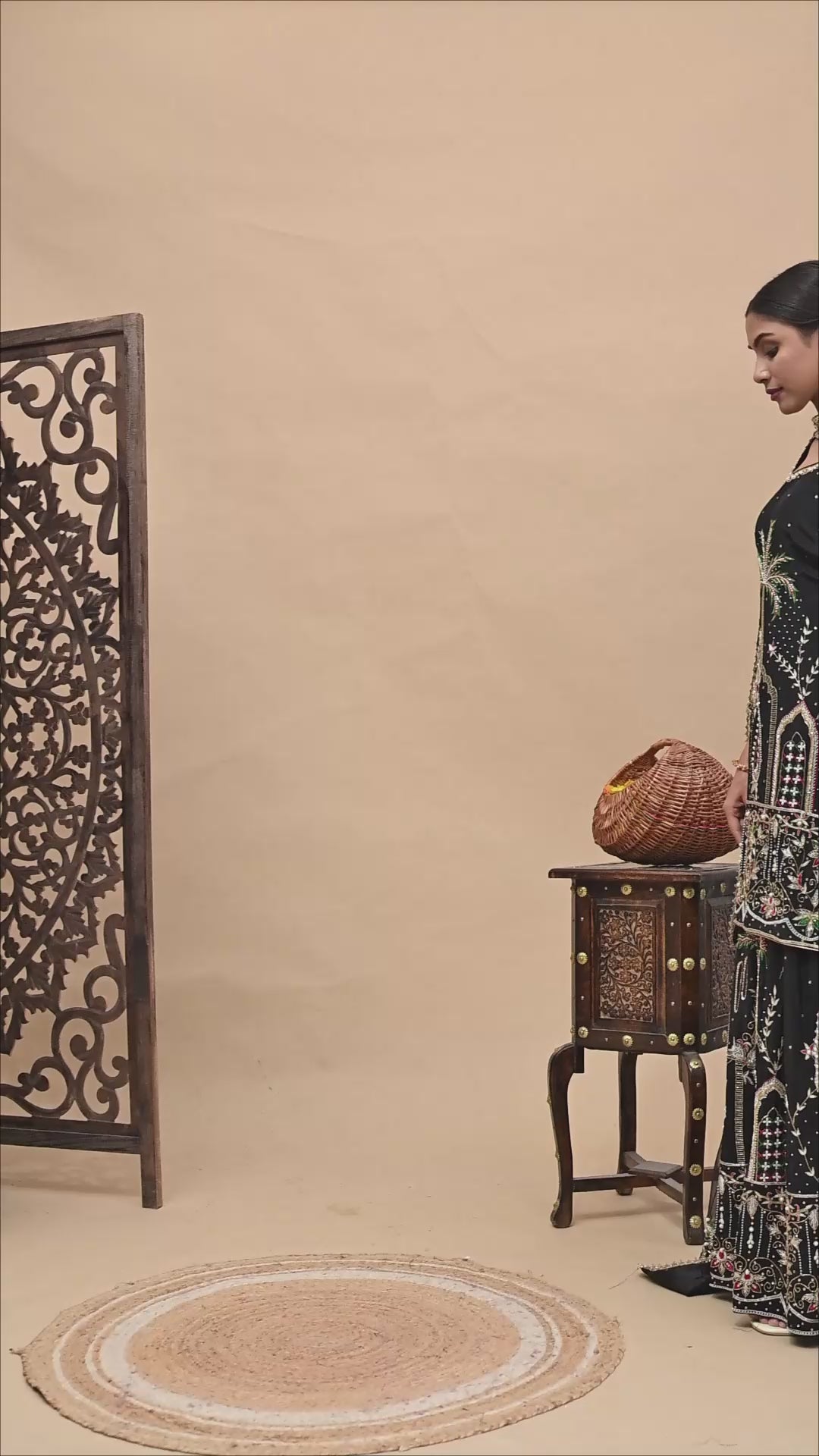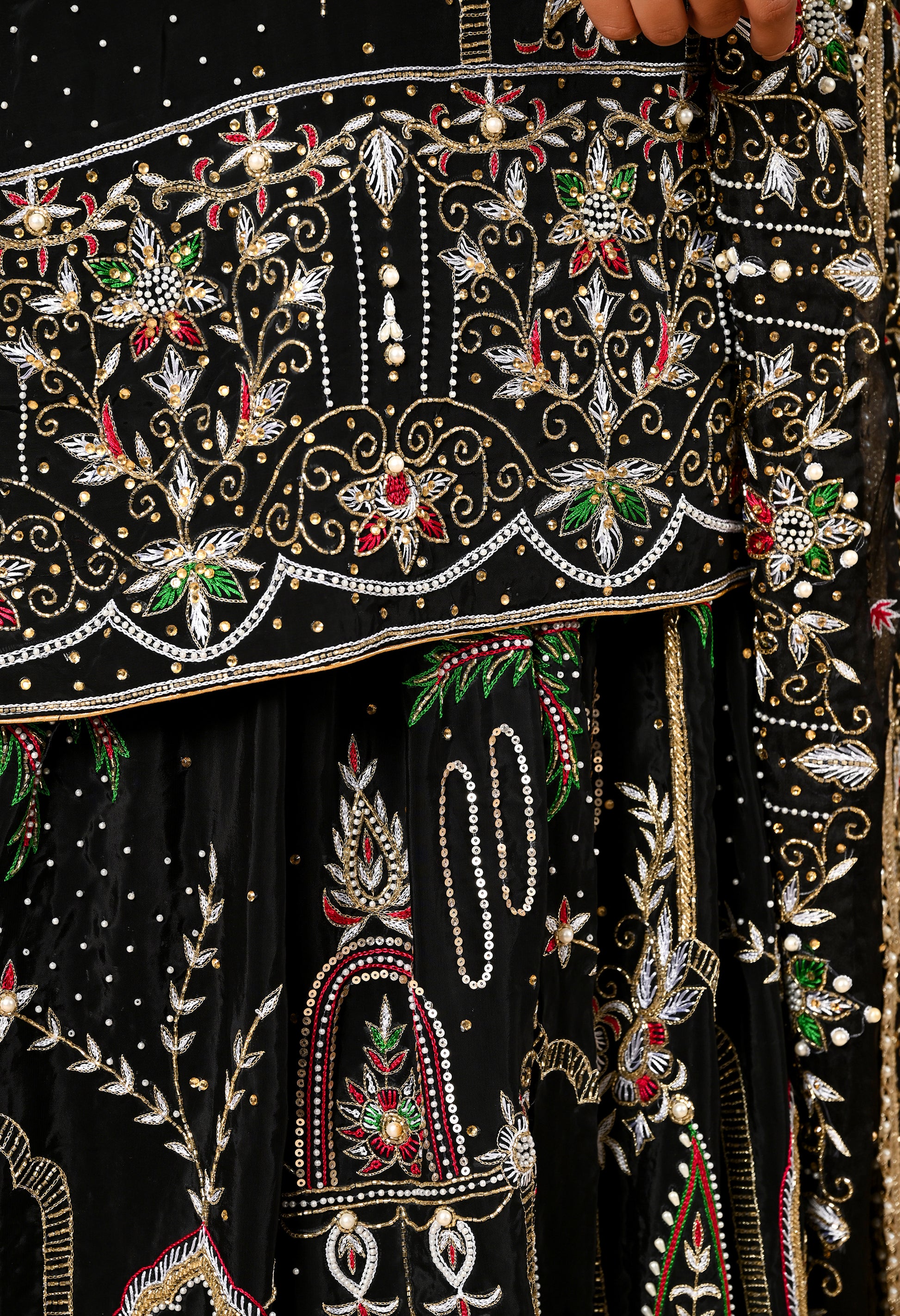 Capture the essence of tradition with our dark black Sharara Set, paired with a graceful organza dupatta, an exquisitely crafted crepe kurta, and a matching crepe sharara. The detailed zardozi, dabka, crystal, and thread work exude a timeless charm.