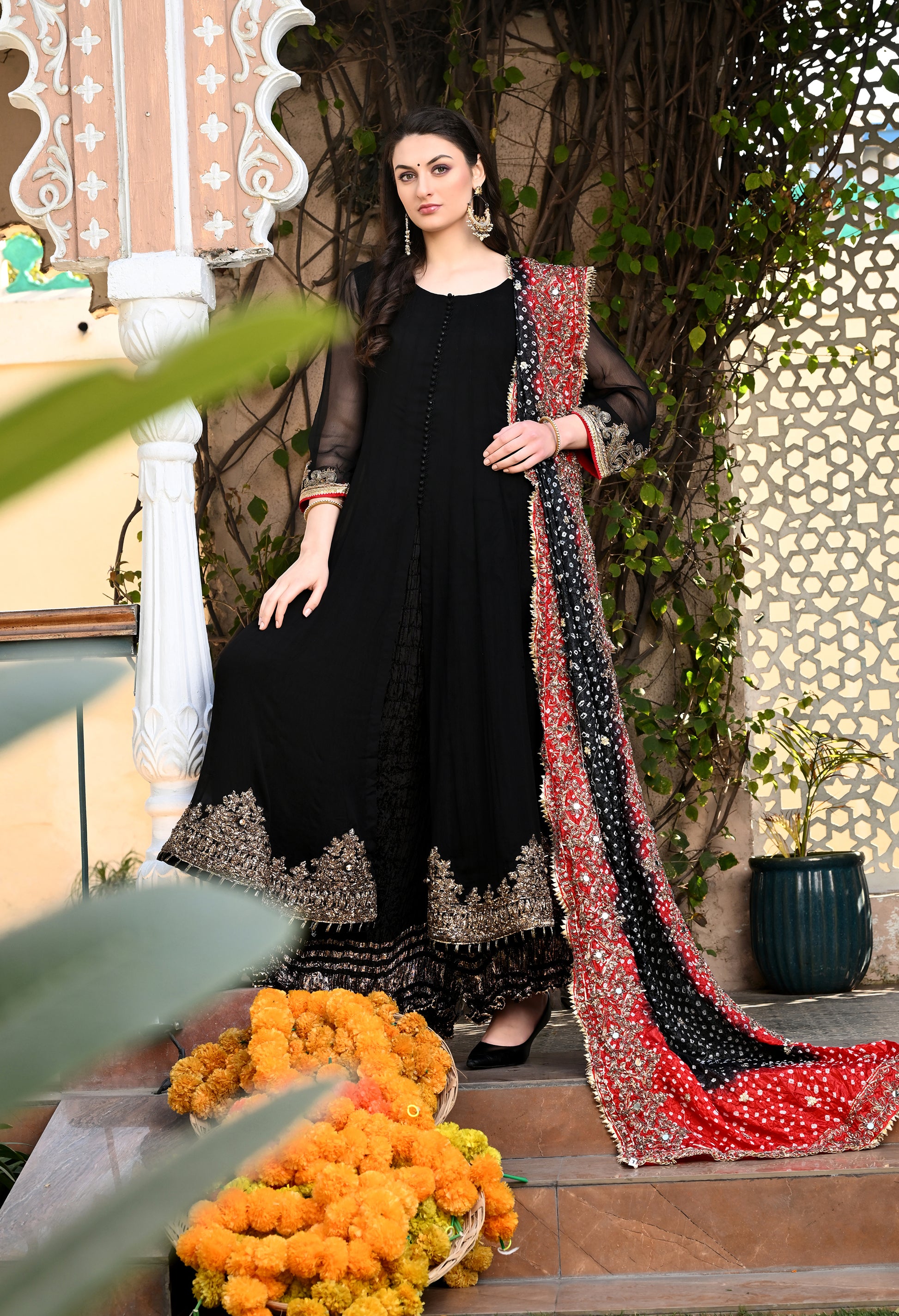 Immerse yourself in elegance with our sophisticated black Sharara Set, featuring masterful hand embroidery and radiant gotta, sequin, kora, and dabka work. The ethereal chiffon kurta, silk dupatta, and silk sharara embody understated luxury.
