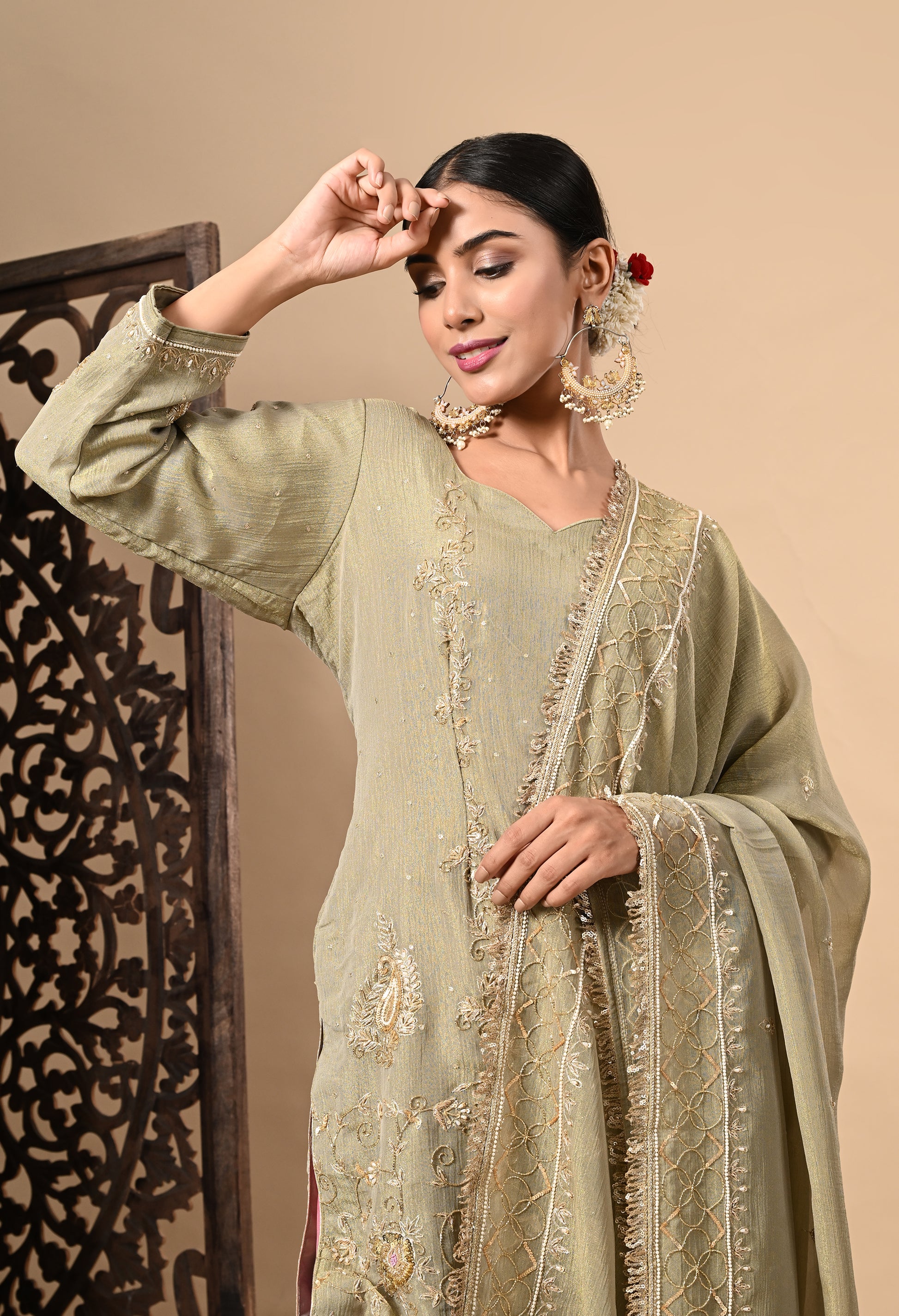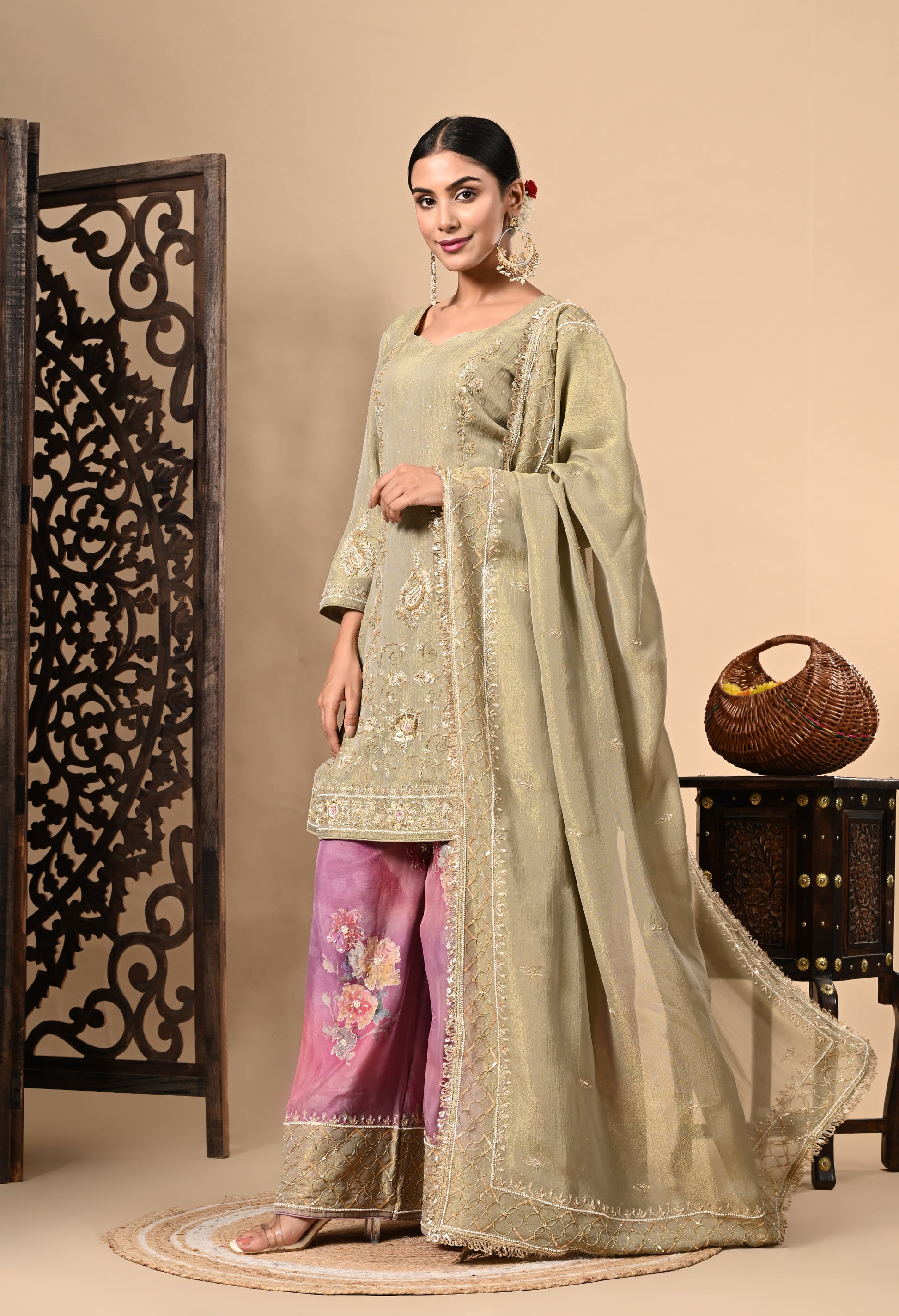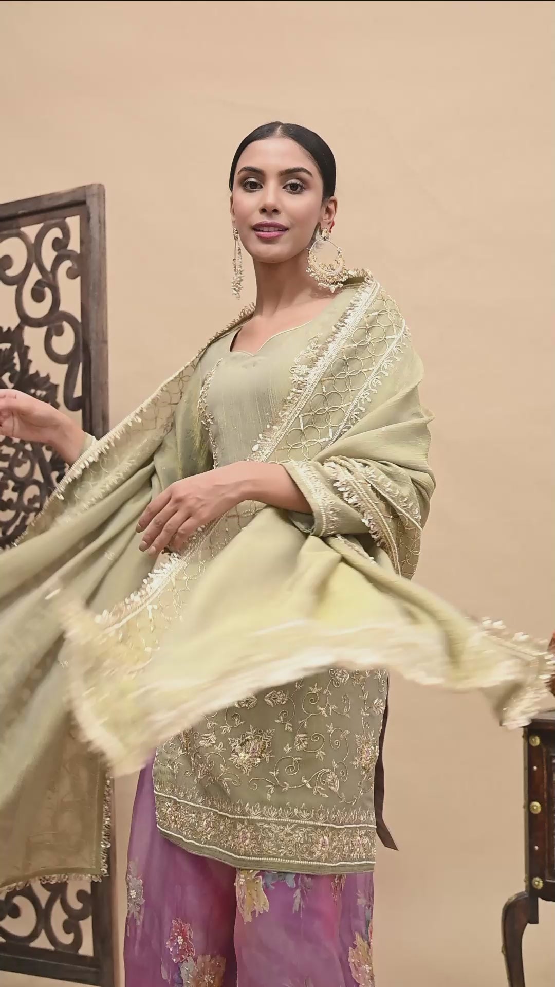 Make every moment special with our green and lavender Sharara Set, featuring a light crushed tissue dupatta, an intricately designed green crushed tissue kurta, and a complementing lavender printed crepe sharara. The stunning zardozi, dabka, sequin, and thread embellishments make it a timeless masterpiece.