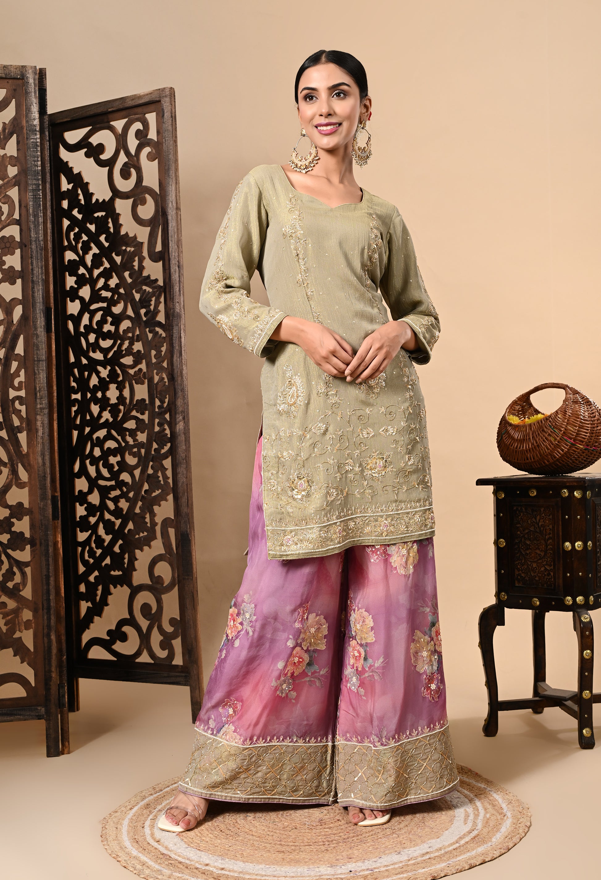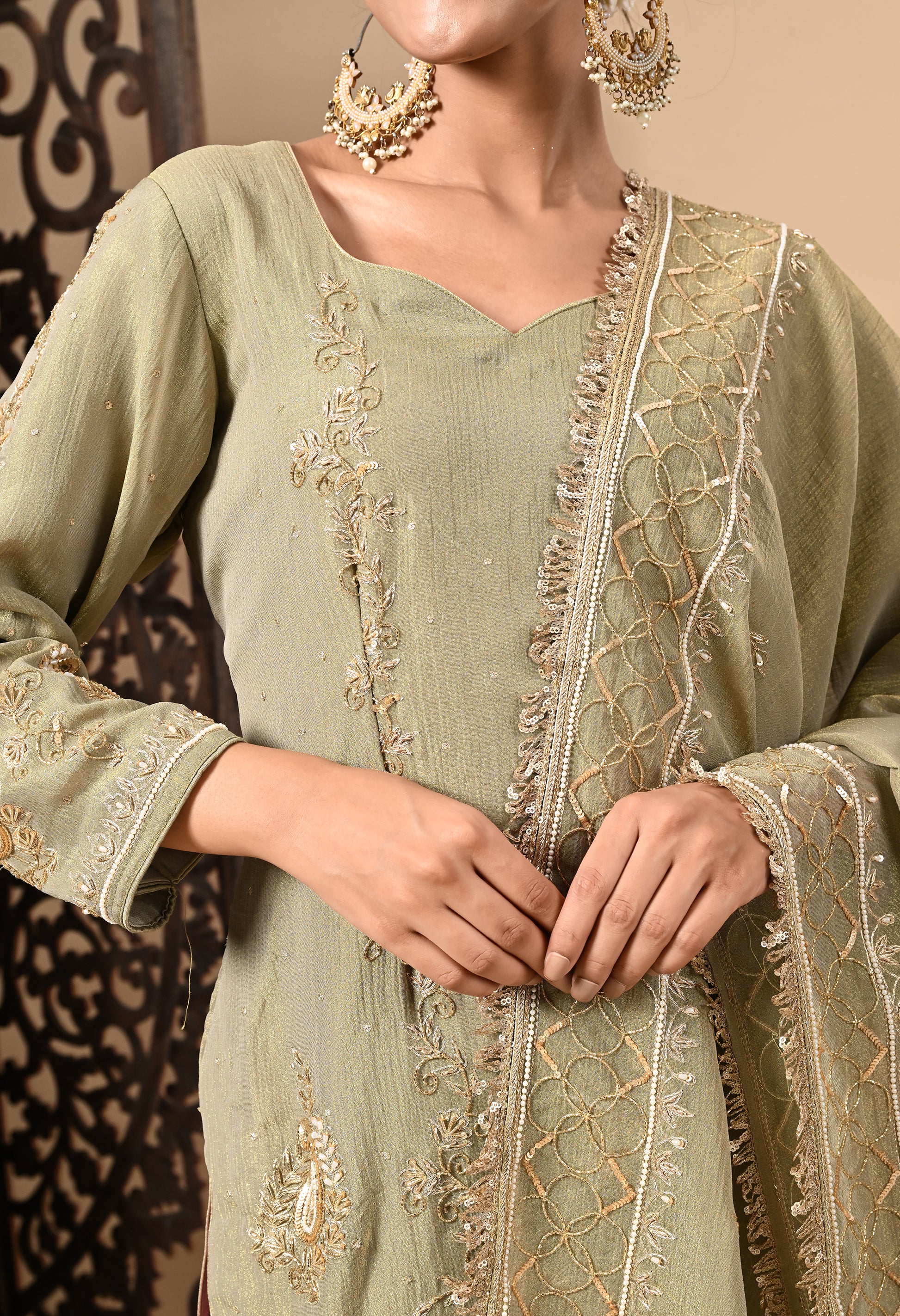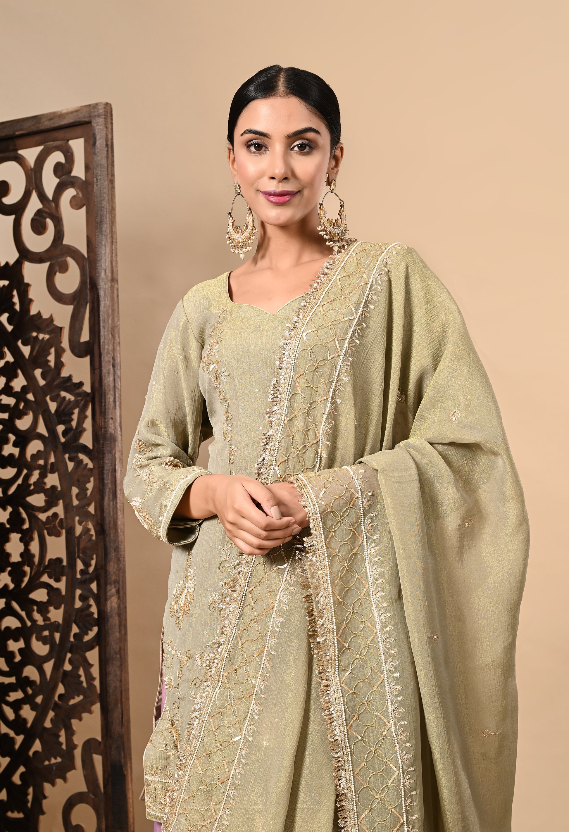 Make every moment special with our green and lavender Sharara Set, featuring a light crushed tissue dupatta, an intricately designed green crushed tissue kurta, and a complementing lavender printed crepe sharara. The stunning zardozi, dabka, sequin, and thread embellishments make it a timeless masterpiece.