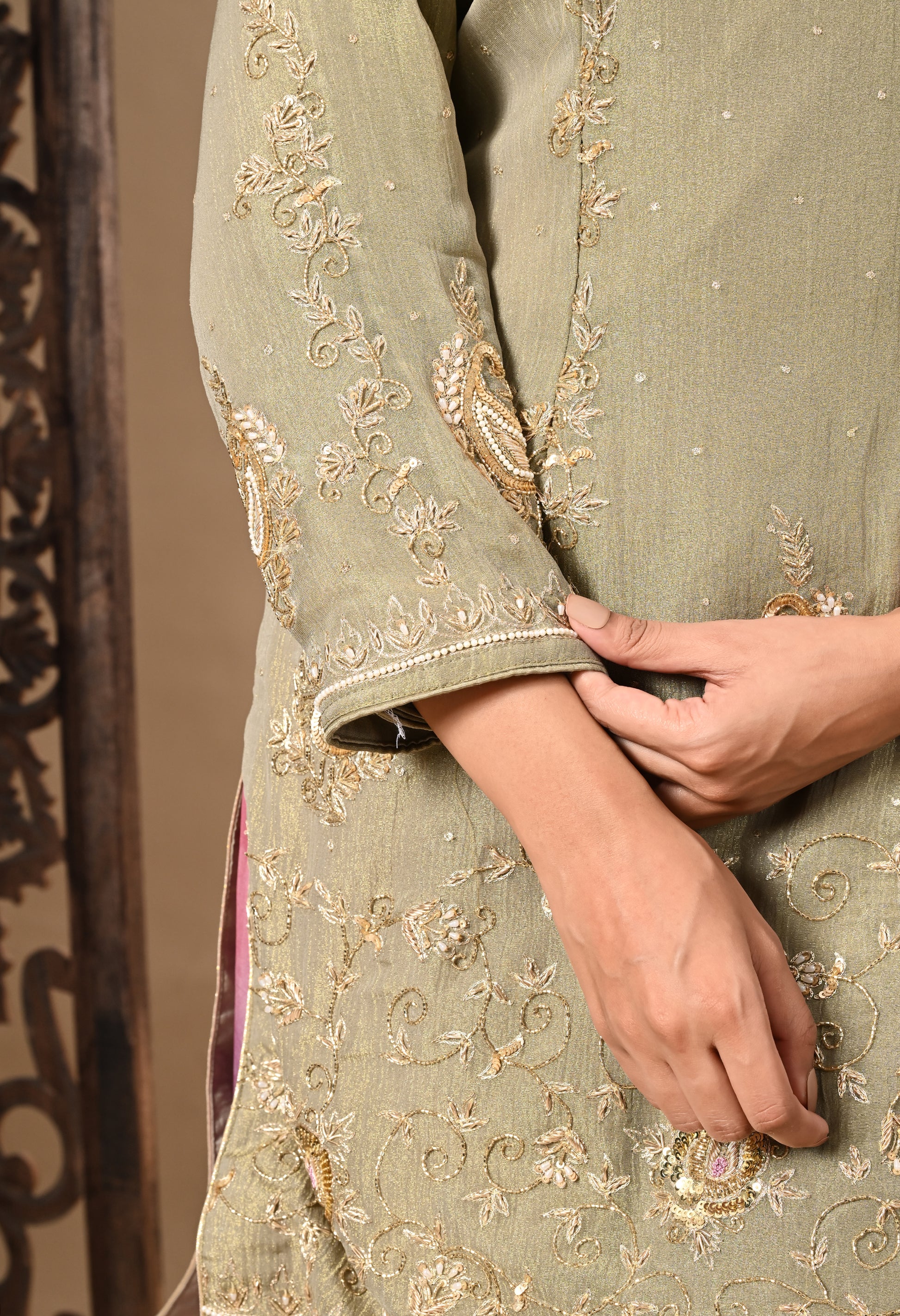 - Breathtaking zardozi, dabka, sequence, and pearl work on crushed tissue Kurta and the Sleeves.