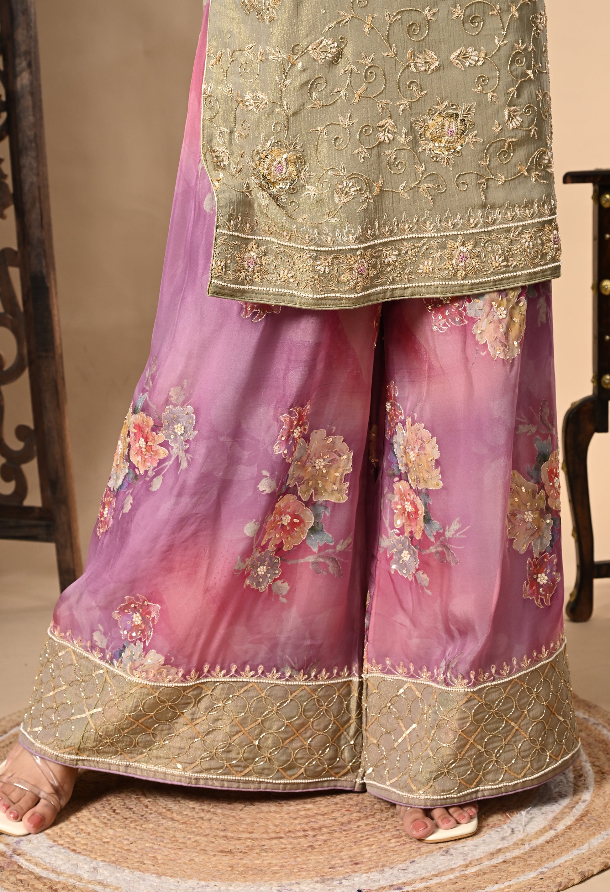 Green and Lavender Sharara Set with Zardozi, Dabka, Sequence, and Thread