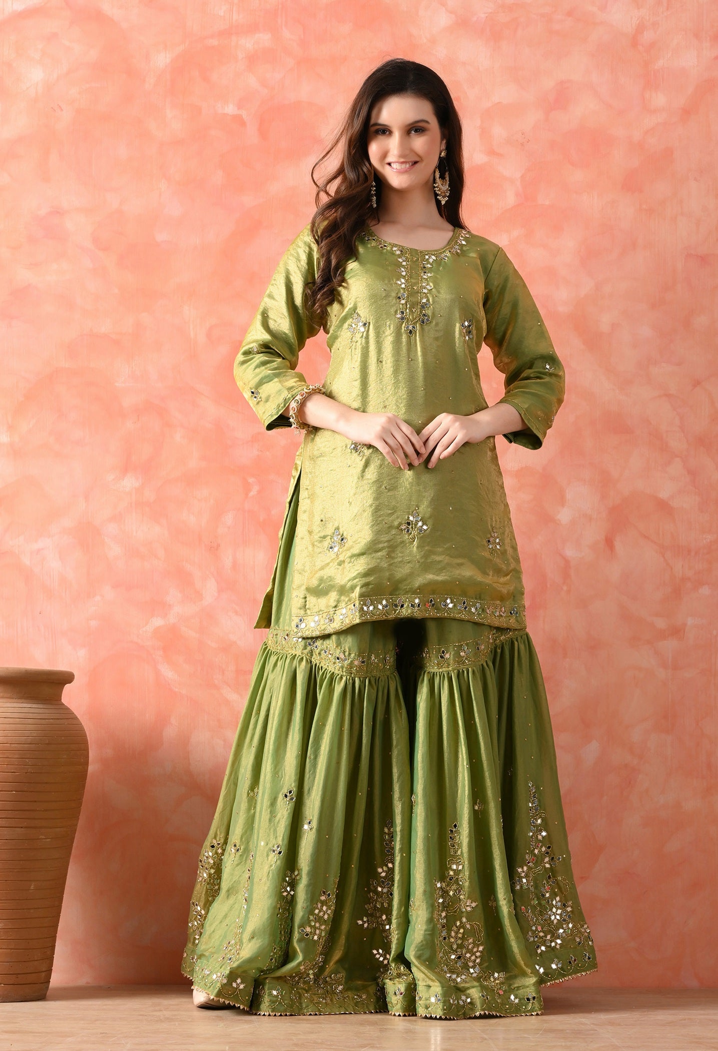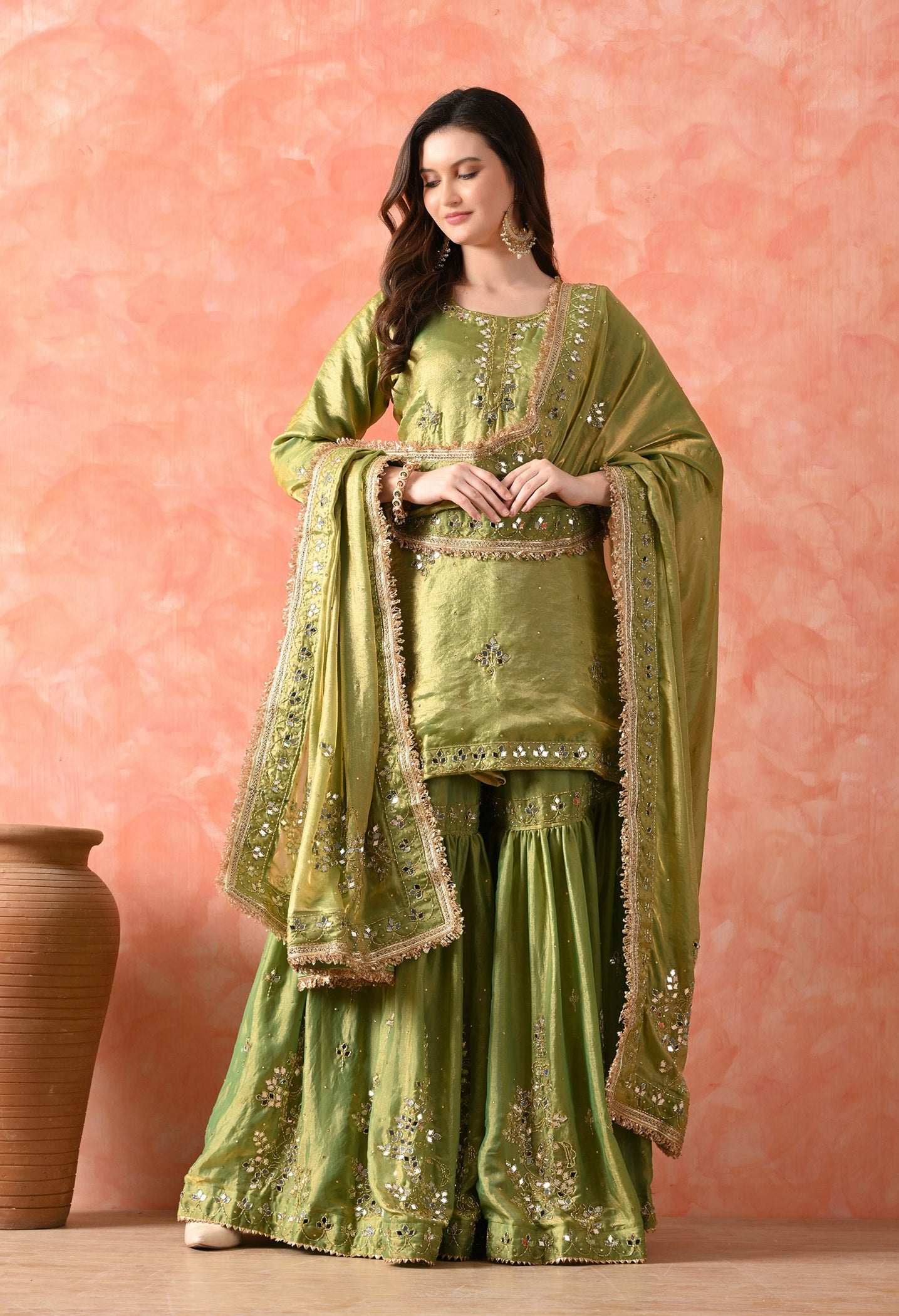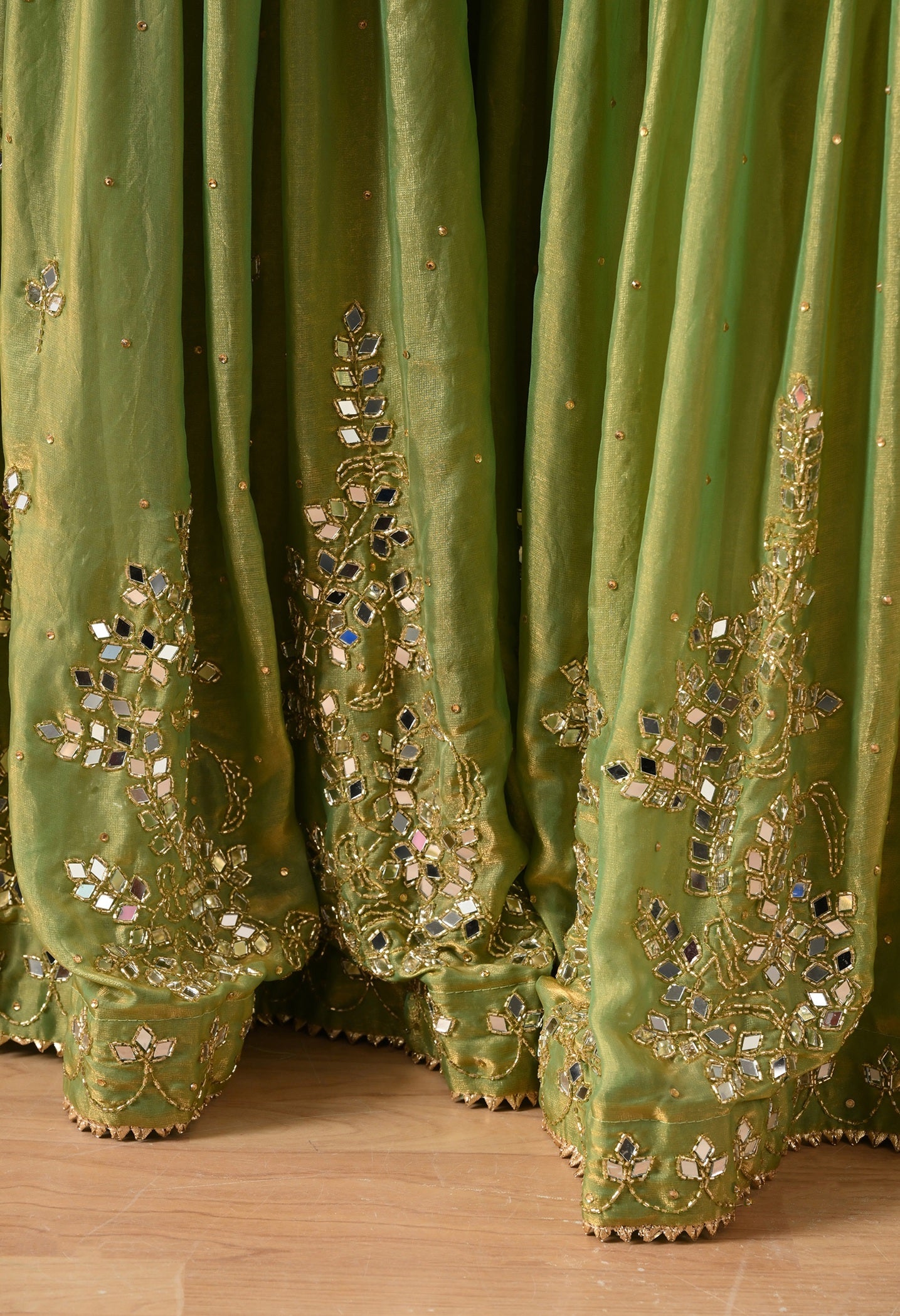 This green gharara set is made for grand celebrations — from mehndi to weddings. The kurti and dupatta are crafted in sheer glass silk that gives a soft, elegant glow, while the brocade gharara adds rich volume and texture. Hand-embroidered with mirrors and cutdana, it’s festive, graceful, and a complete head-turner. -