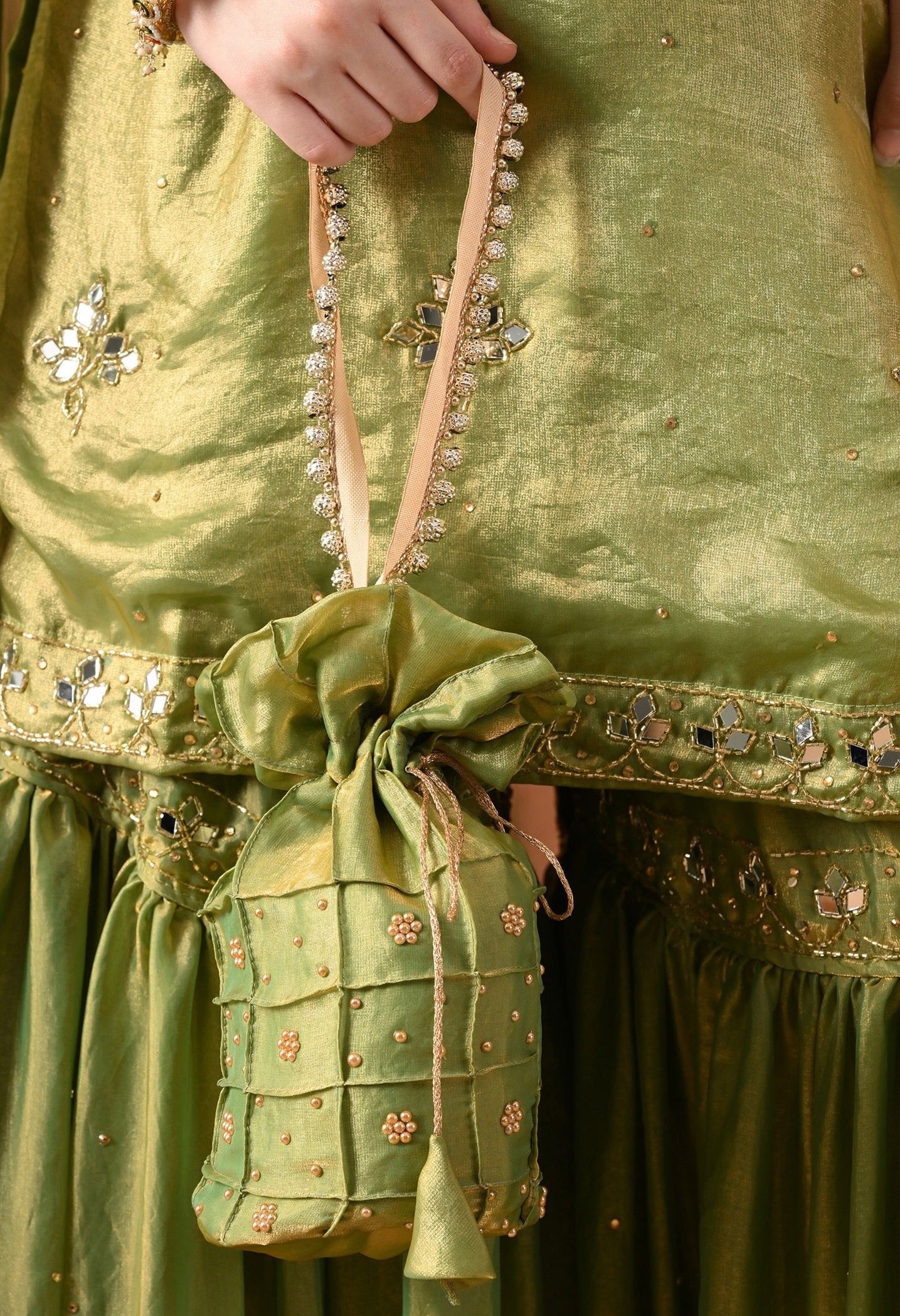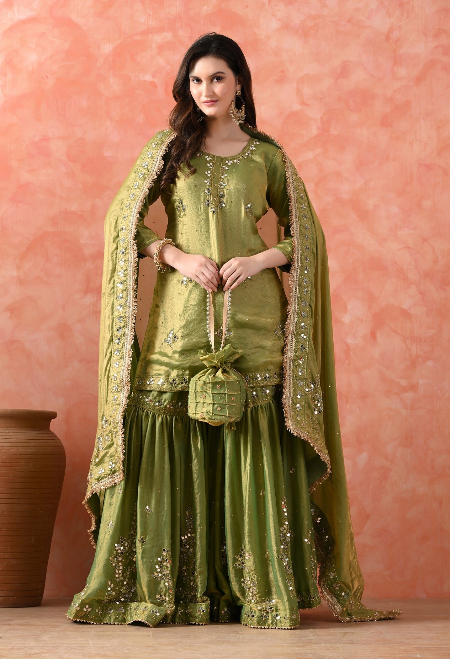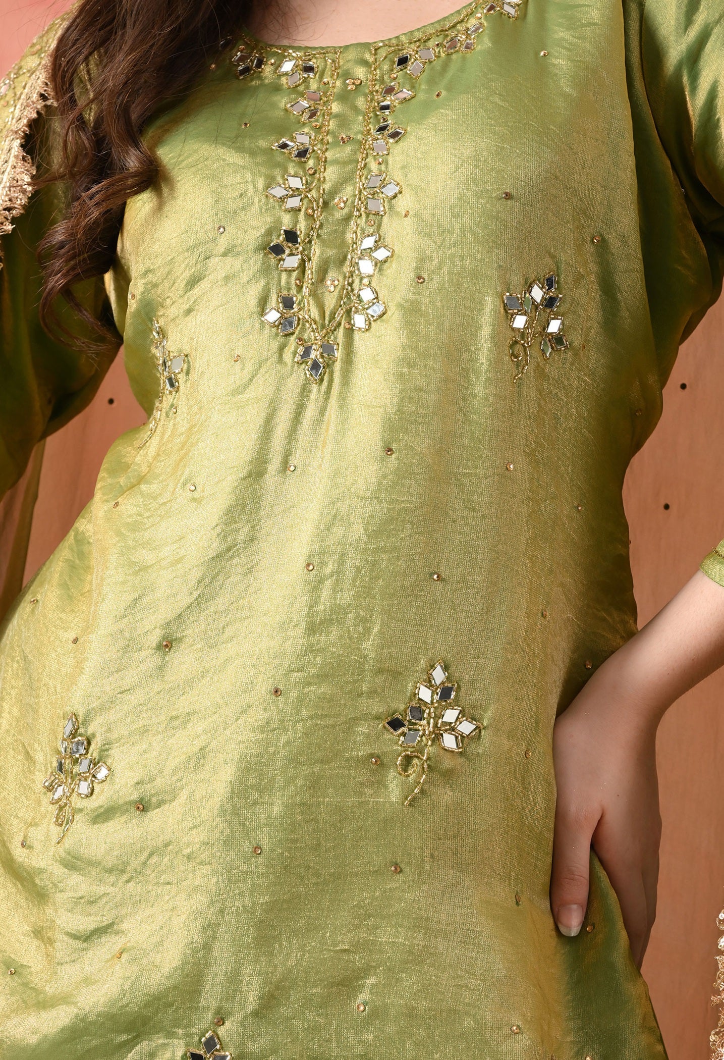 This green gharara set is made for grand celebrations — from mehndi to weddings. The kurti and dupatta are crafted in sheer glass silk that gives a soft, elegant glow, while the brocade gharara adds rich volume and texture. Hand-embroidered with mirrors and cutdana, it’s festive, graceful, and a complete head-turner. -