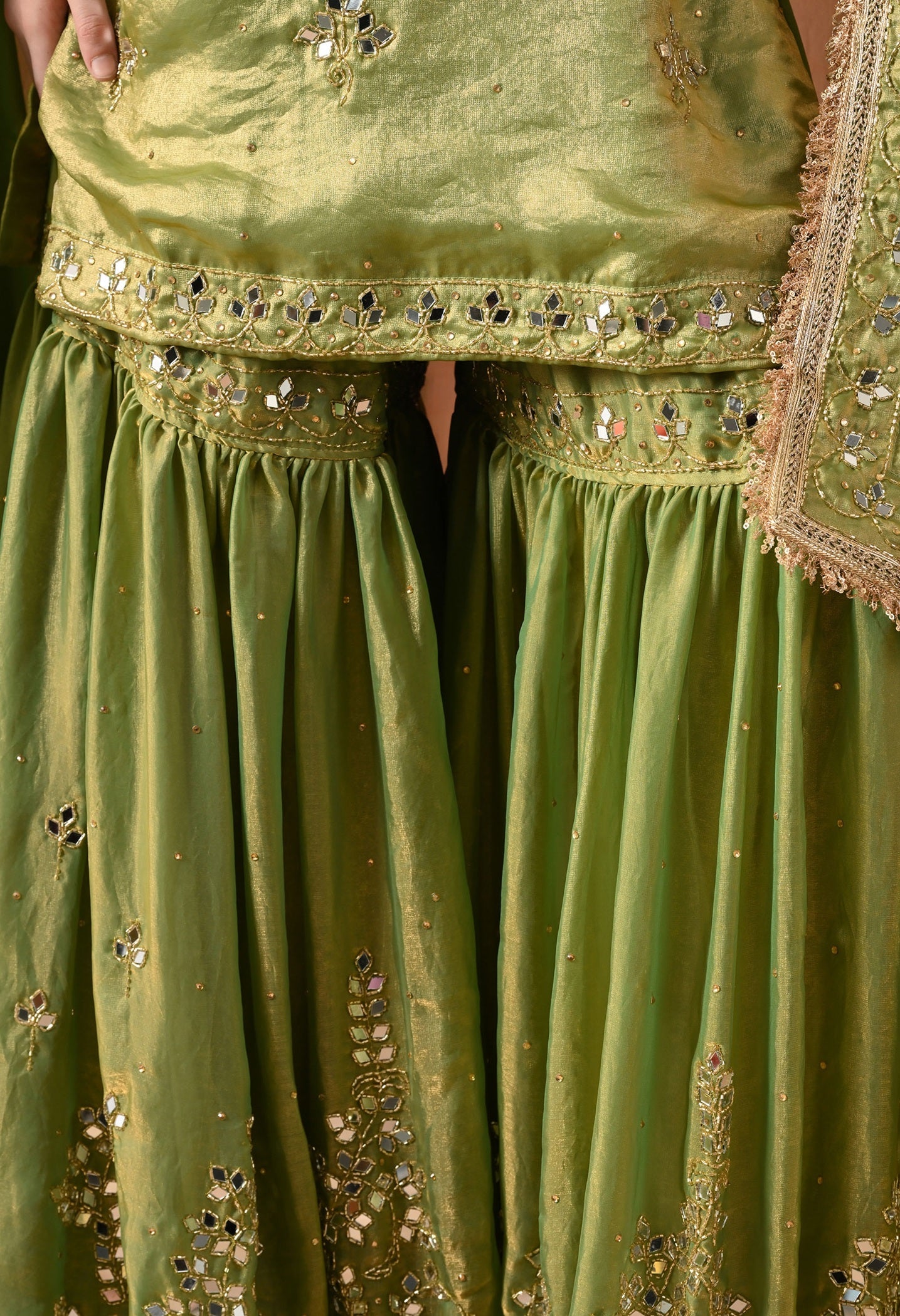 A festive green sharara set with glass silk kurti and dupatta, and brocade gharara. Embellished with fine mirror and cutdana handwork.