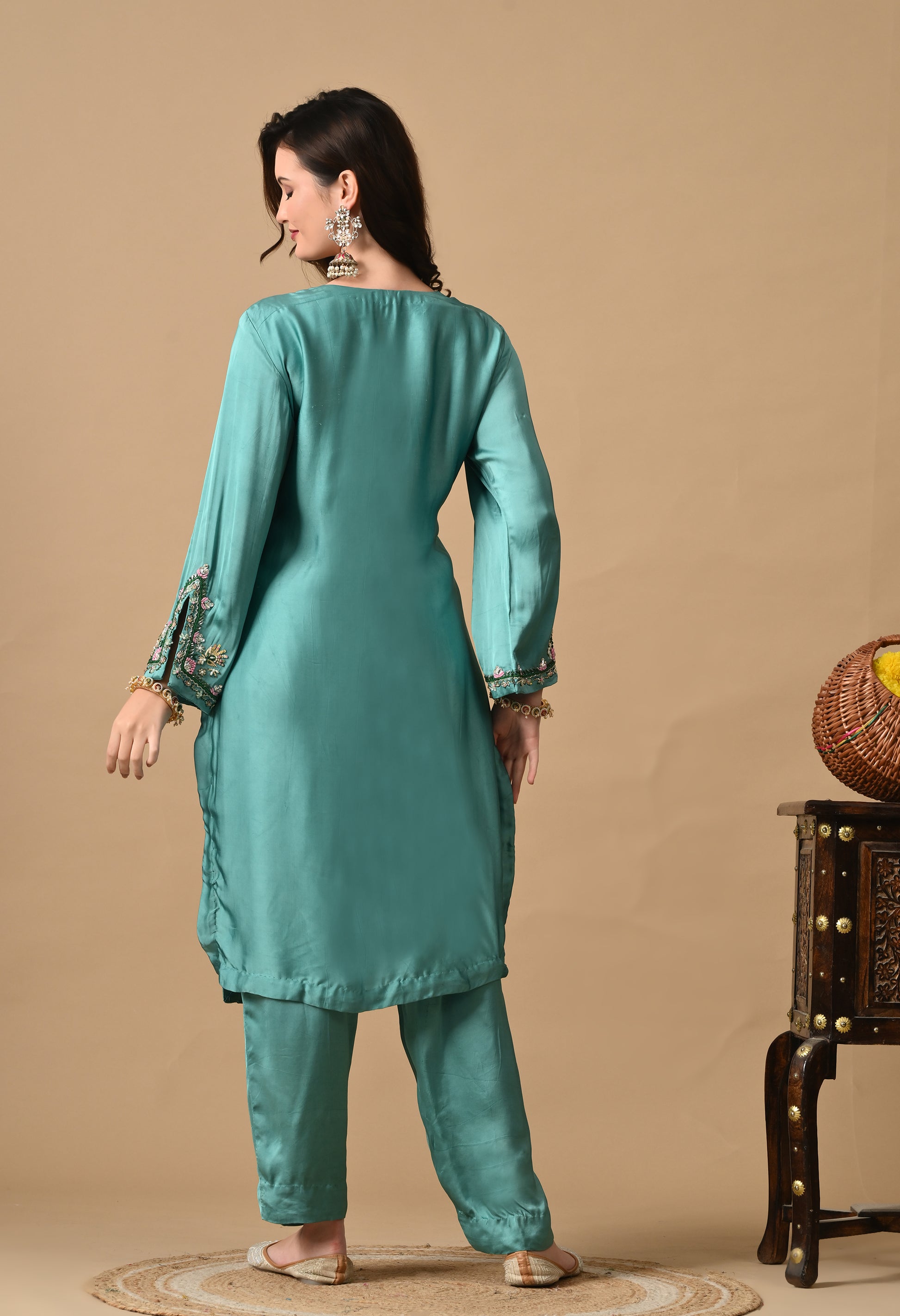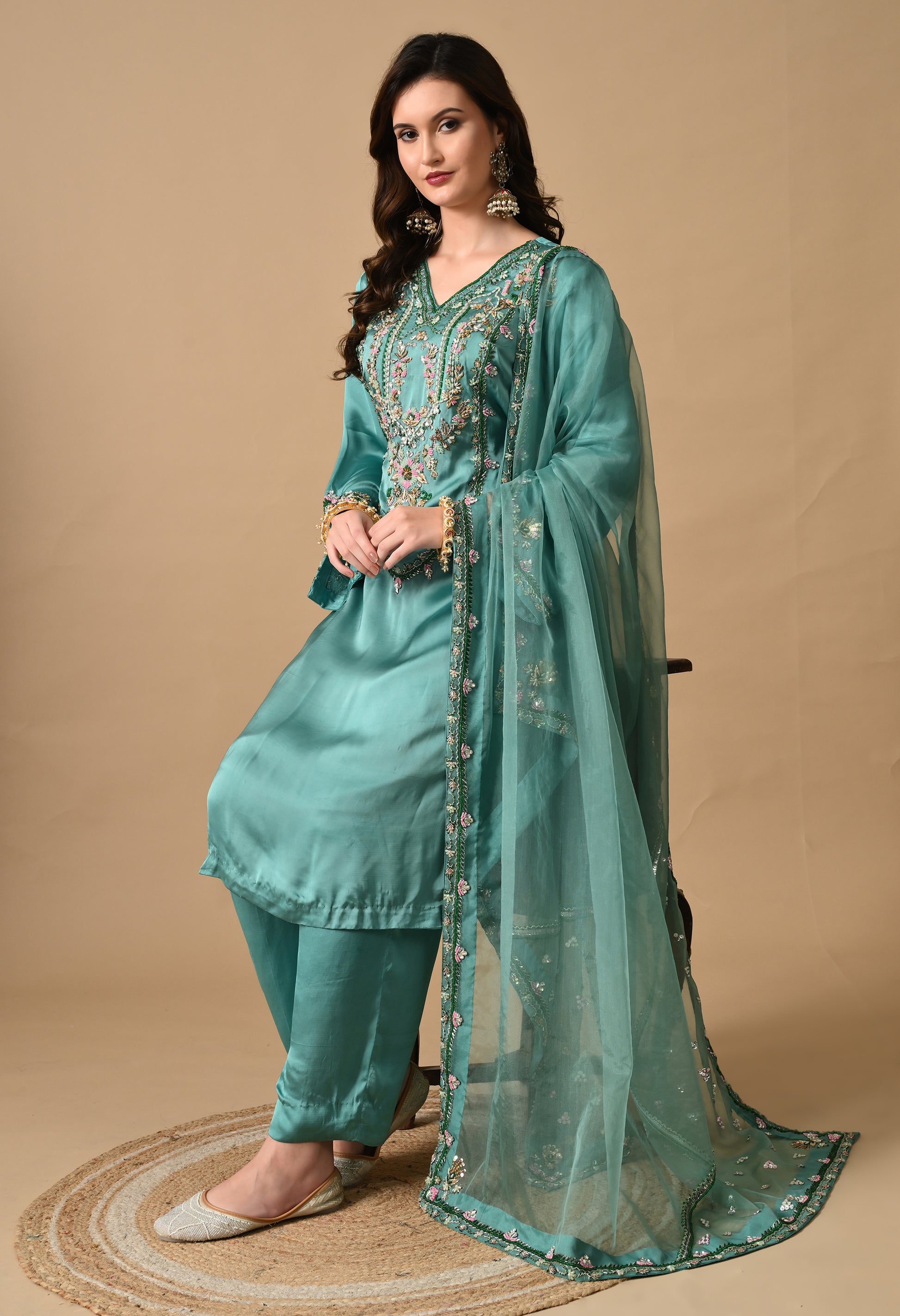 Crafted in satin silk, this green kurta set dazzles with zardozi, pearls, and sequins. A luxurious pick for parties and cultural celebrations.