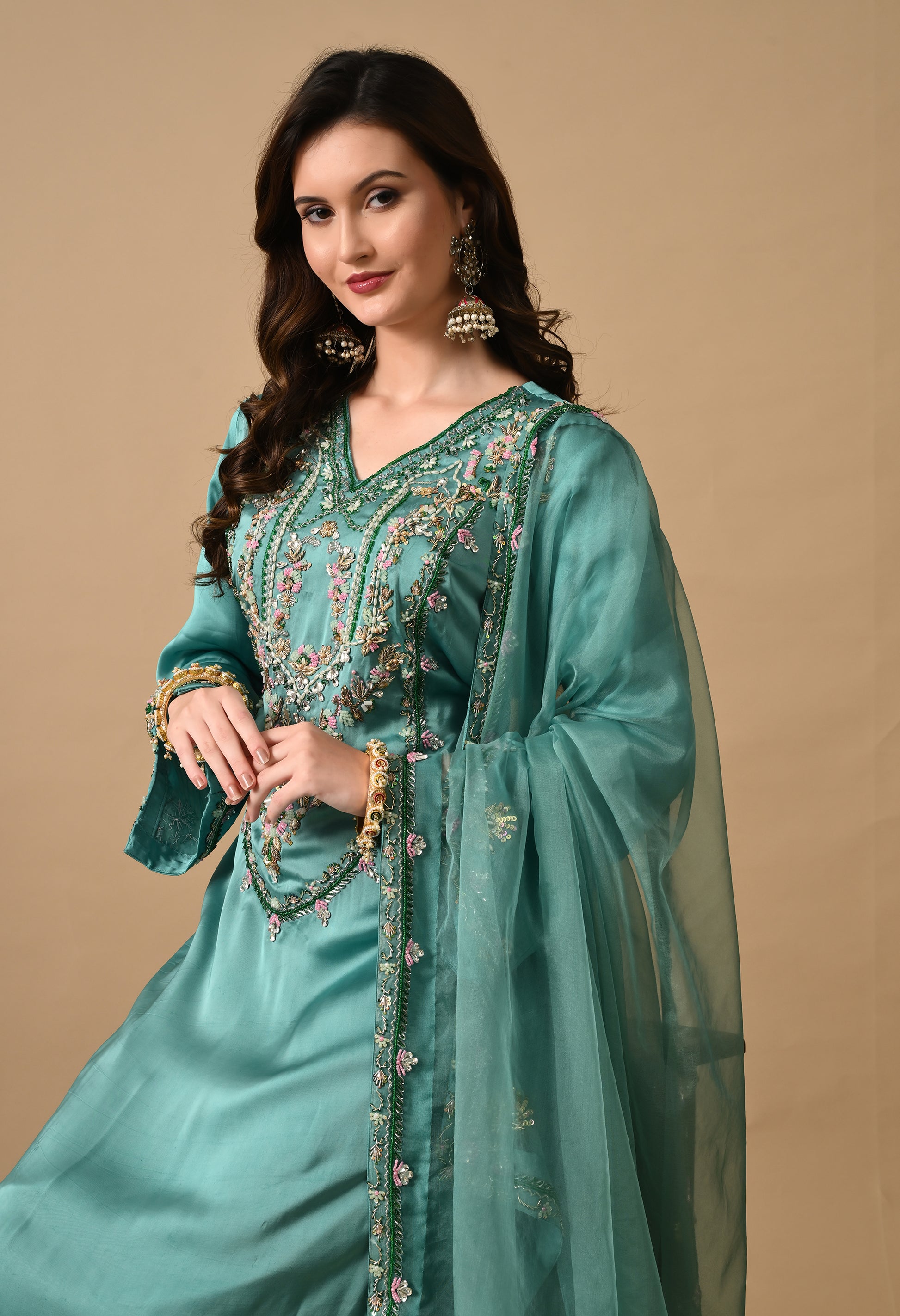 Green Satin Silk Kurta Set with Zardozi and Pearls