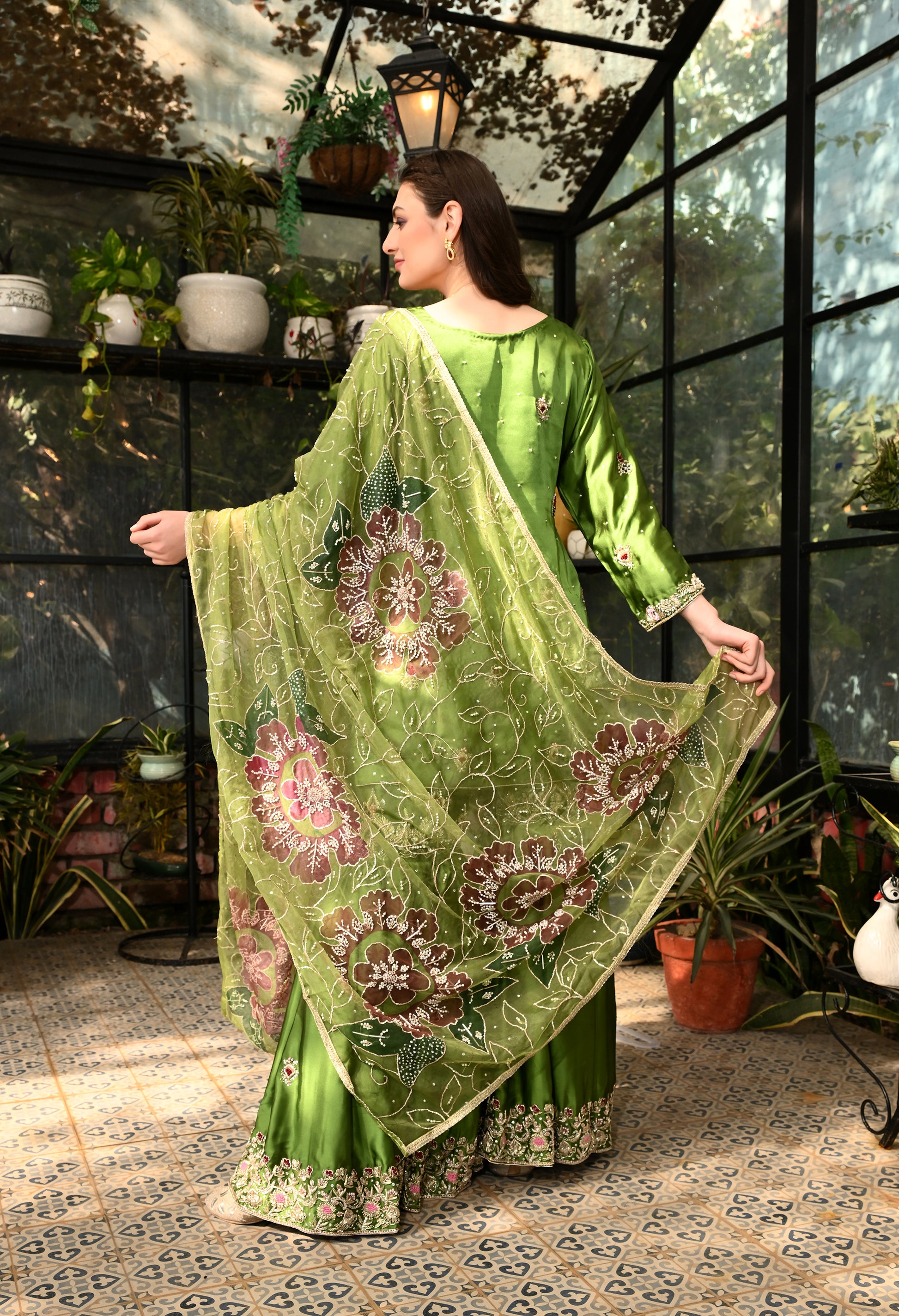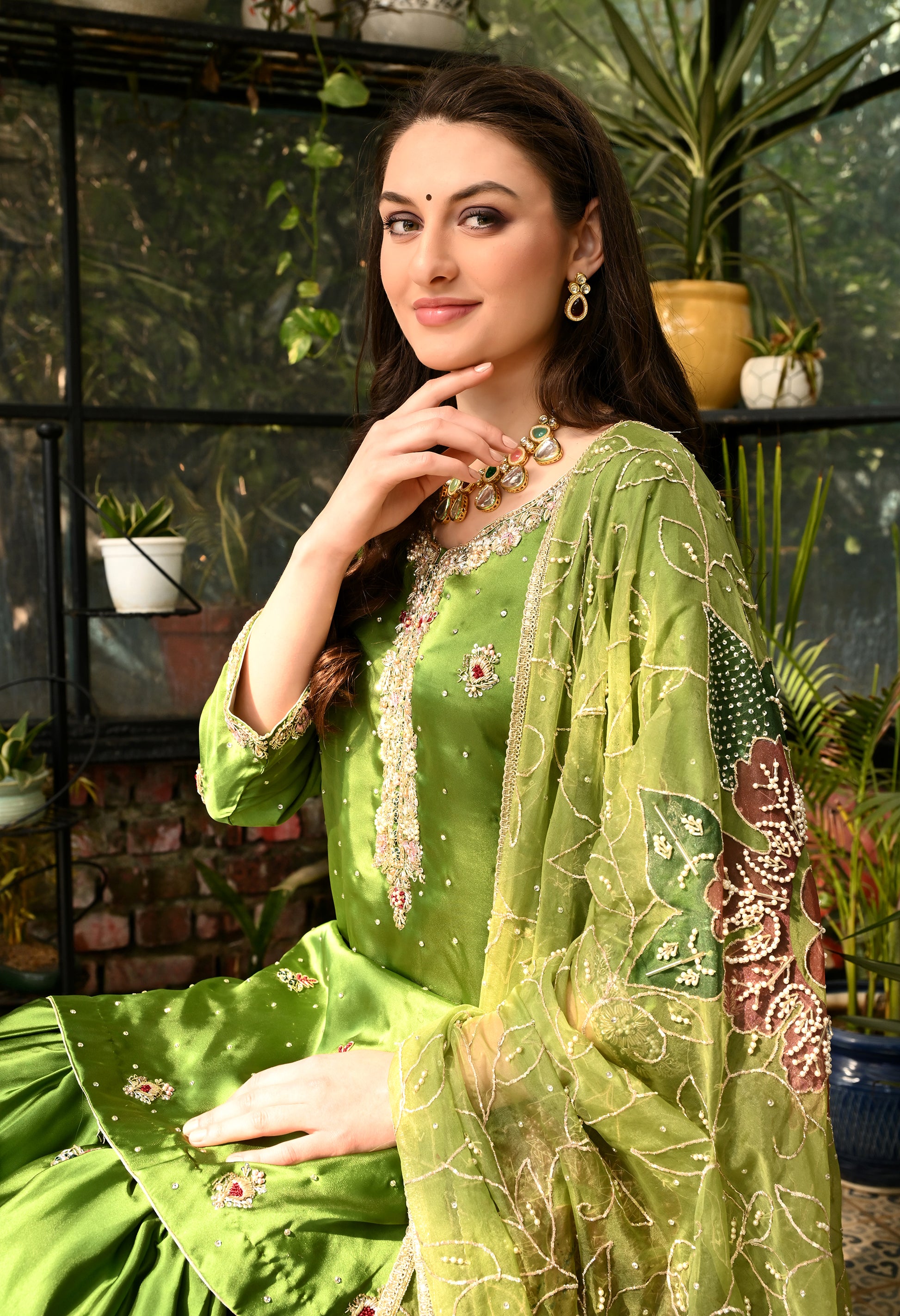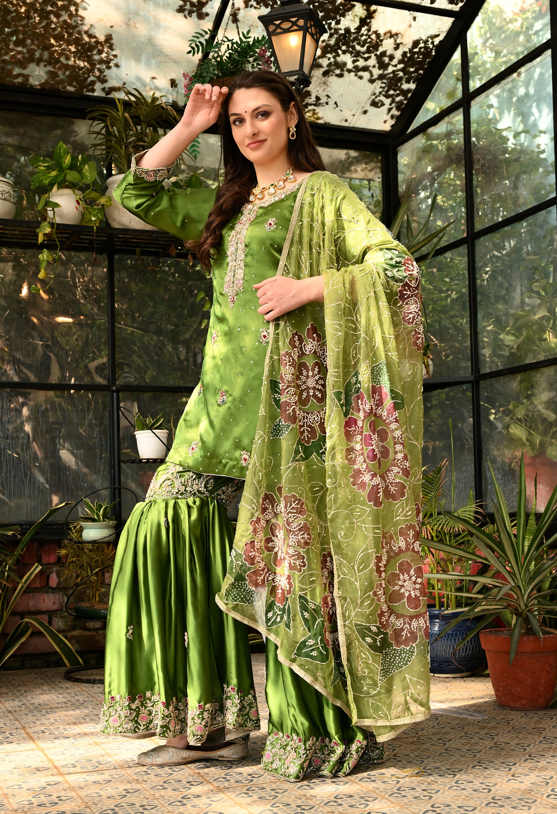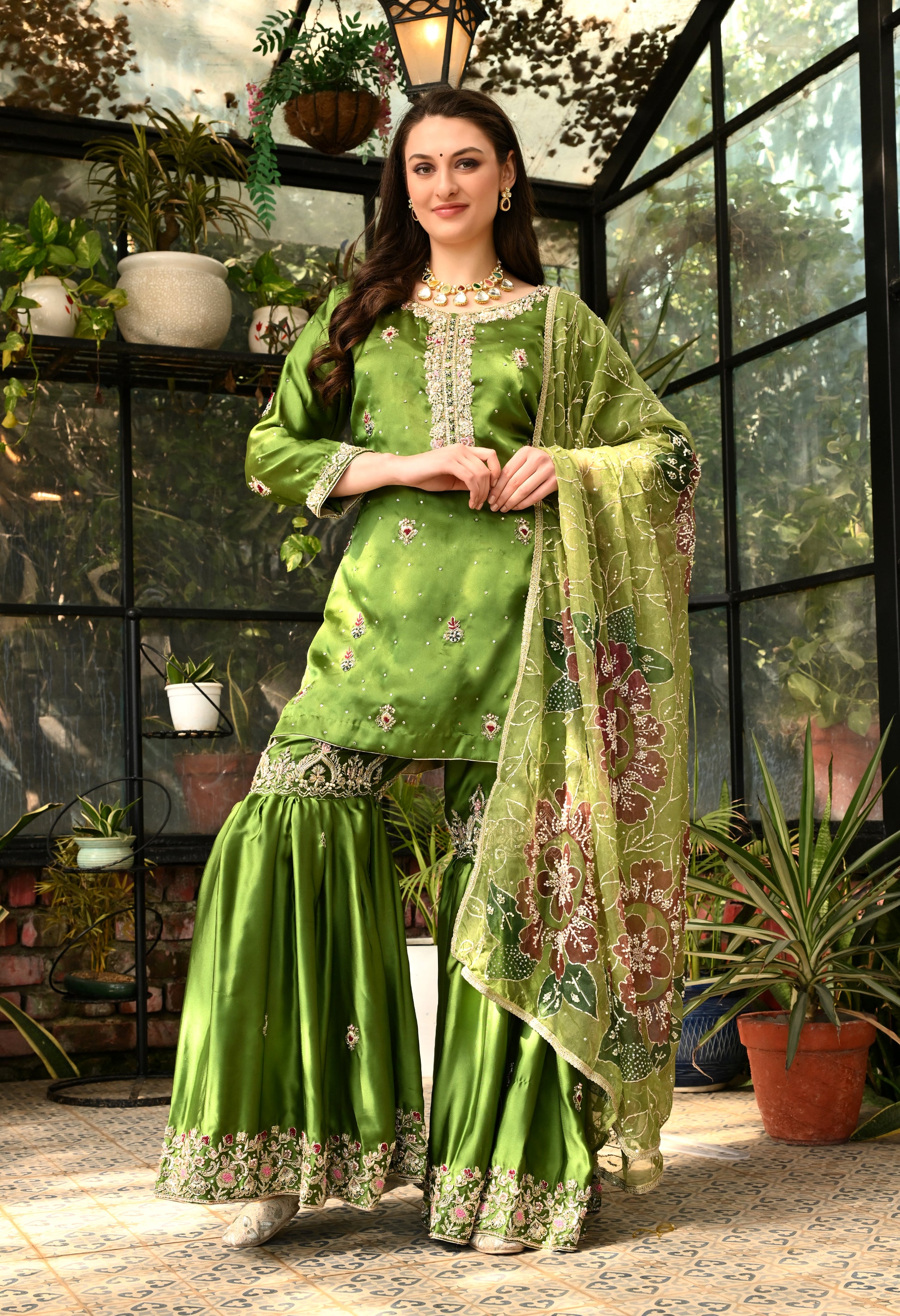 Green Silk Gharara Set with Zardozi & Cutdana Embroidery