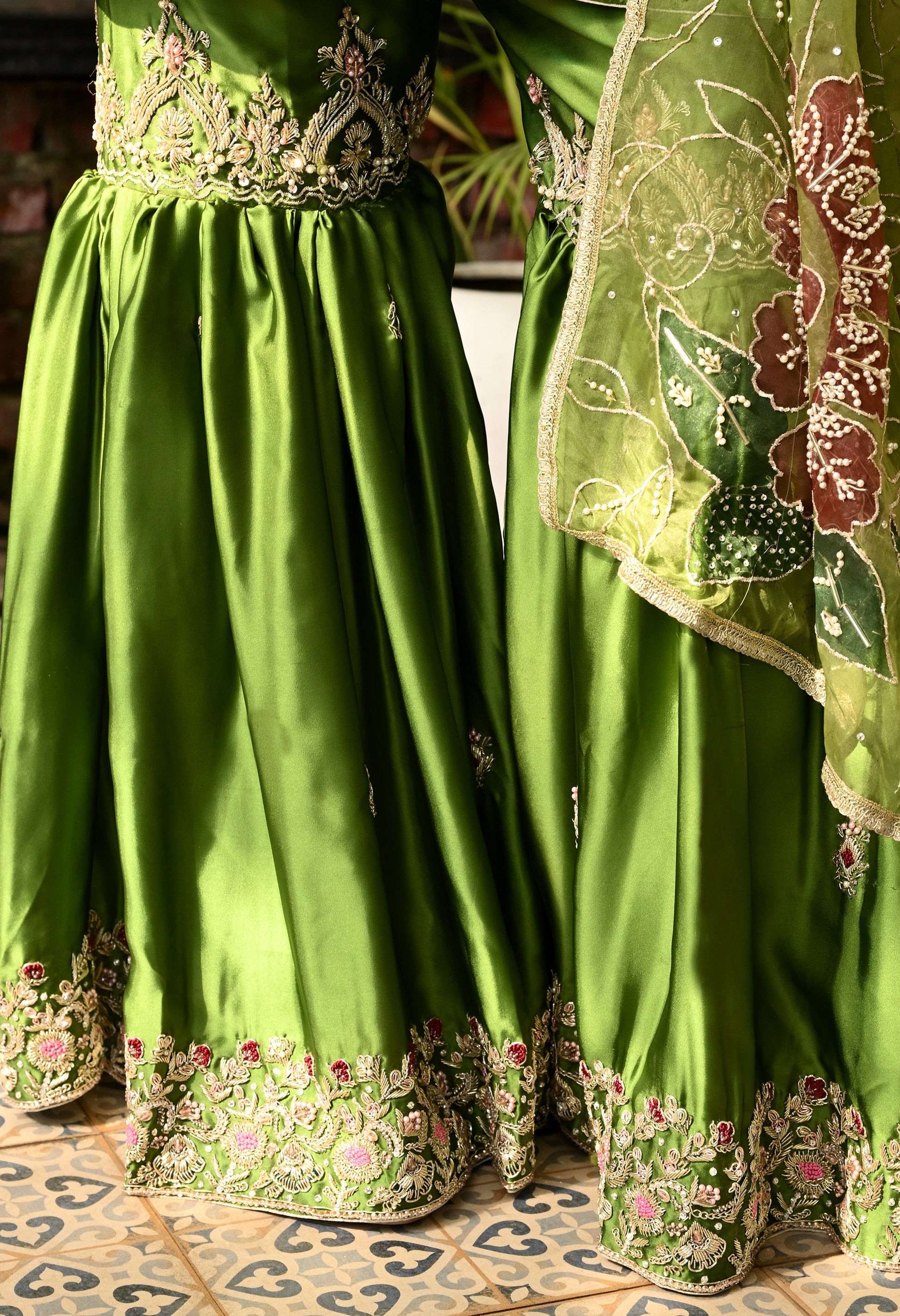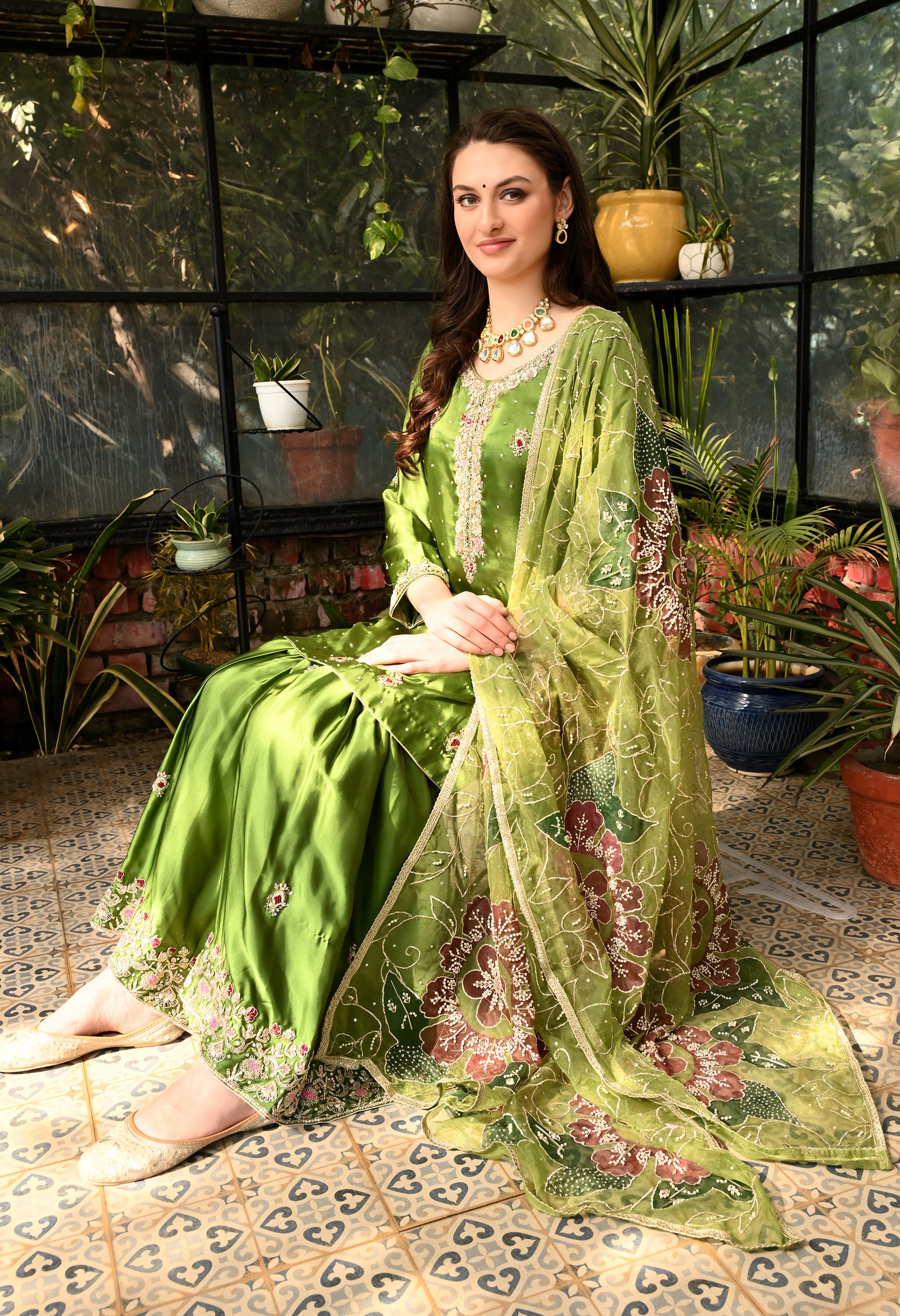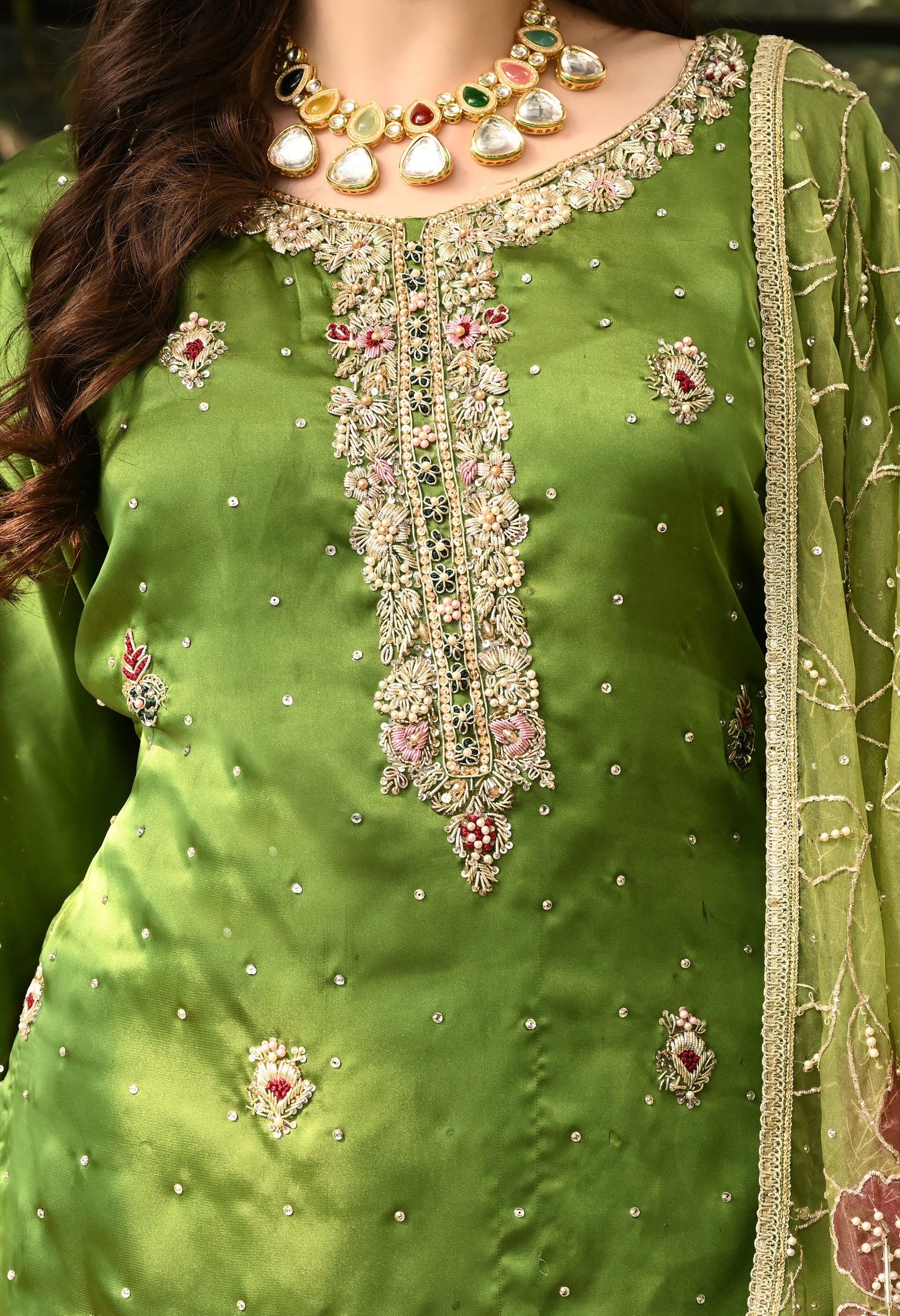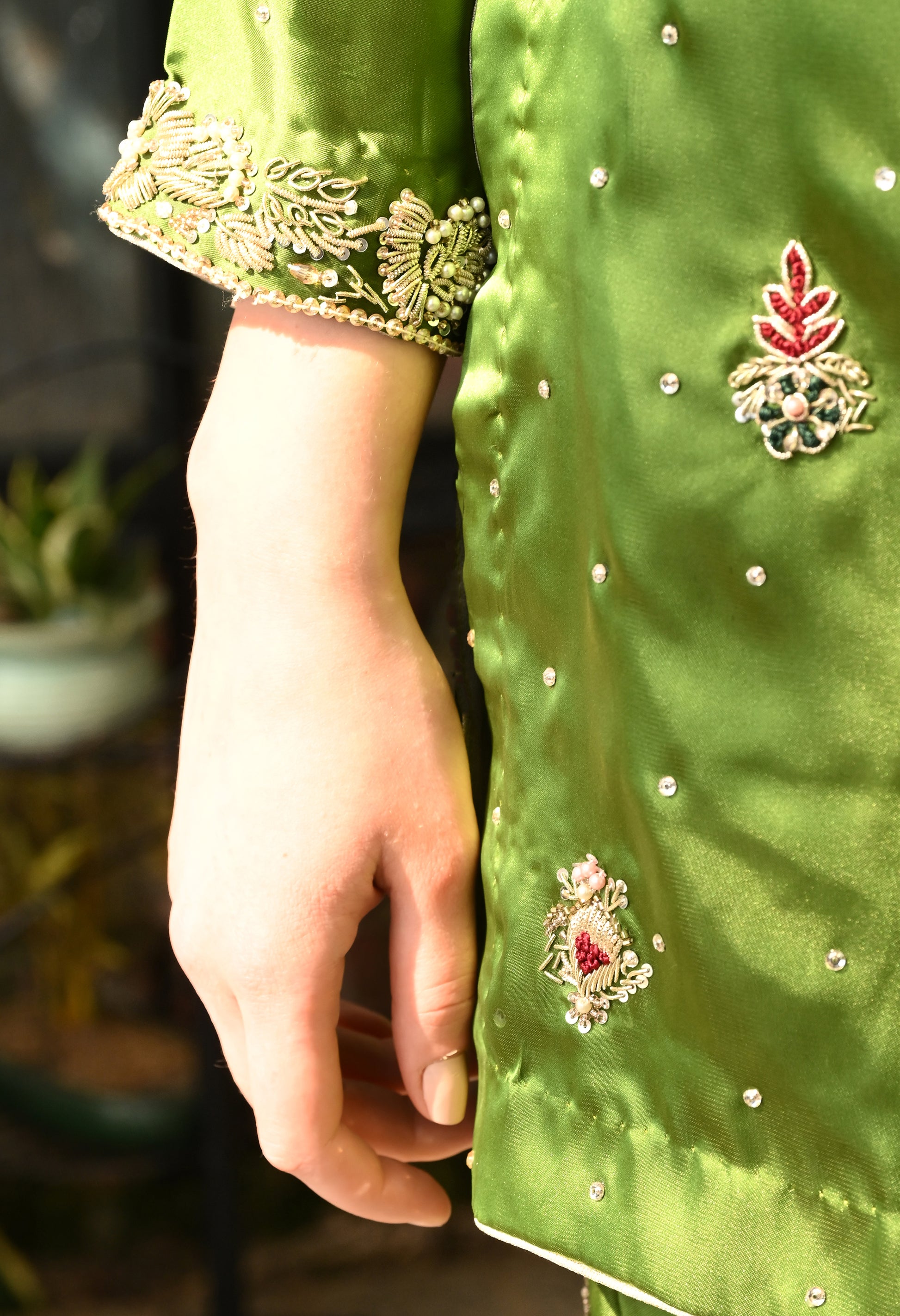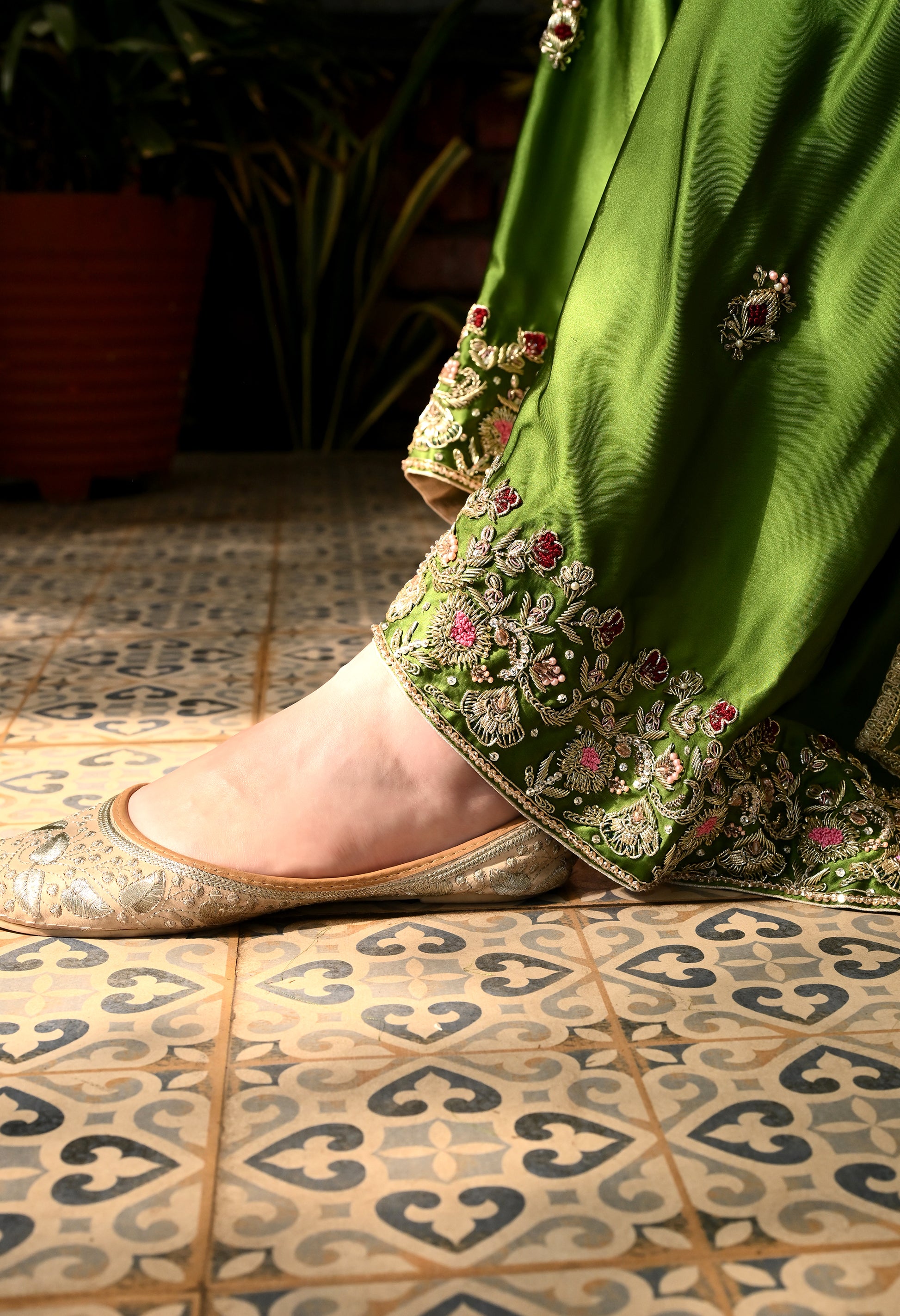 Green Silk Gharara Set with Zardozi & Cutdana Embroidery