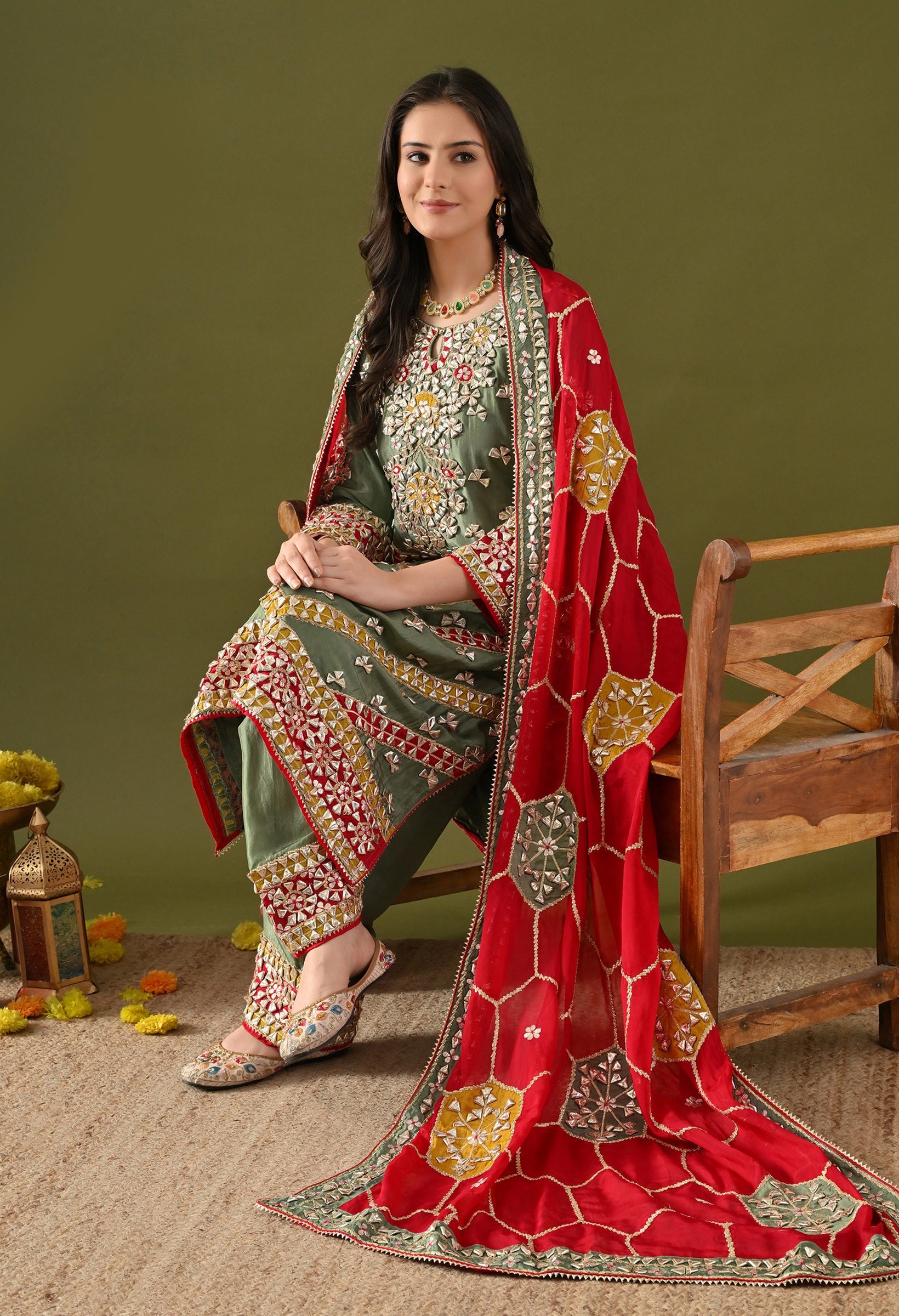 Green kurta set in tissue silk with an organza dupatta and farshi salwar, finished with delicate gotta and applique detailing. Perfect for mehndi and festive celebrations.