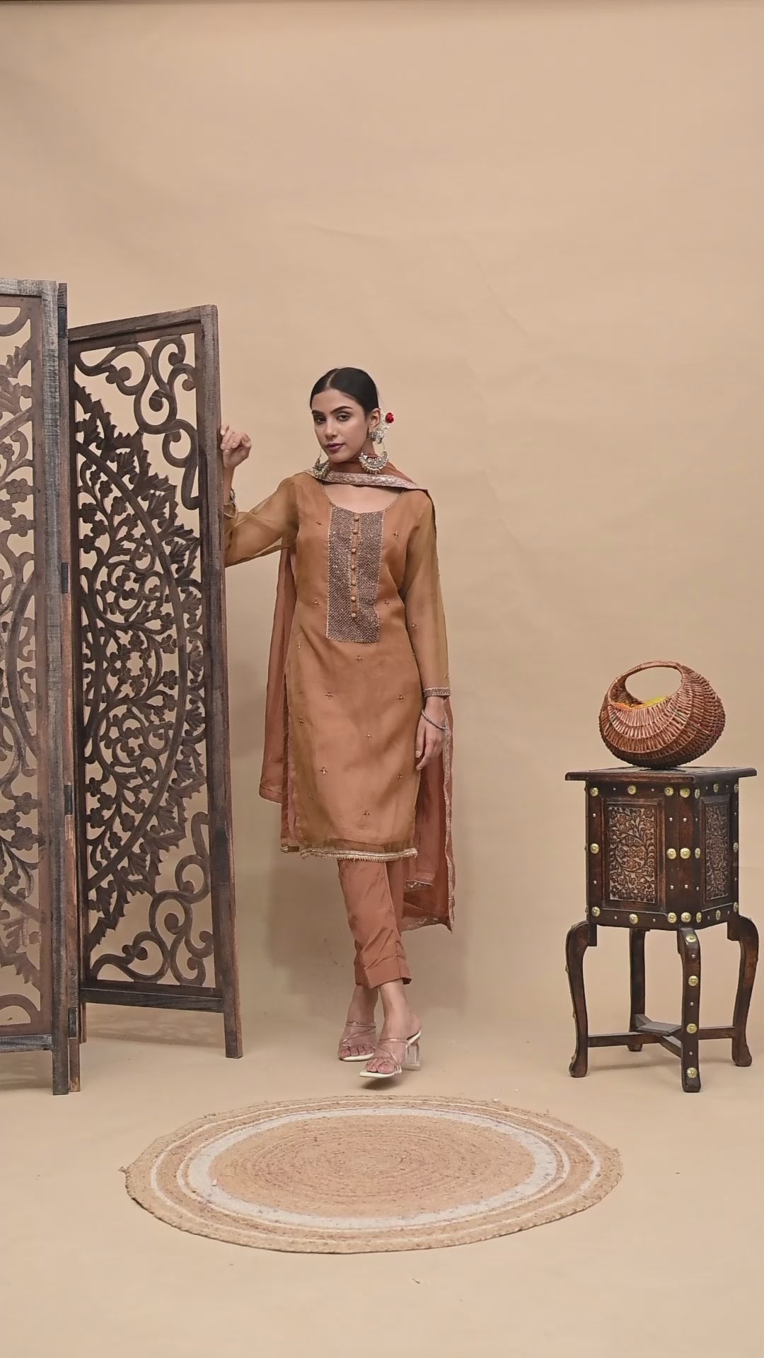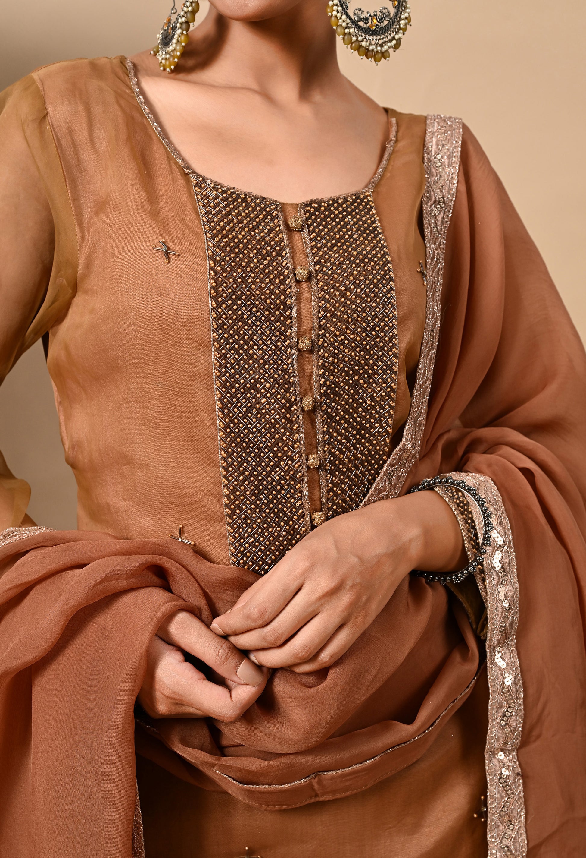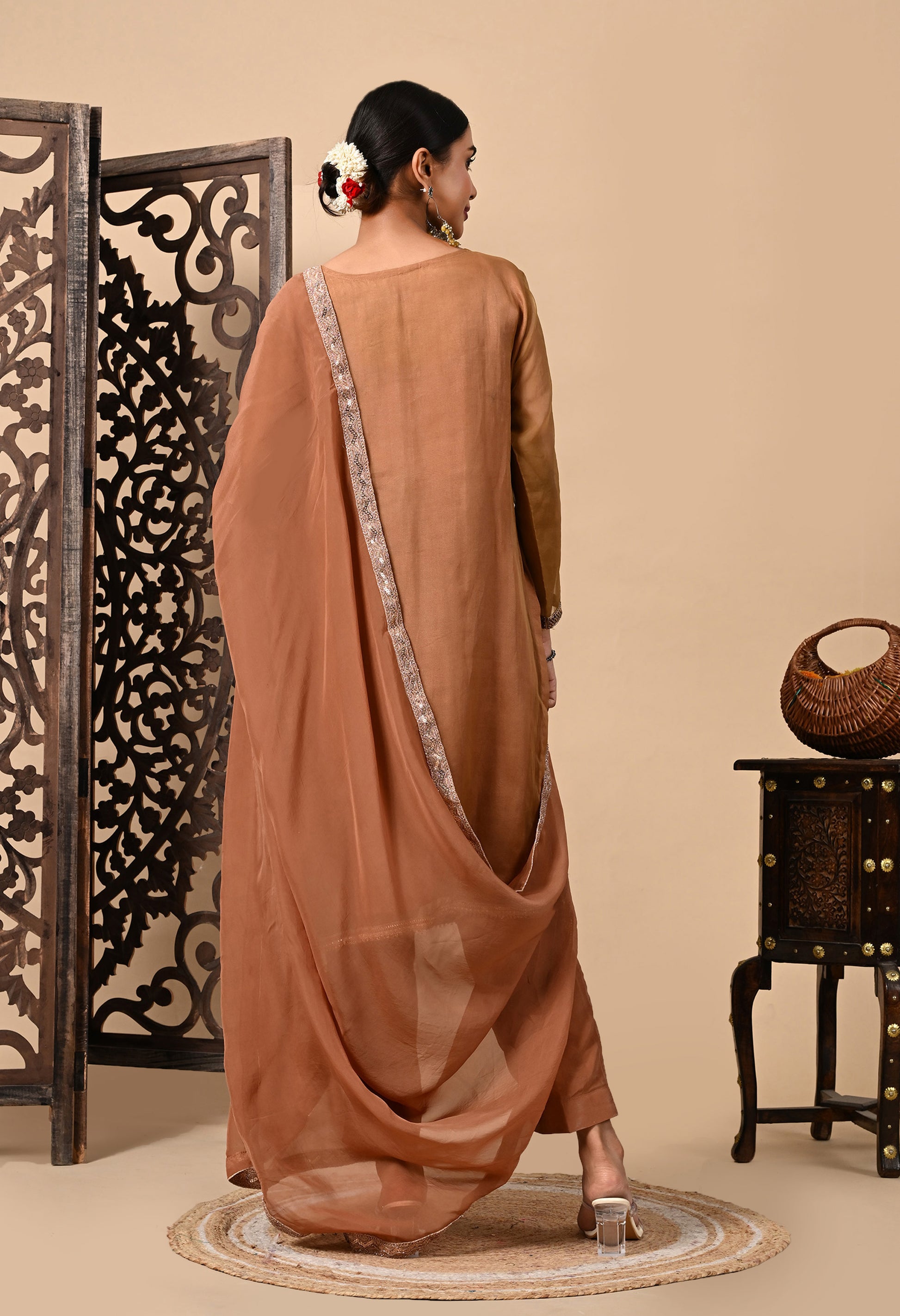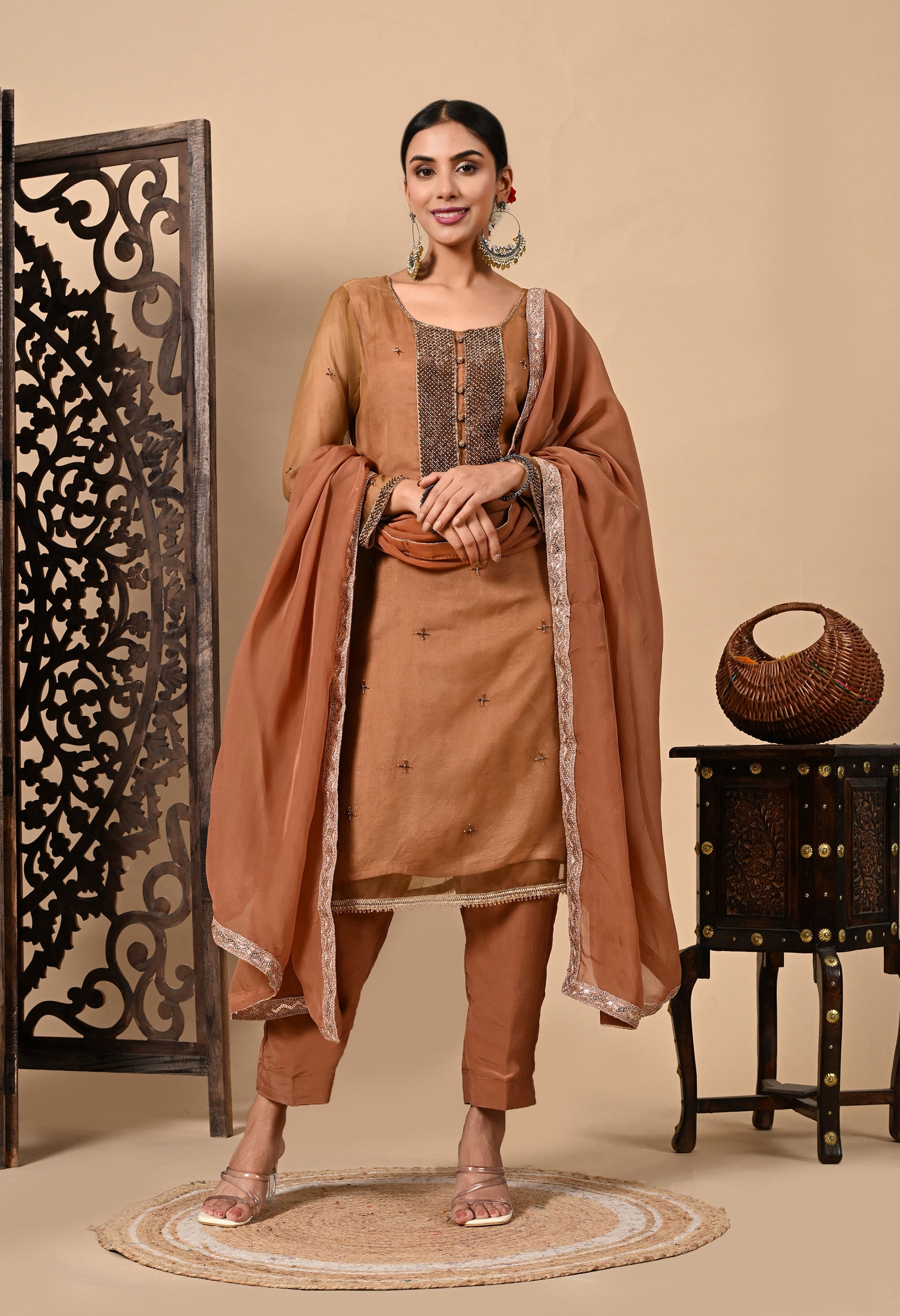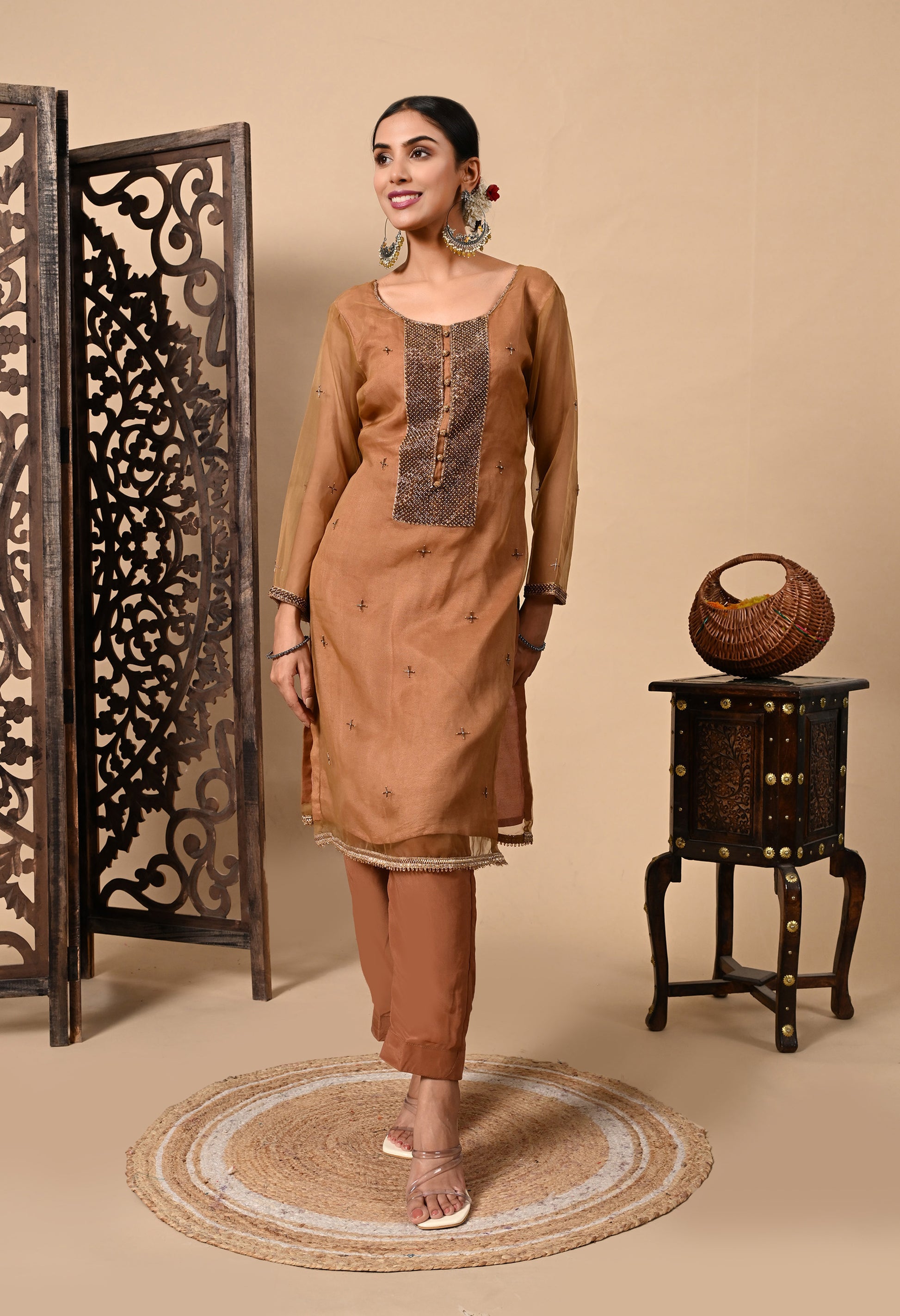 Showcase your style in our greenish brown shade Kurta Set, perfectly matched with a flowy organza dupatta, a detailed and perfectly embroidered organza kurta, and a coordinating crepe bottom. The zardozi, cutdana, and pearl adornments give it an ageless elegance.