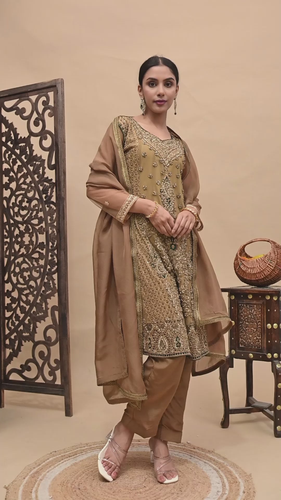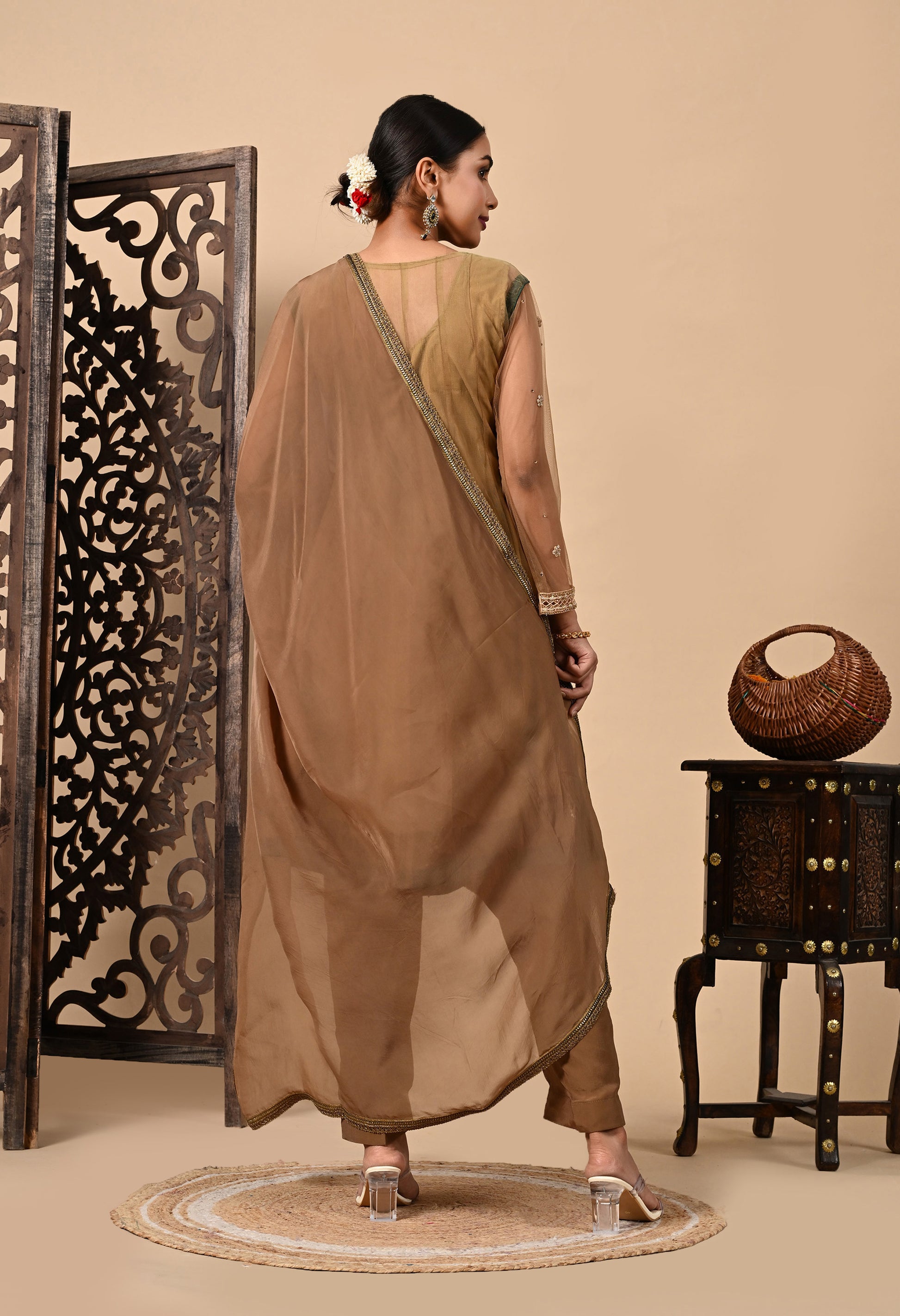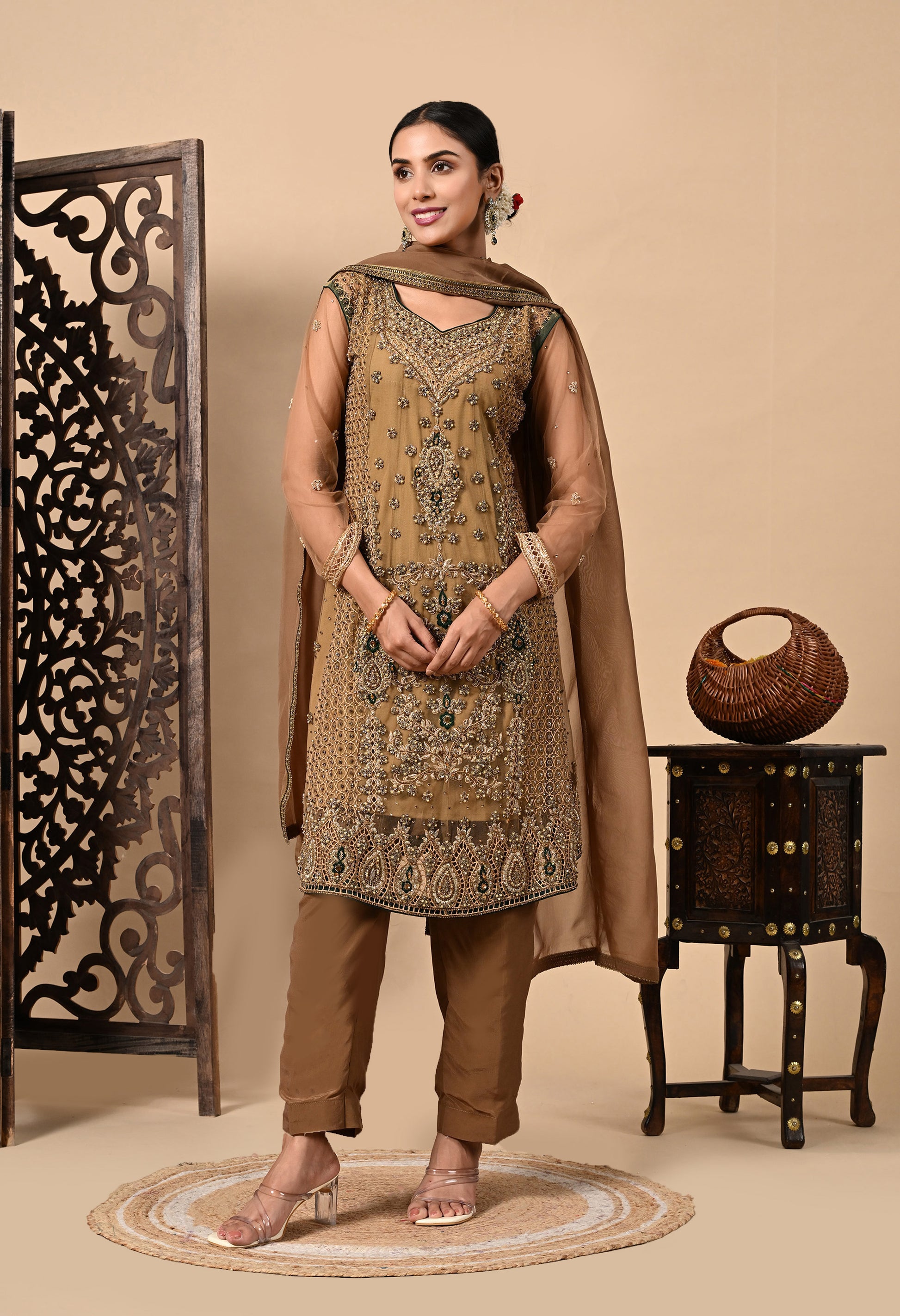 Greenish Brown Kurta Set with Zardozi, Dabka, Sequin, and Pearl Work