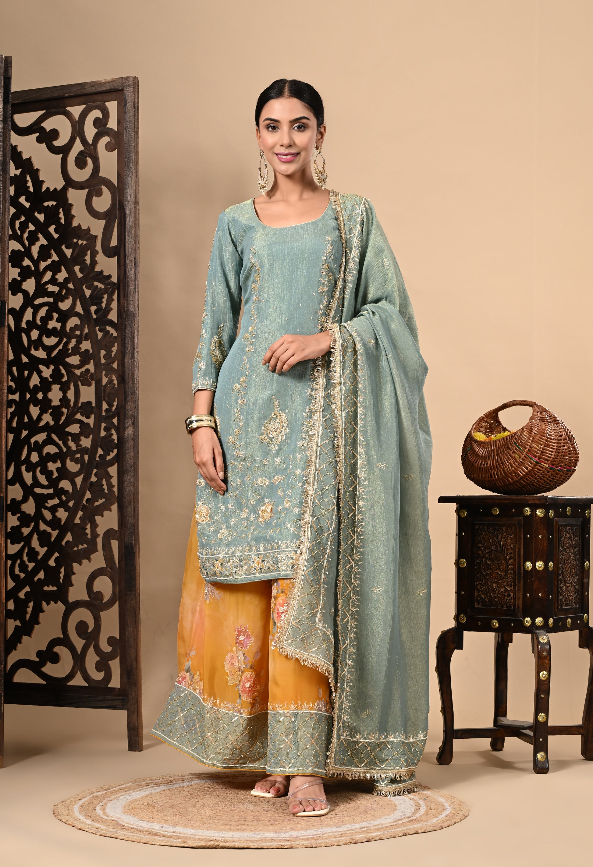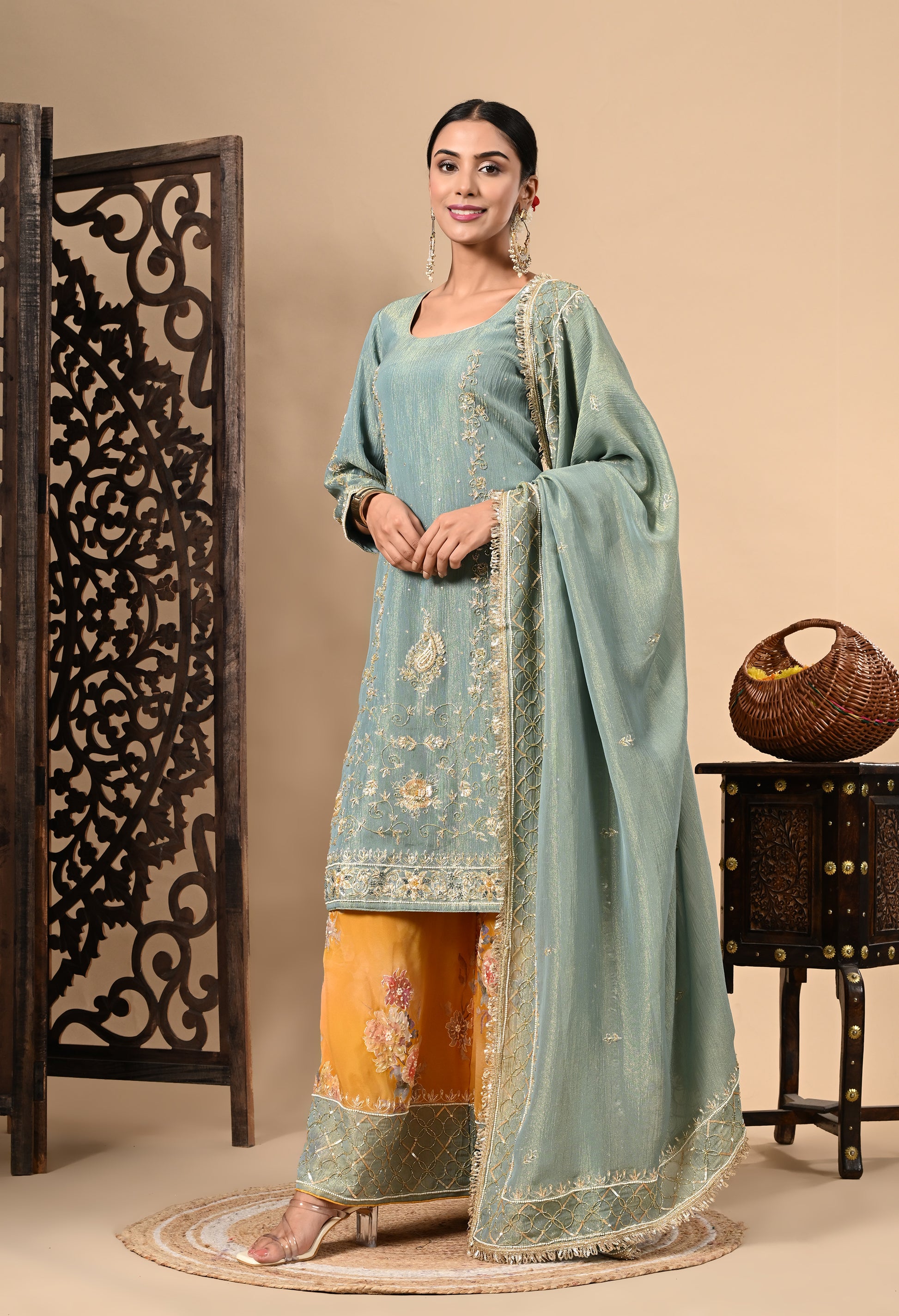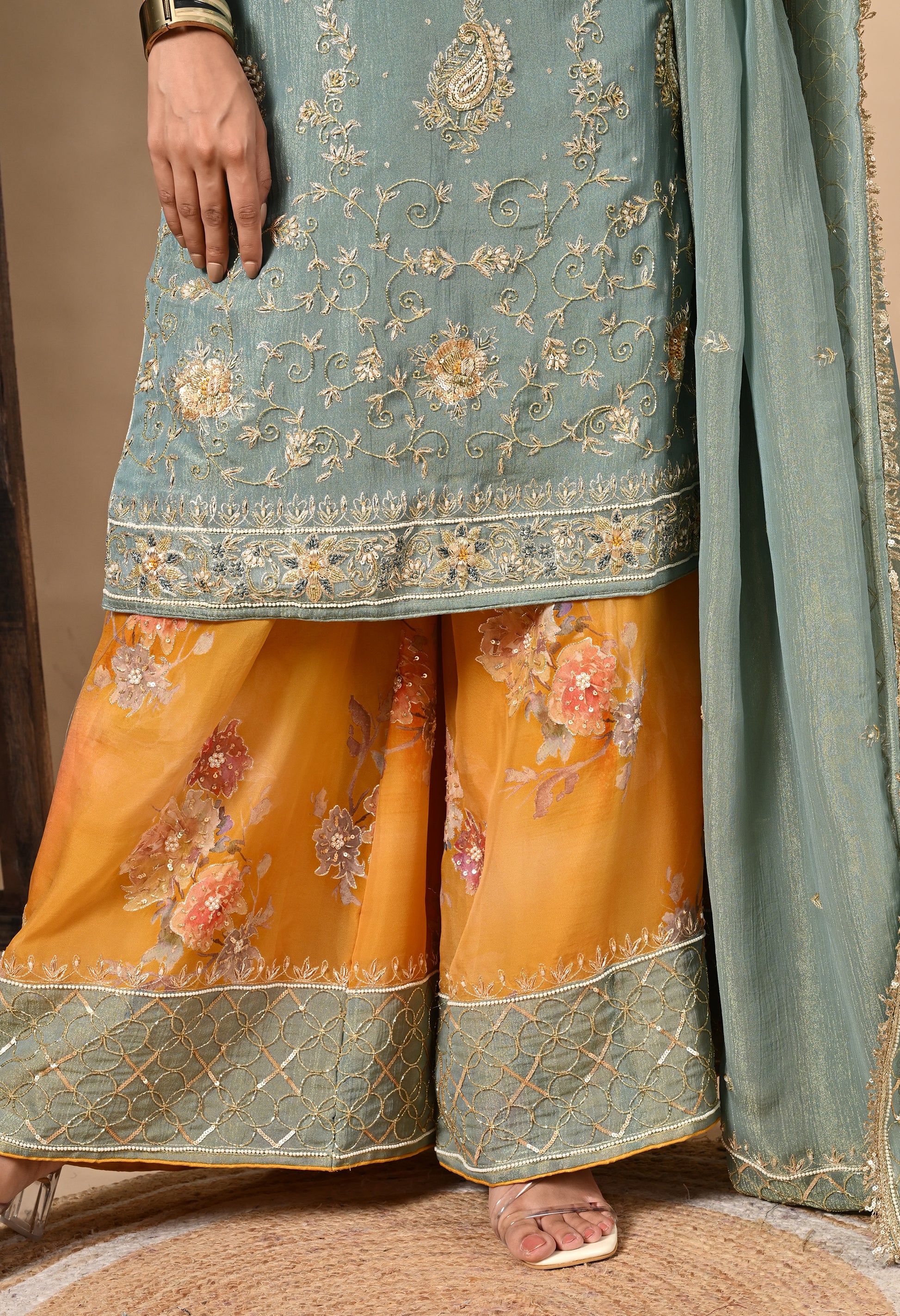 Embody timeless beauty with our grey and yellow Sharara Set, featuring a sheer crushed tissue dupatta, a richly designed grey crushed tissue kurta, and a coordinated yellow printed crepe sharara. The intricate embellishments of zardozi, dabka, sequin, and thread elevate its elegance.