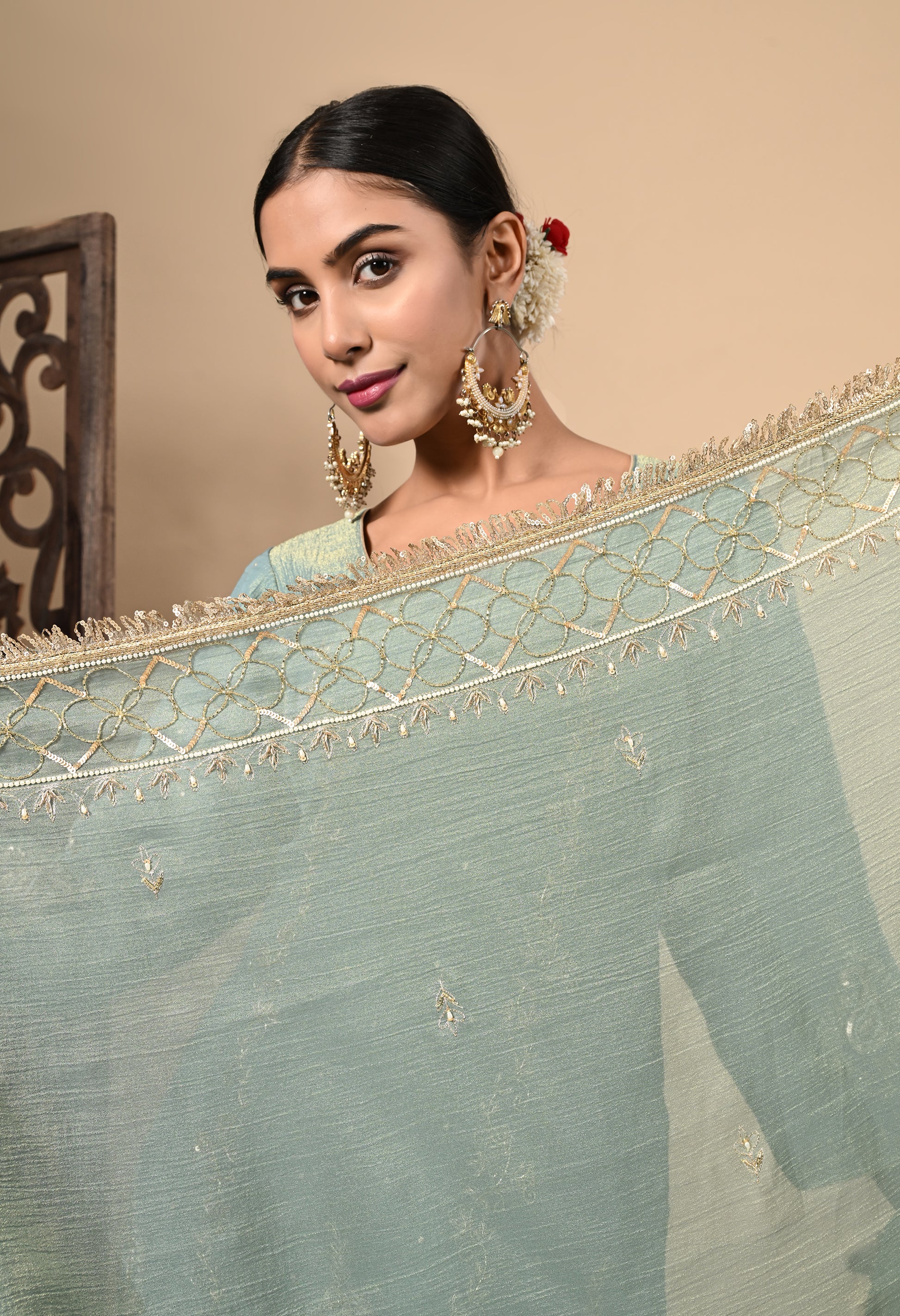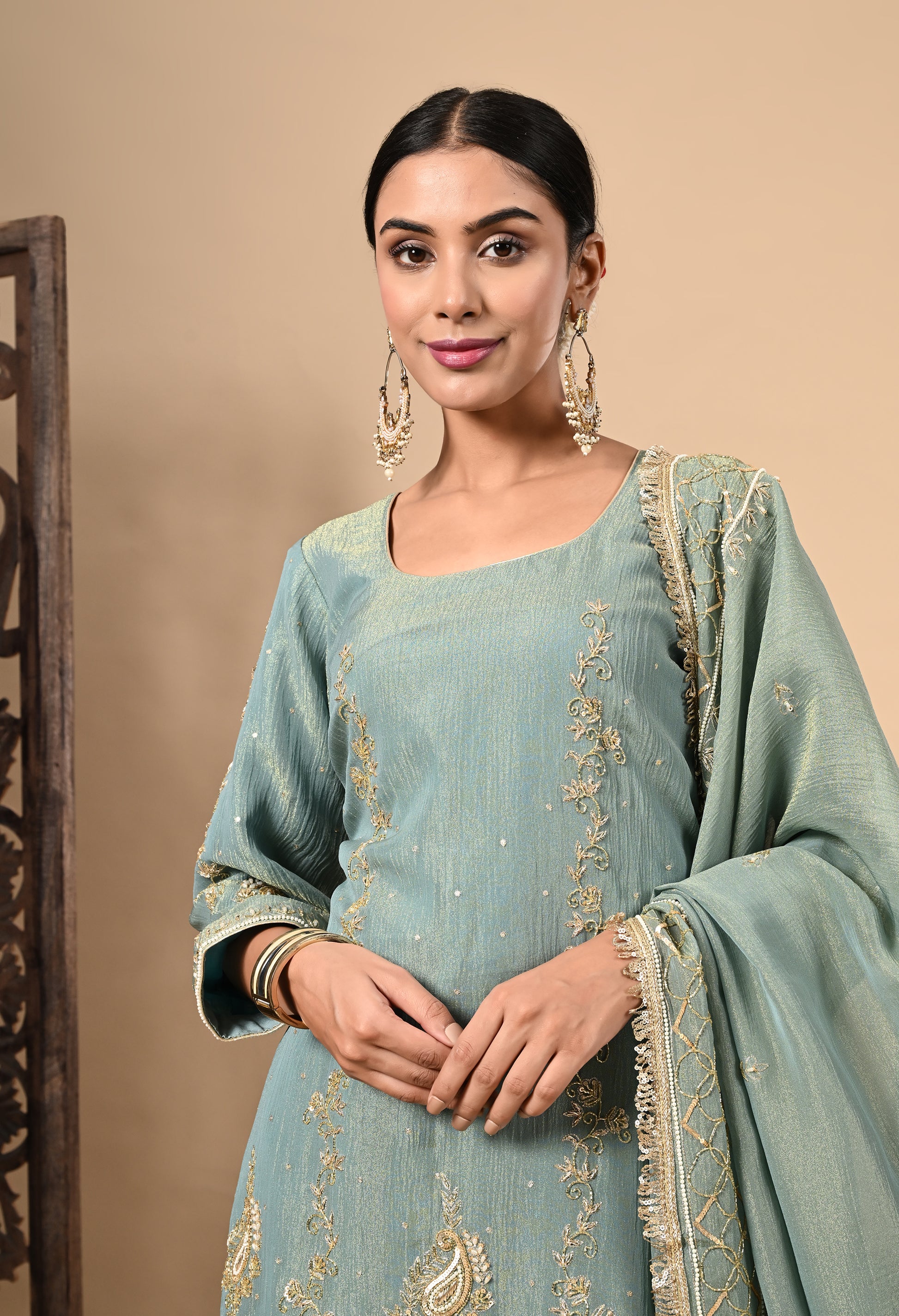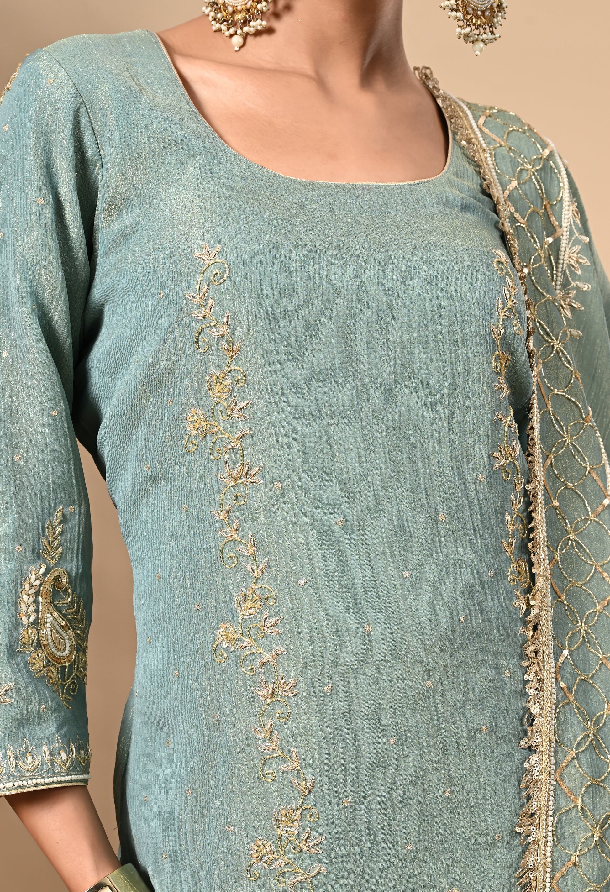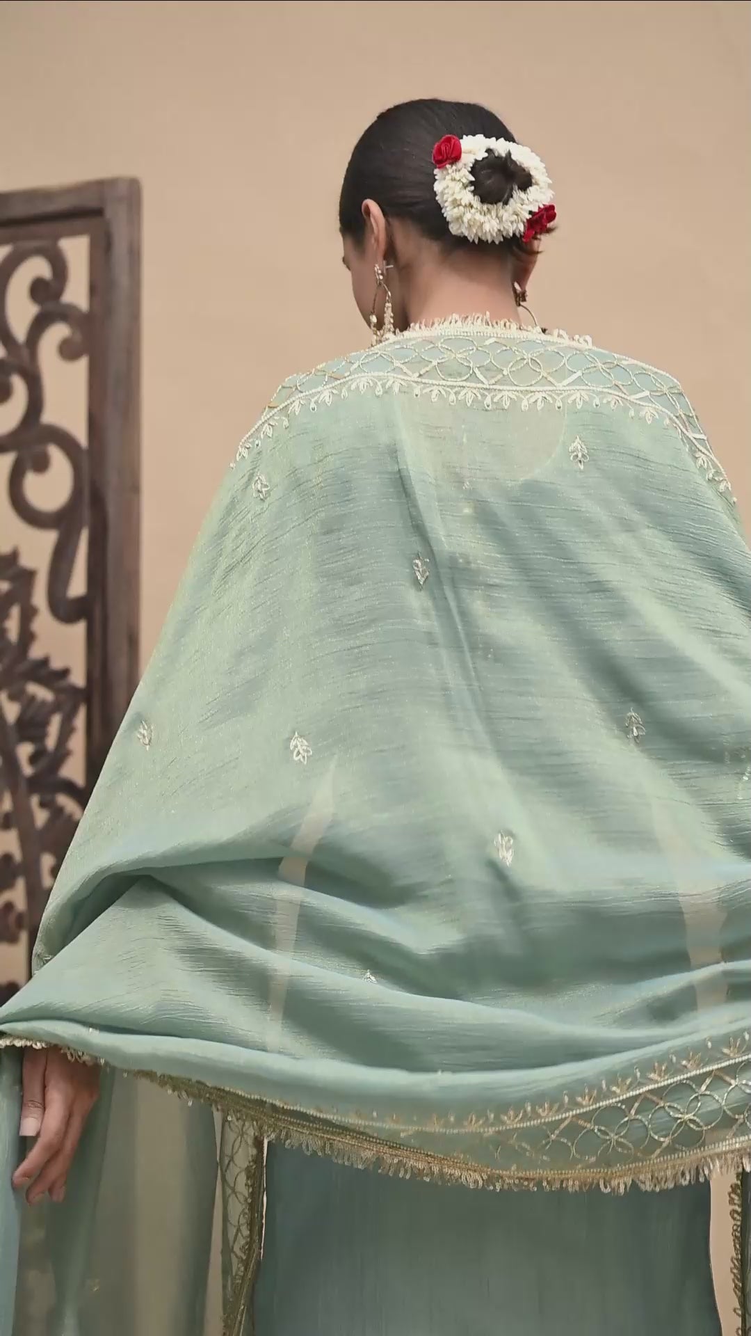 - Astonishing zardozi, dabka, sequence, and pearl work on the crushed tissue Kurta and Sleeves.