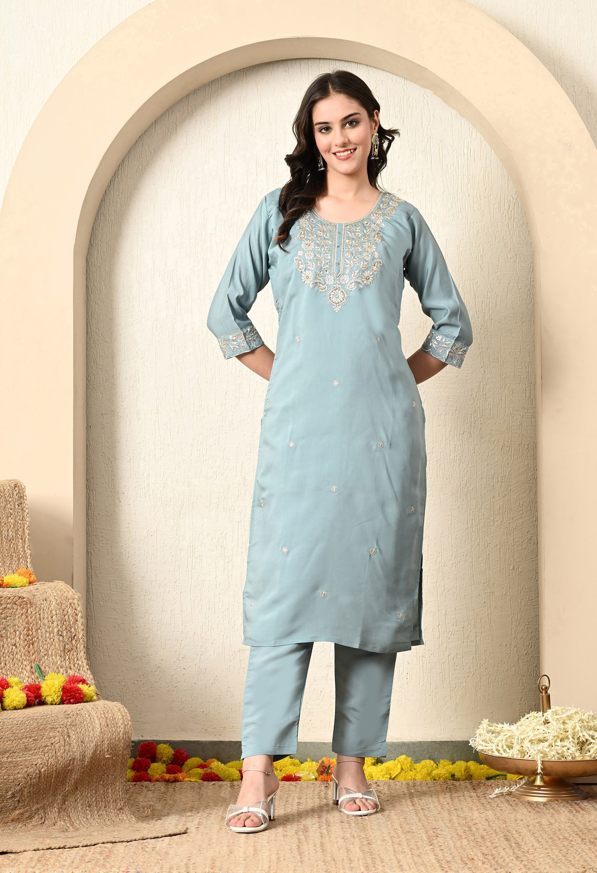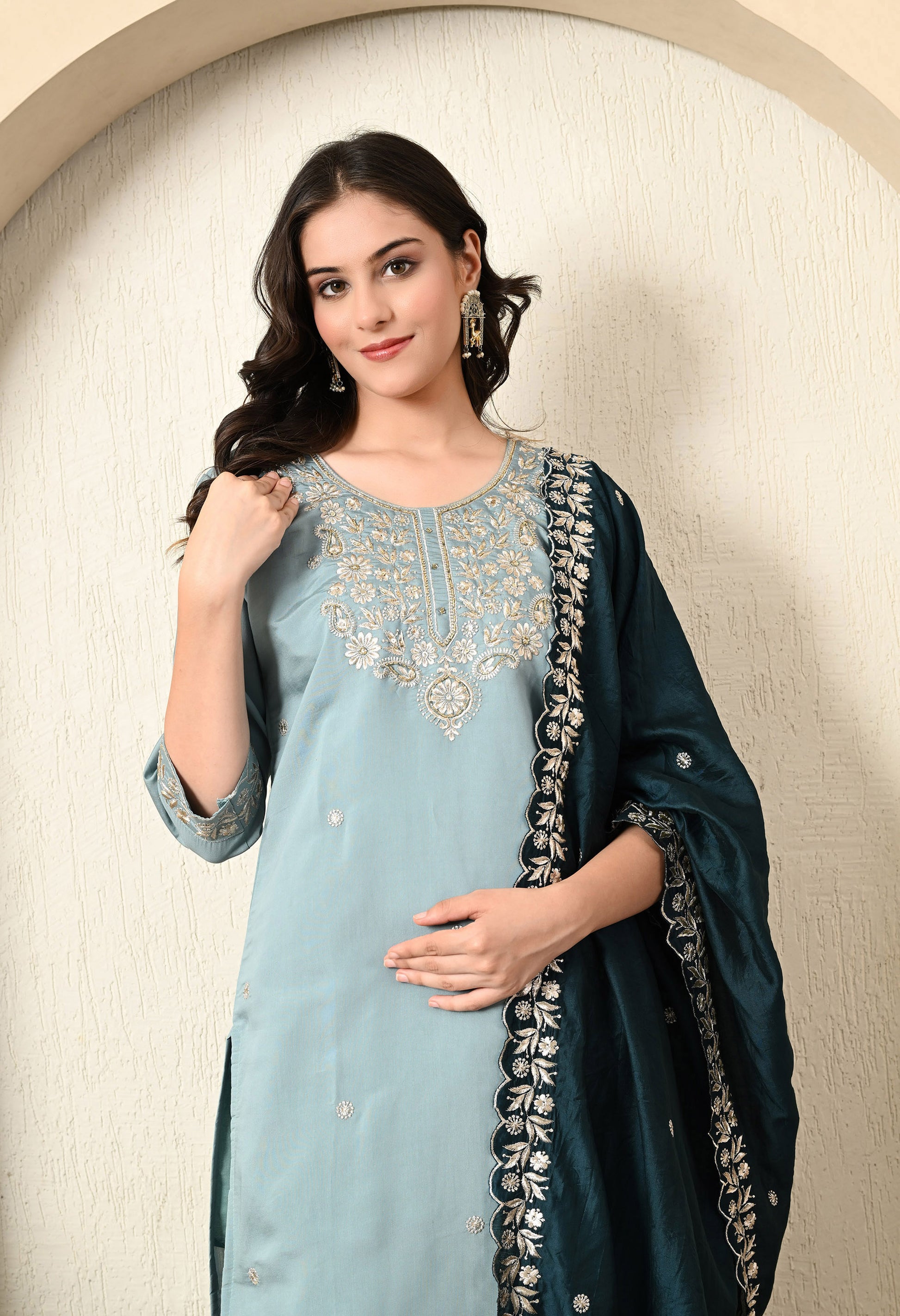 Our greyish blue kurta set is a vision of elegance, pairing a cotton silk kurta with an embroidered cotton silk straight pant and an astonishing contrast cotton silk dupatta. With intricate detailing in Zardozi and Zari work, the set is enhanced by true craftsmanship of hand and machine embroidery, it’s designed to bring out your sophisticated charm.