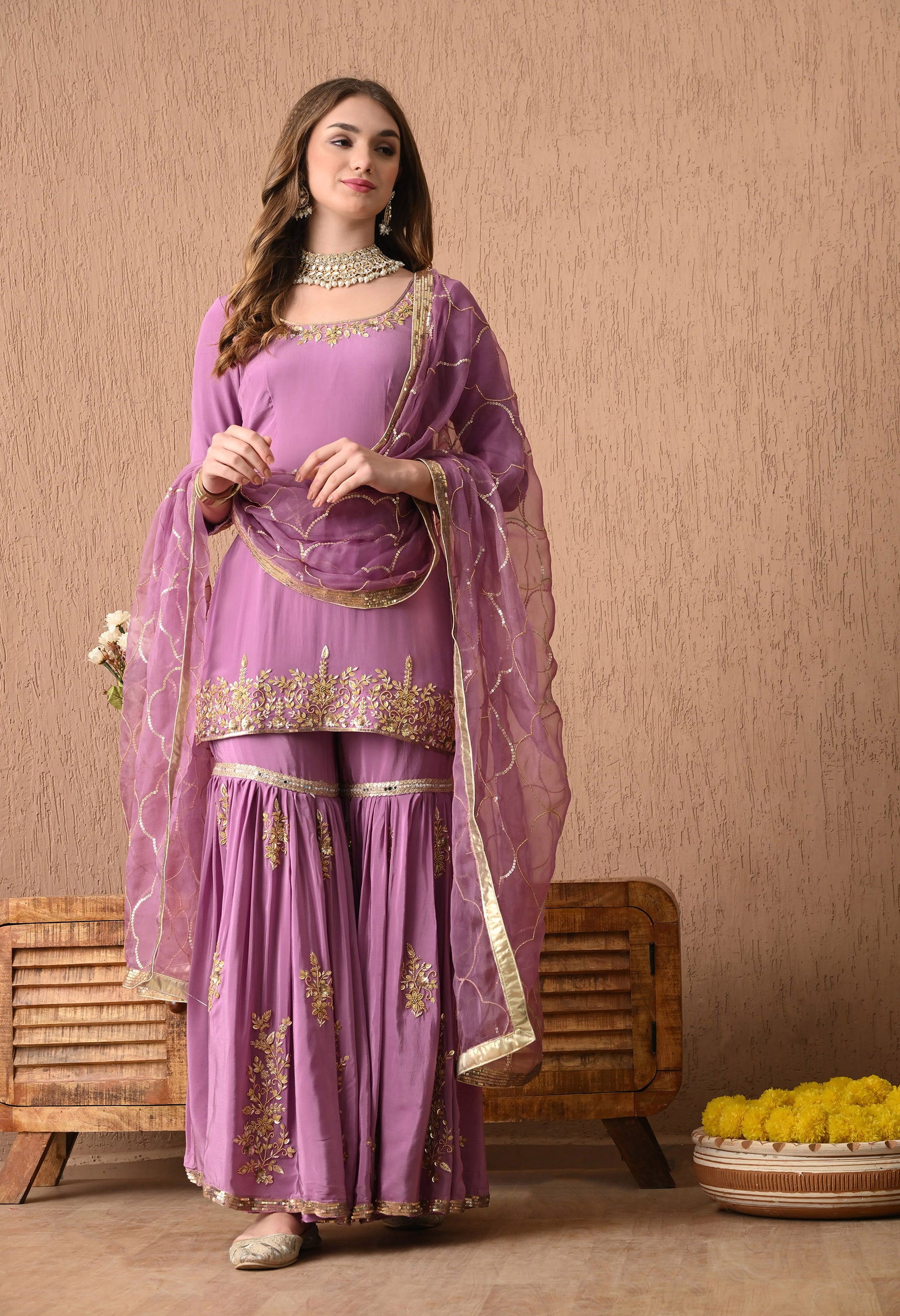 Revel in the artistry of tradition with our ethereal purple Sharara Set, adorned with intricate hand embroidery of zardozi and sequin work. The lightweight crepe kurta, organza dupatta, and crepe embroidered gharara offer an aura of refined elegance.