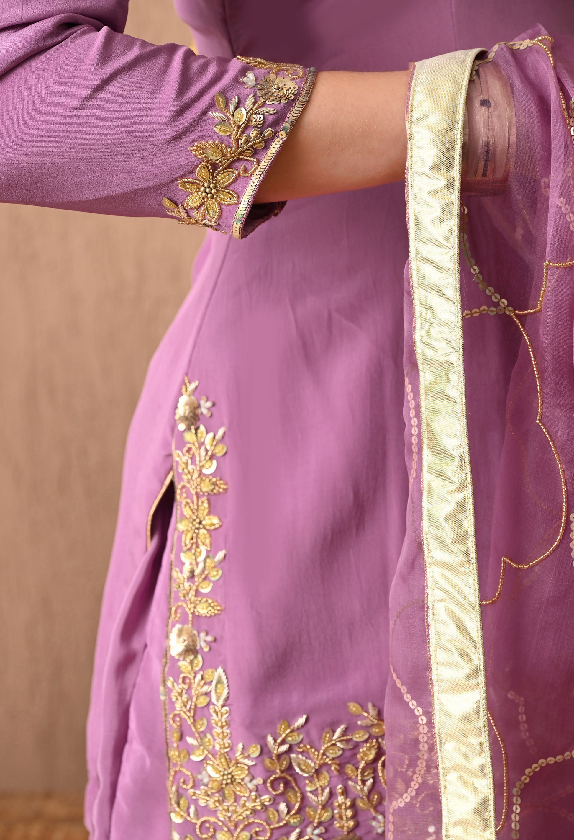 - Astonishing zardozi and sequin floral hand work on the Neck, Sleeves, Ghera & Chak of Kurta.
