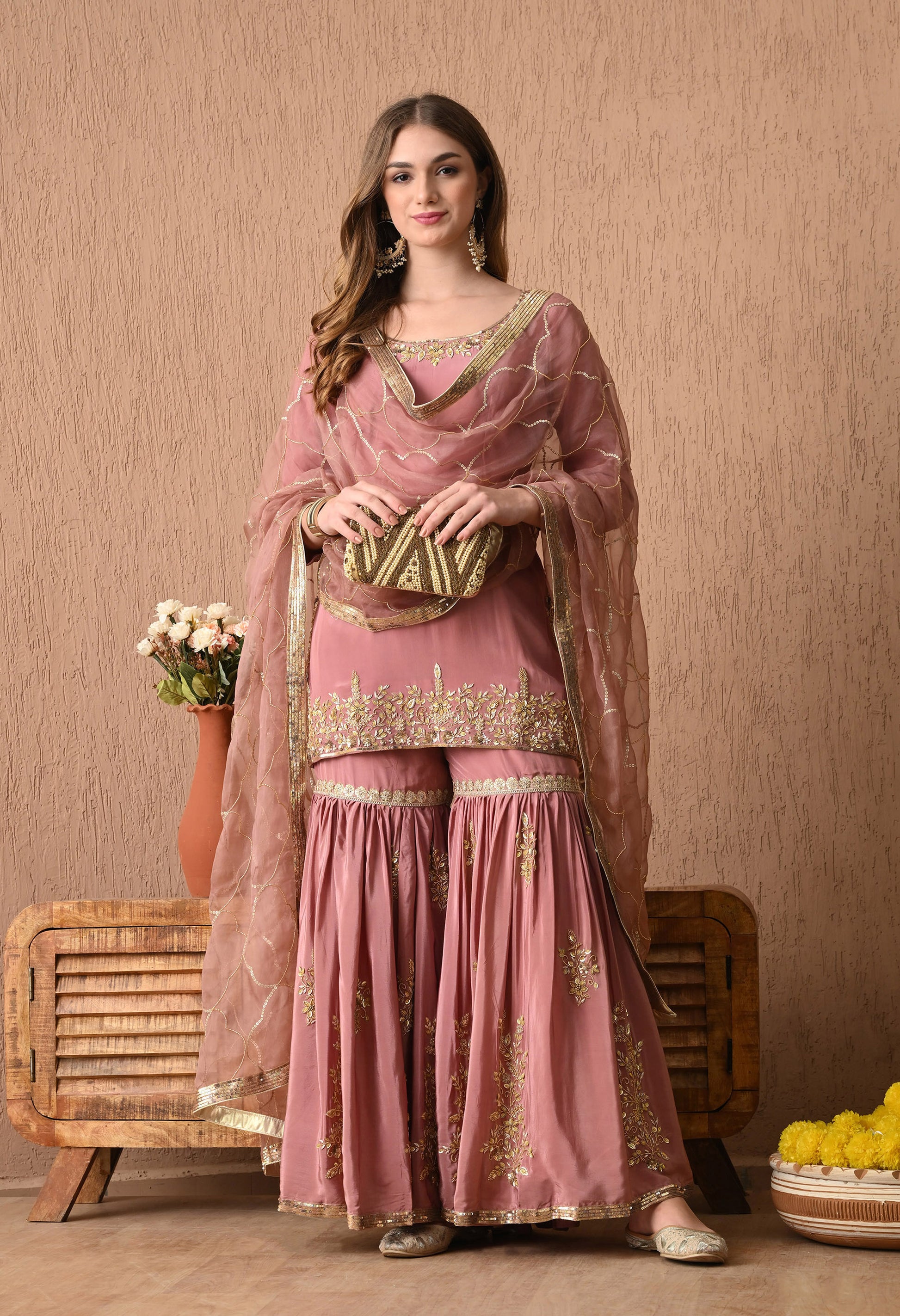 Step into a world of regal splendor with our mesmerizing beige peach Sharara Set, adorned with opulent hand embroidery of zardozi and dazzling sequin artistry. The weightless crepe kurta, sheer organza dupatta, and beautifully embroidered crepe gharara exude refined charm.