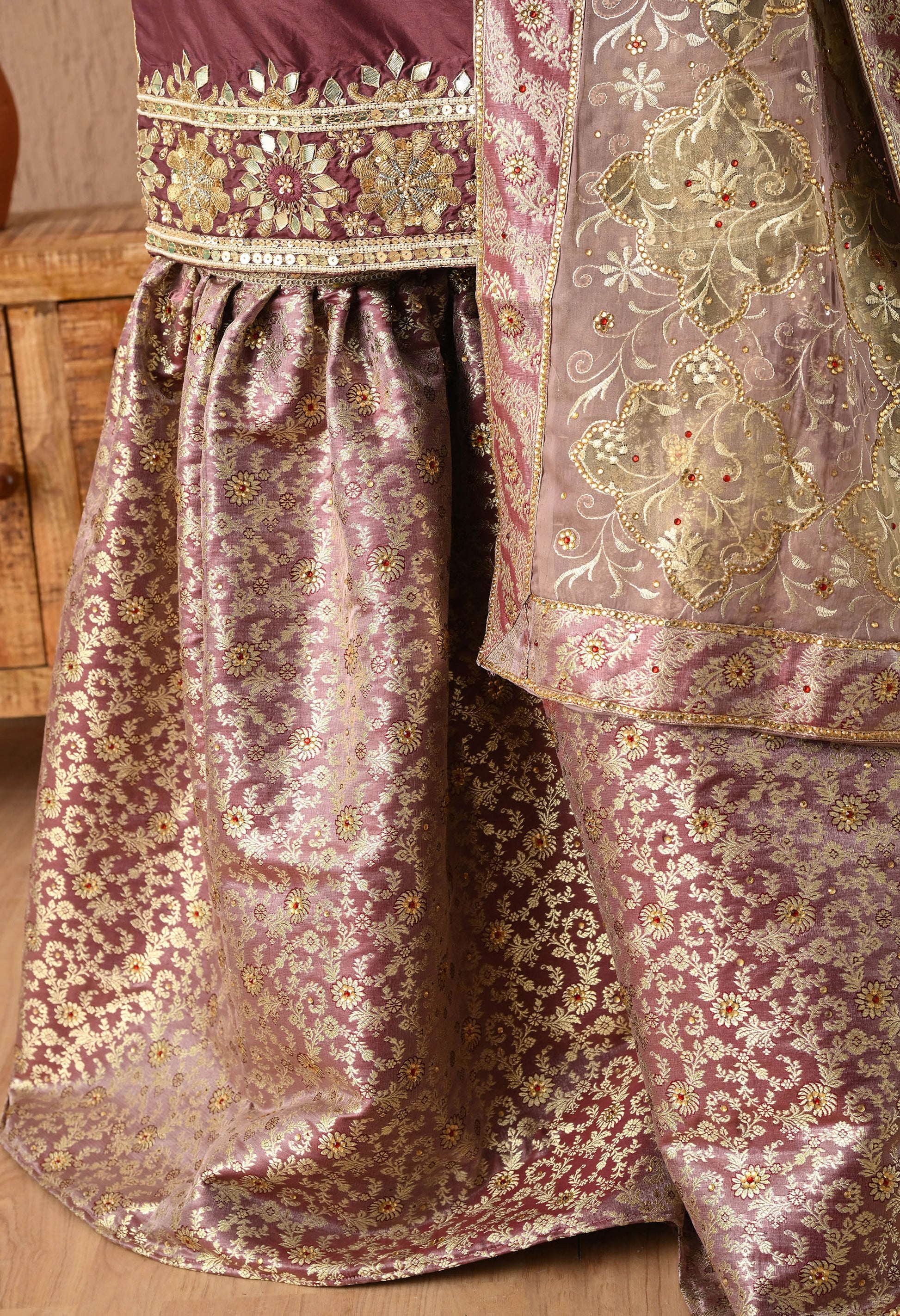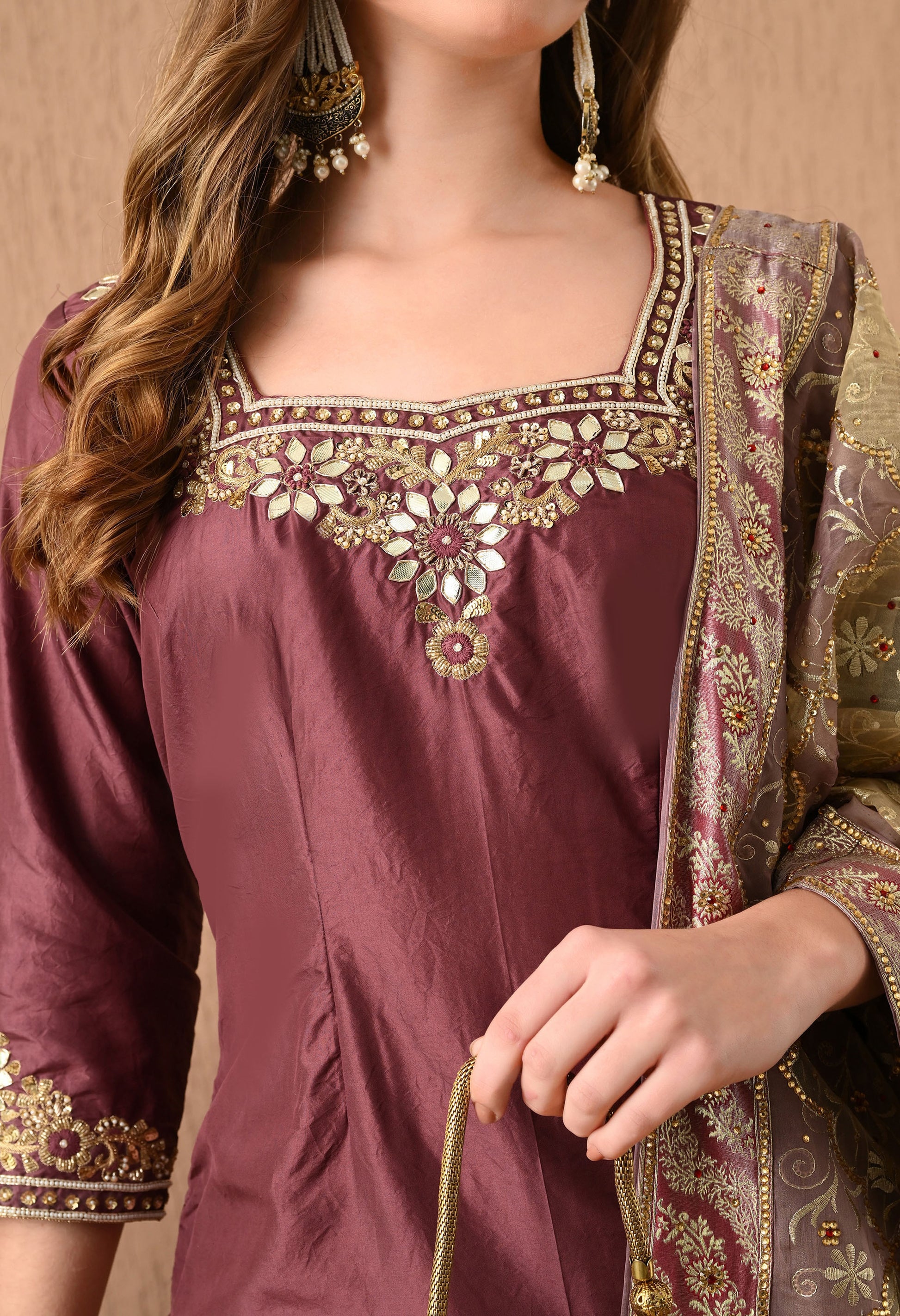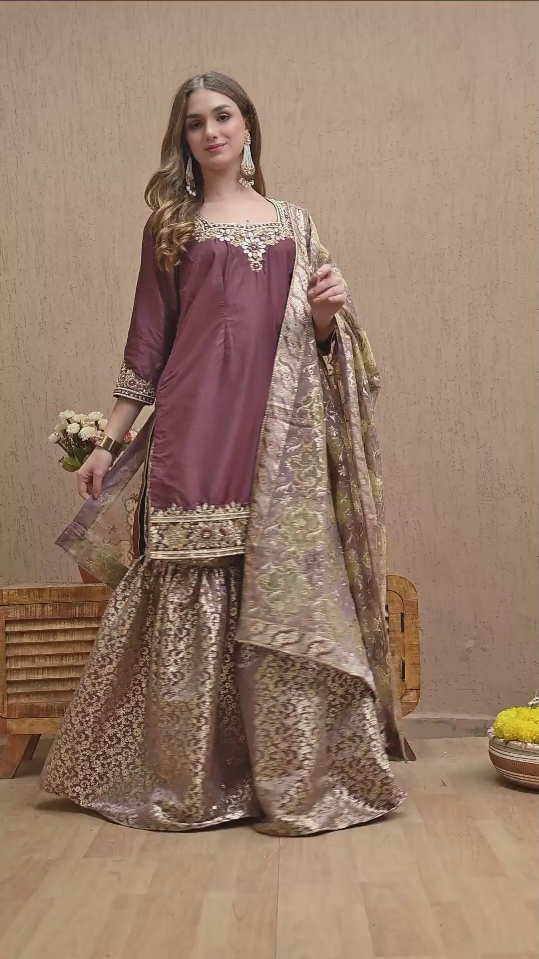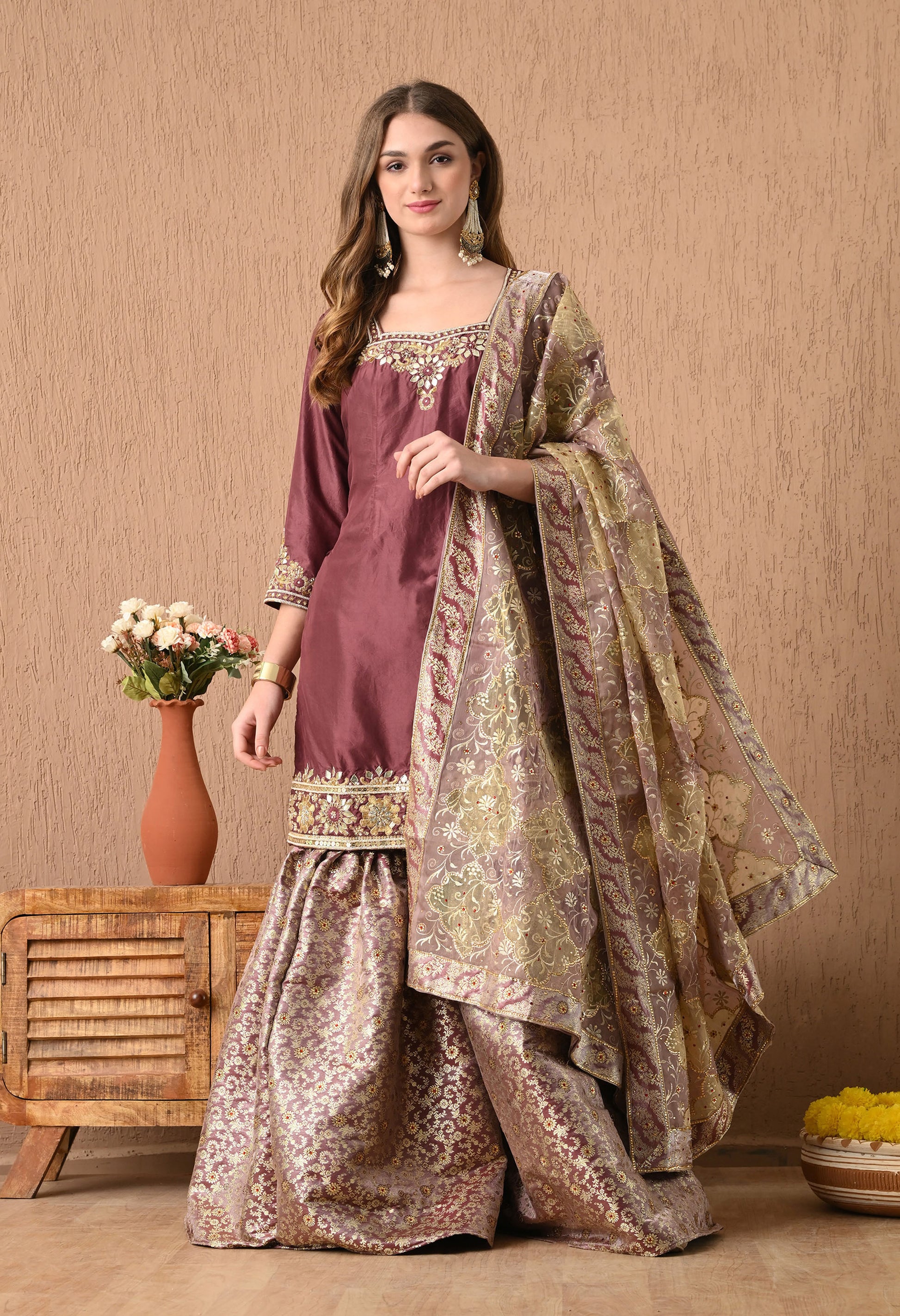 Drift into a realm of timeless beauty with our enchanting light brown Sharara Set, adorned with intricate gotta, zardozi and shimmering pearls. The flowing silk kurta, airy georgette dupatta, and exquisitely embroidered banarsi silk garara radiate effortless femininity.