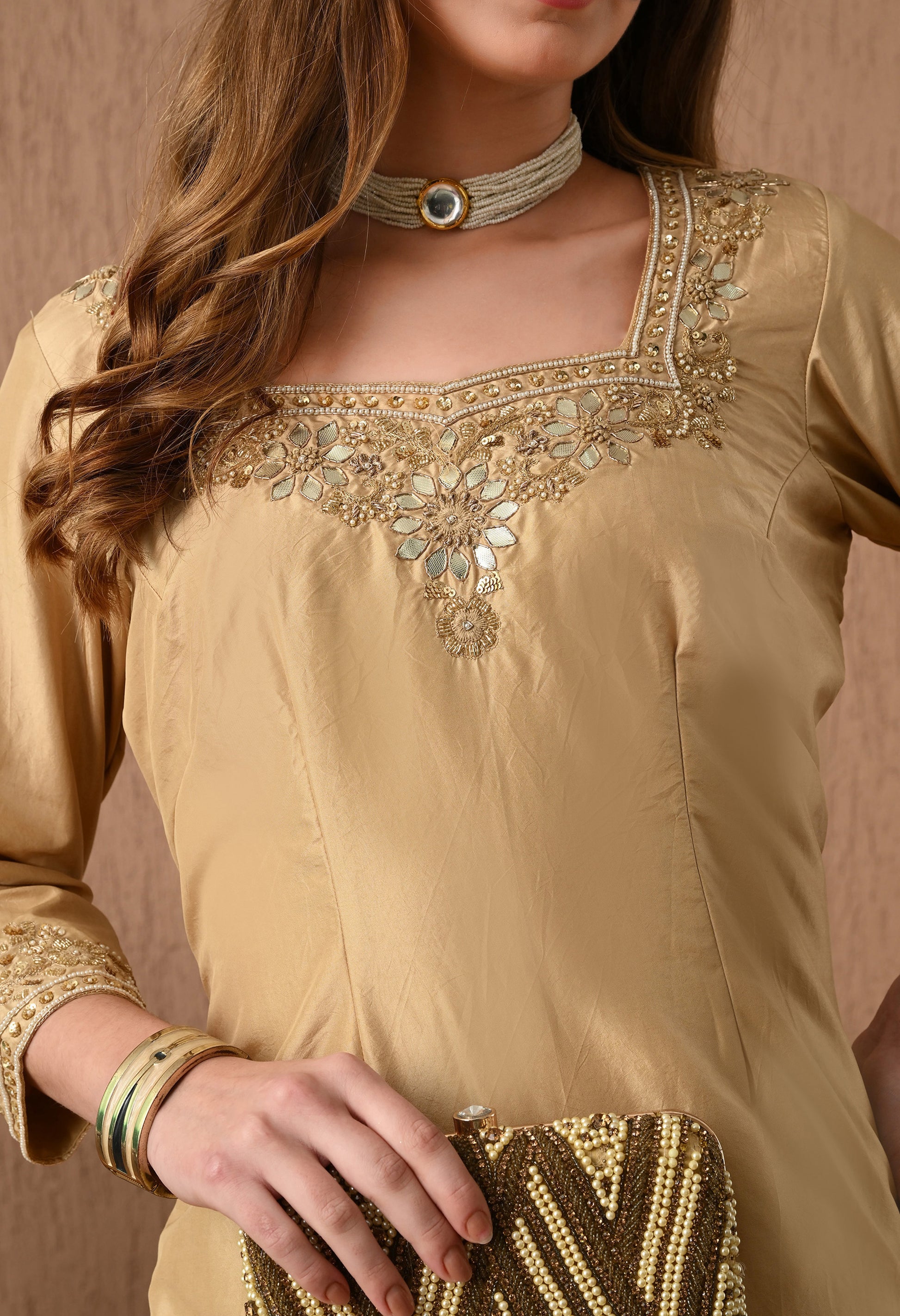 Delicacy meets grandeur in our captivating golden Sharara Set, graced with exquisite hand embroidery of gotta, zardozi and dazzling sequins. The light-as-air silk kurta, sheer georgette dupatta, and ornately embroidered banarsi silk garara exude regal elegance.