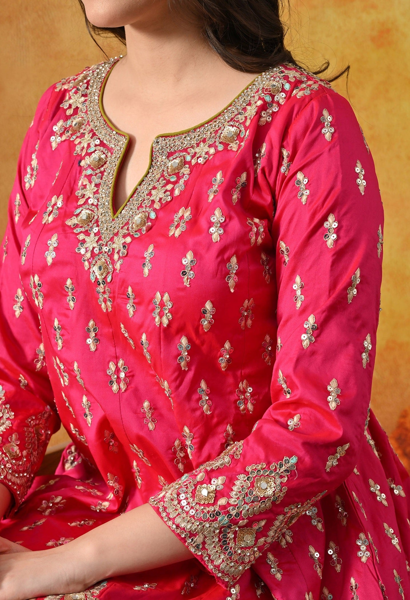 Hot pink gharara set featuring a silk kurti with a georgette gharara and net dupatta, beautifully hand embroidered with zardozi, sequin, and crystal work—perfect for party wear, haldi, and mehndi occasions.