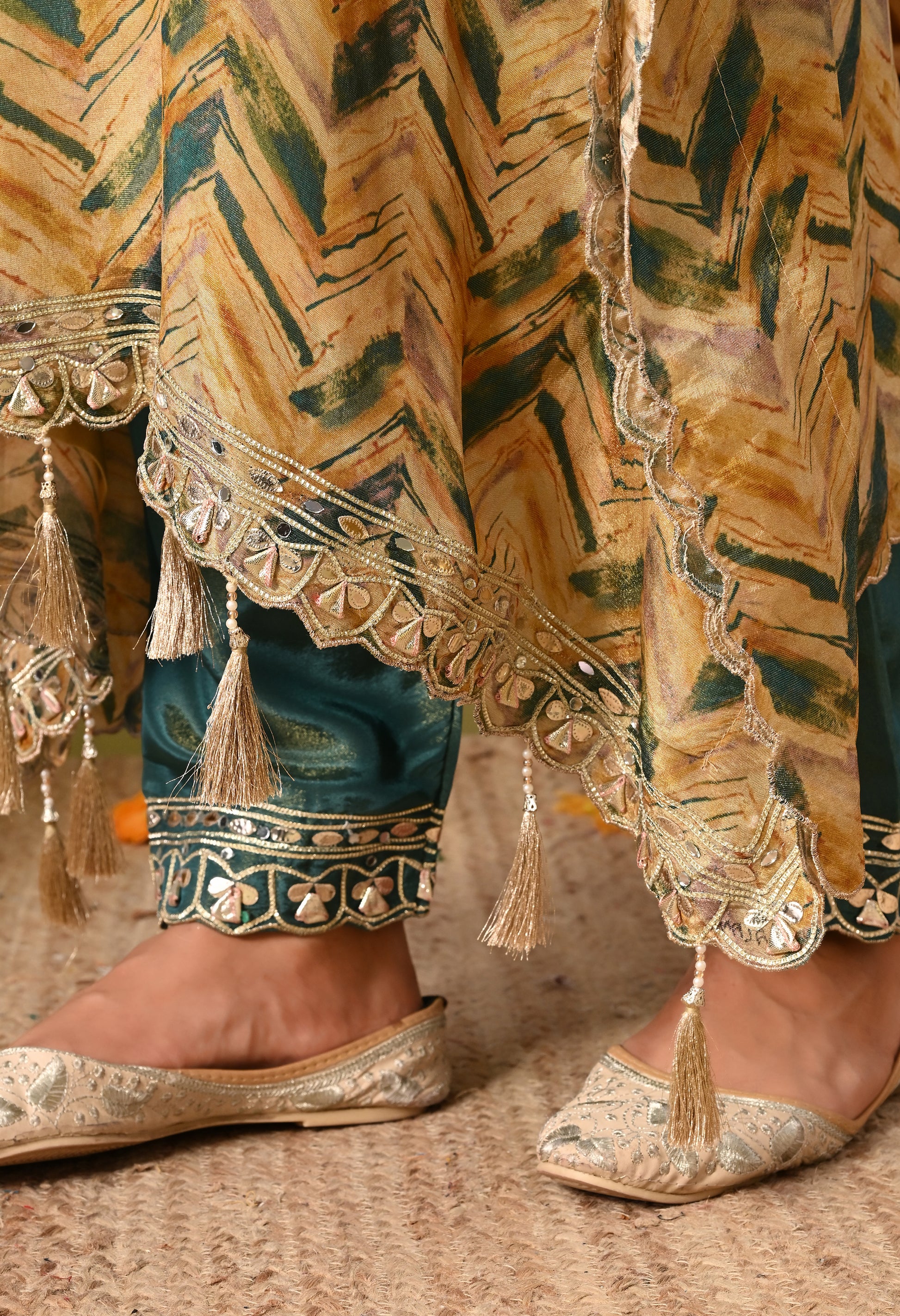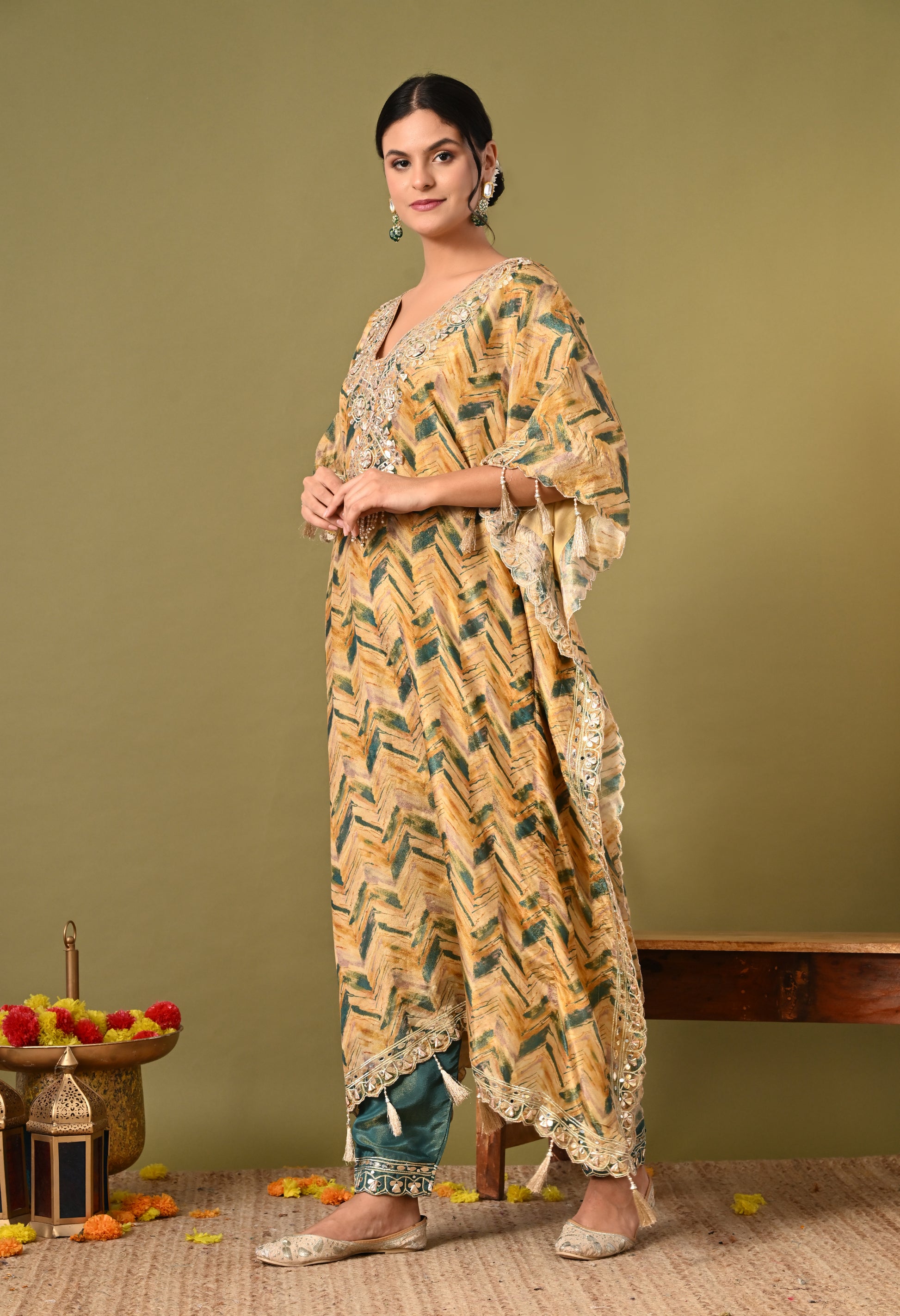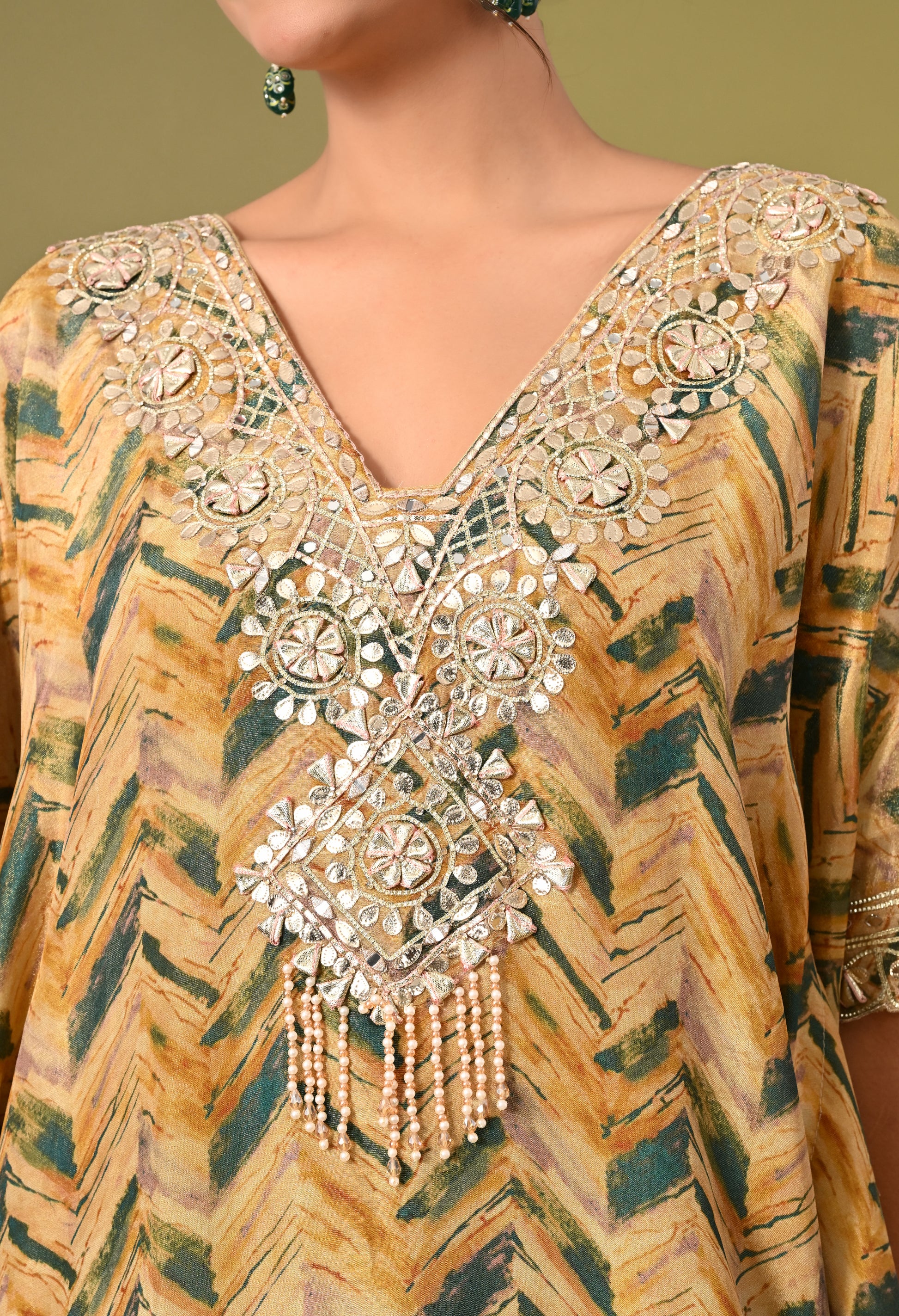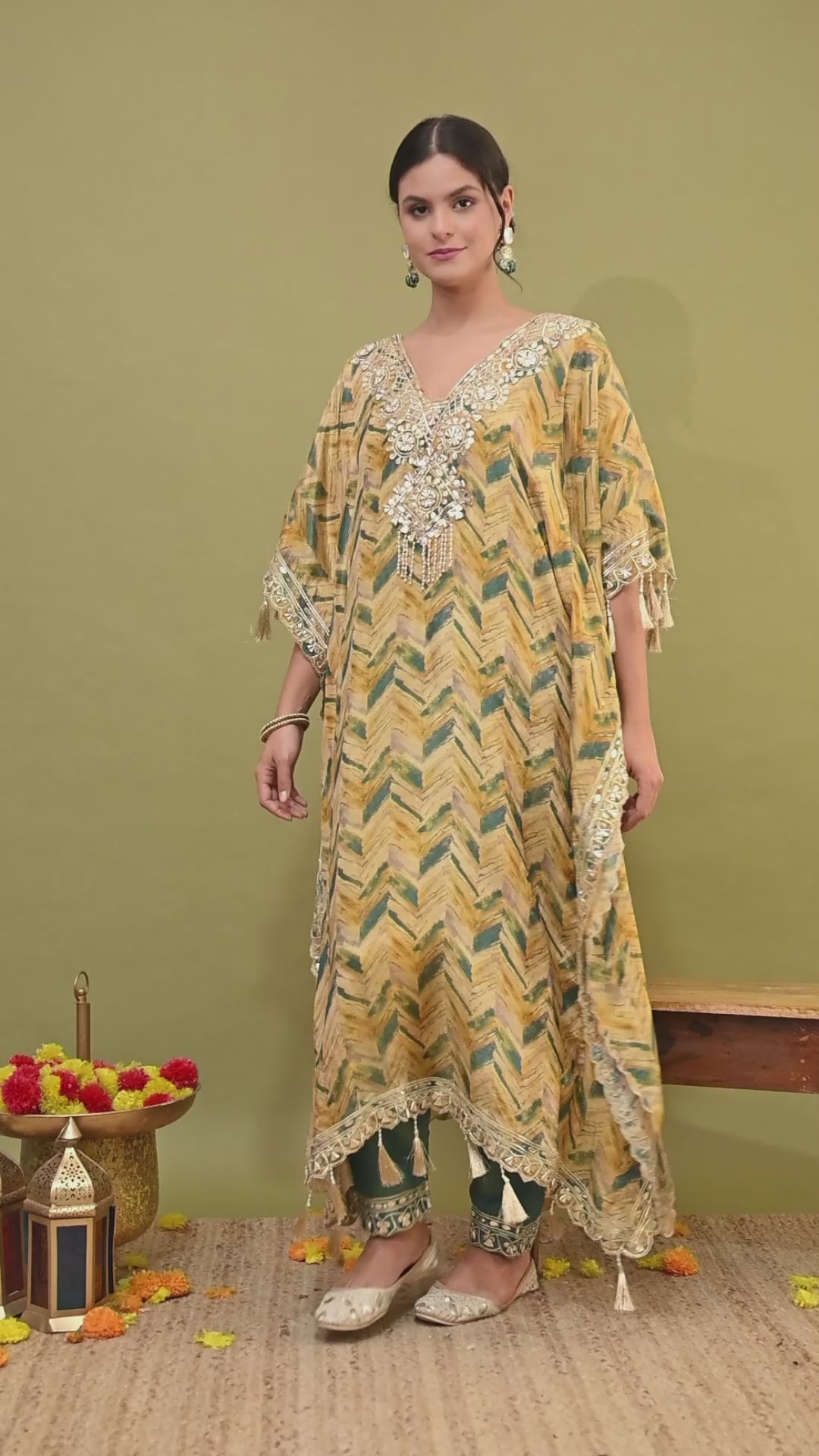 Lavish Yellow and Green Kaftan Set with Gotta, Zardozi, and Mirror Work