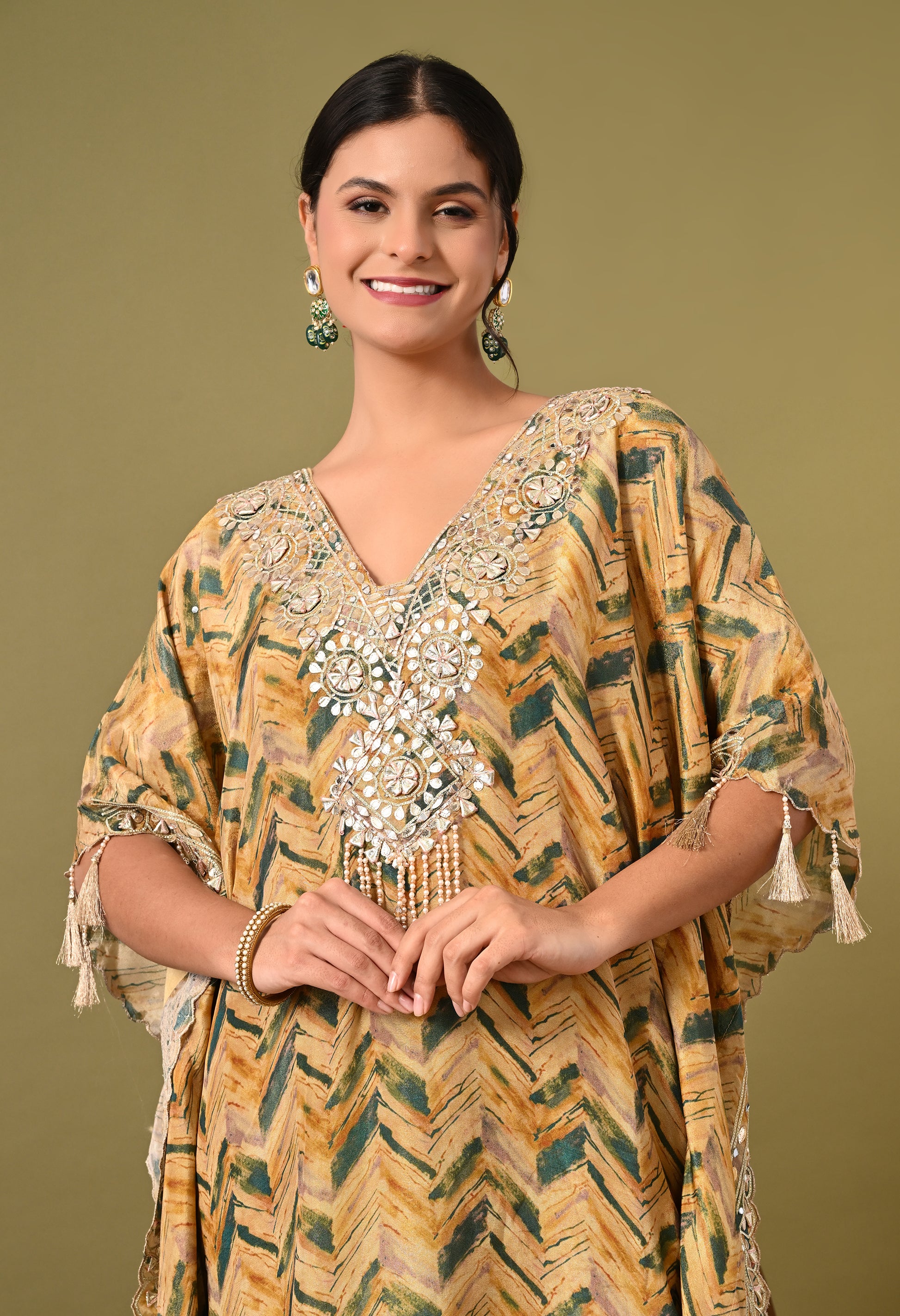 Unleash your radiance with our luminous yellow and green Kaftan Set, a meticulously crafted tissue crepe kaftan, and a matching tissue crepe bottom. The intricate work of gota patti, zardozi, and mirror give it an alluring charm. Be unforgettable!