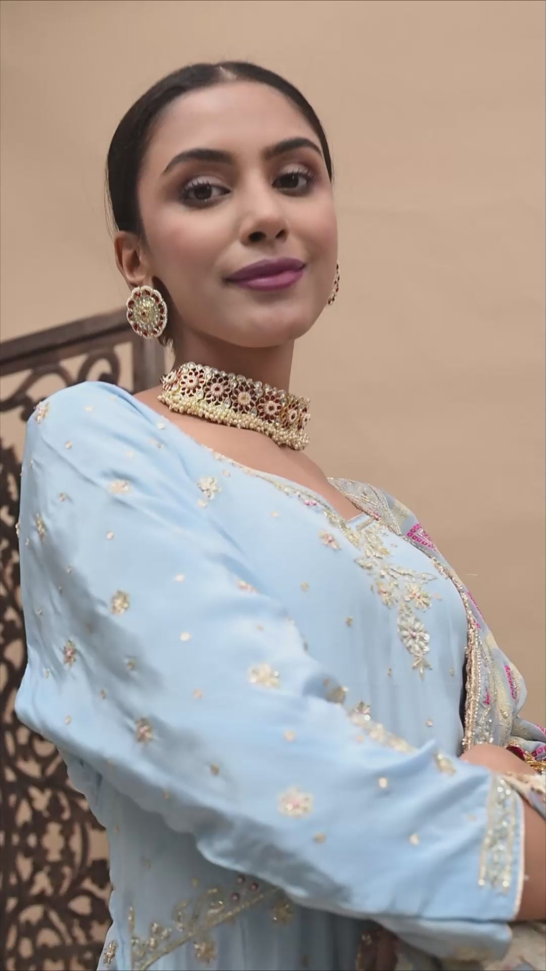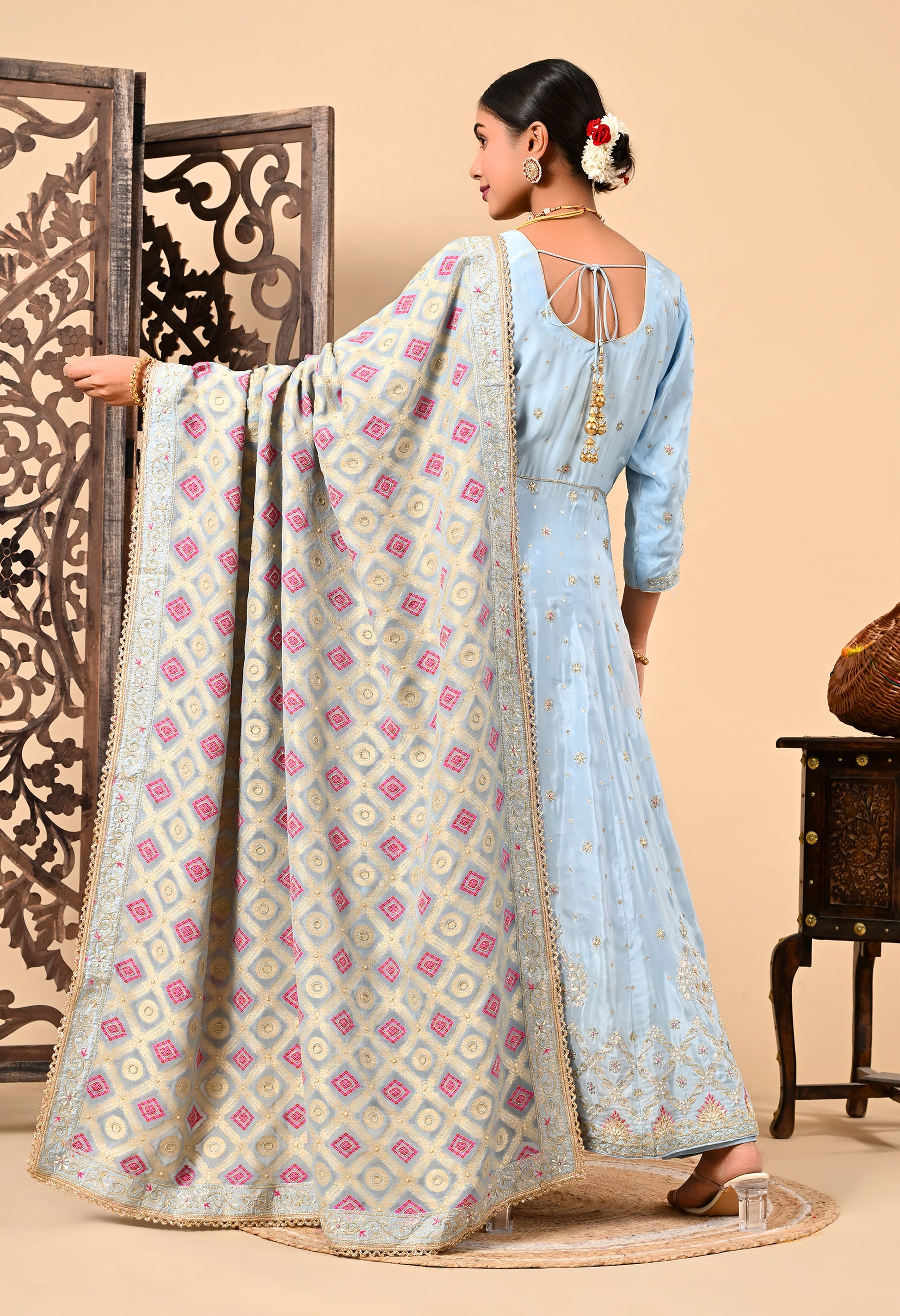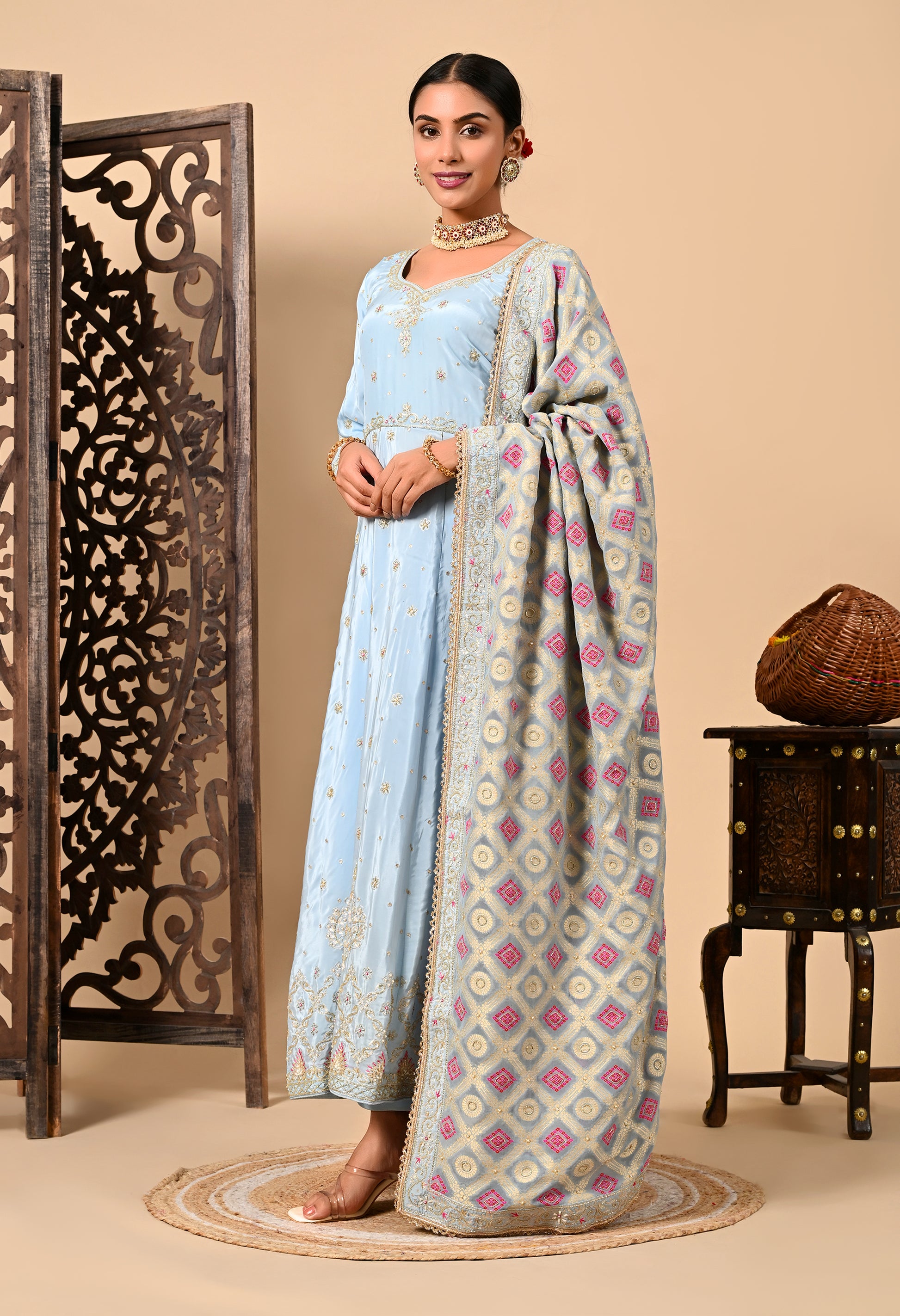 Drape yourself in royalness with our light blue Anarkali Set, featuring a breezy banarsi silk dupatta, an intricately embroidered crepe anarkali, and a complementing crepe bottom. Featuring delicate zardozi, dabka, sequin, and thread accents add an everlasting touch of elegance.