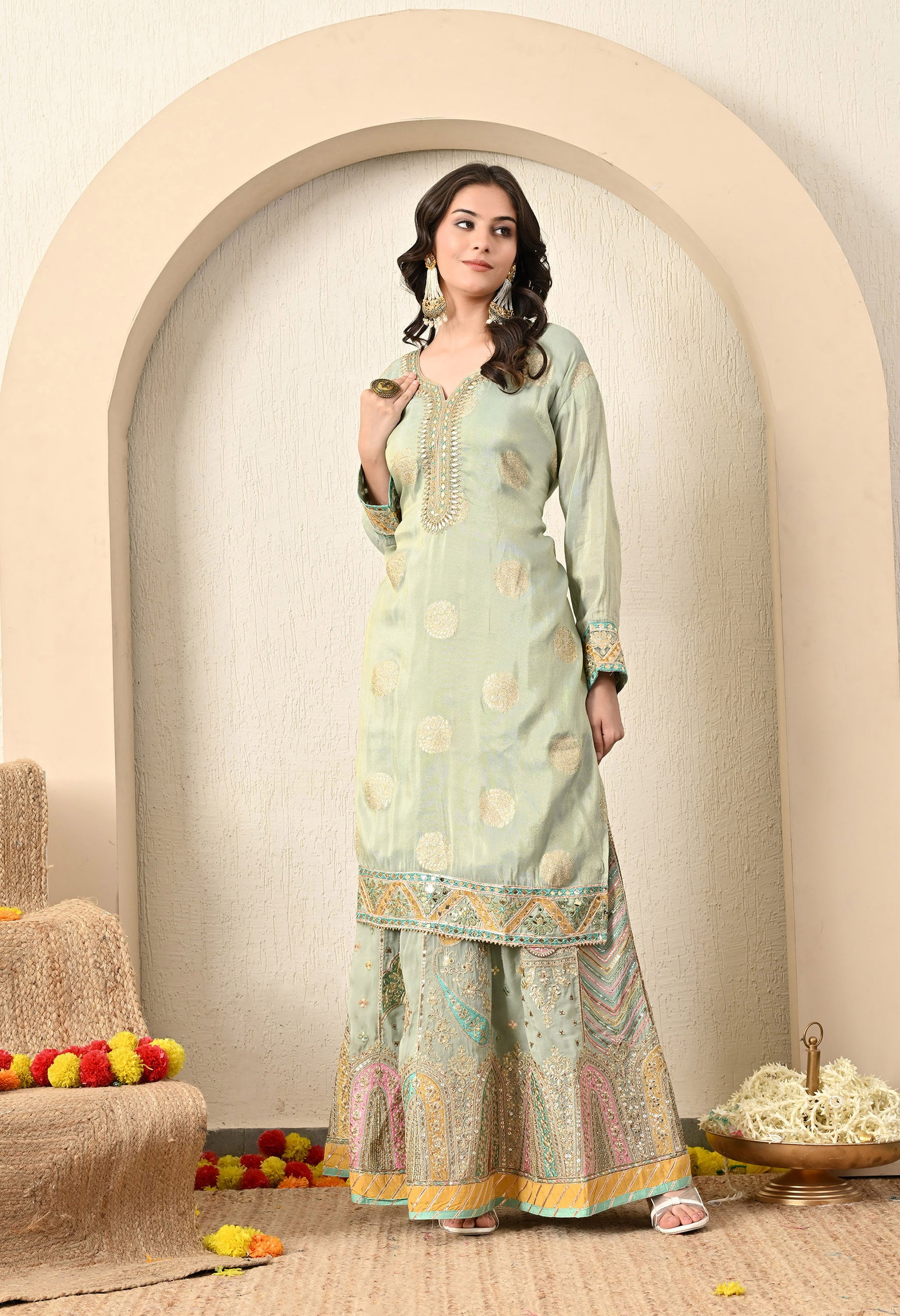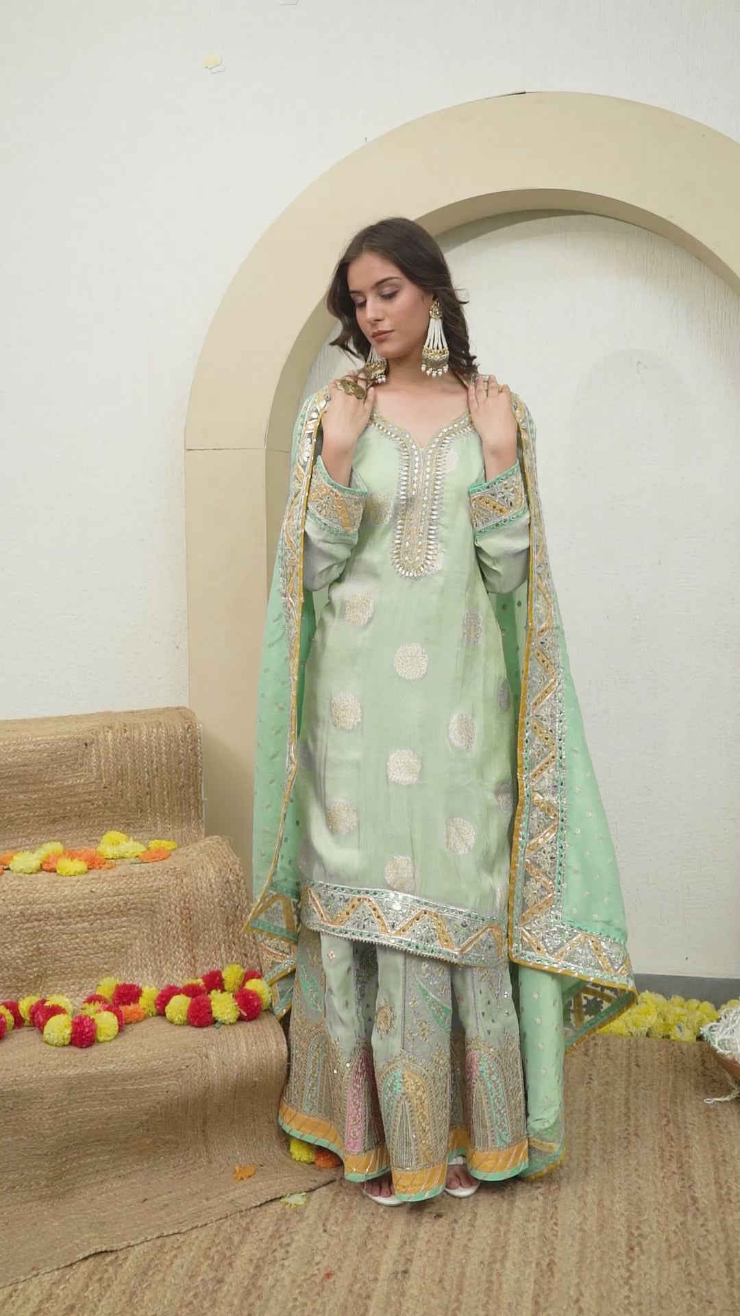 Feel the Wealth of Royalness with our beautiful and exquisite Lehenga Set. Crafted from tissue jacquard fabric, the kurta points to the elegant hand and machine embroidery in a regal light green hue. The tissue jacquard dupatta with astonishing embroidery and organza bottom truly makes you feel beautiful inside out. Perfect to add a little royal touch to an individual’s personality.