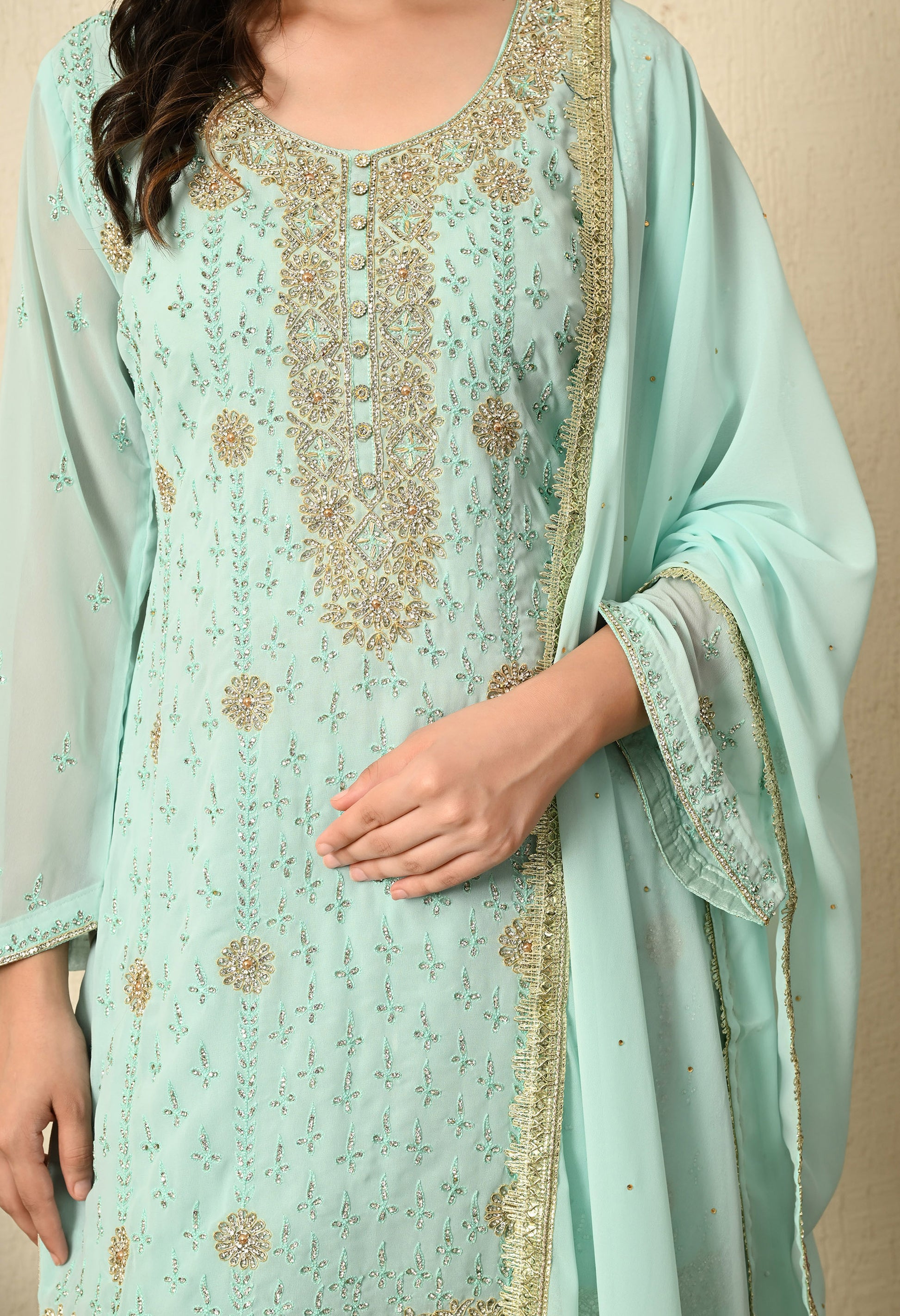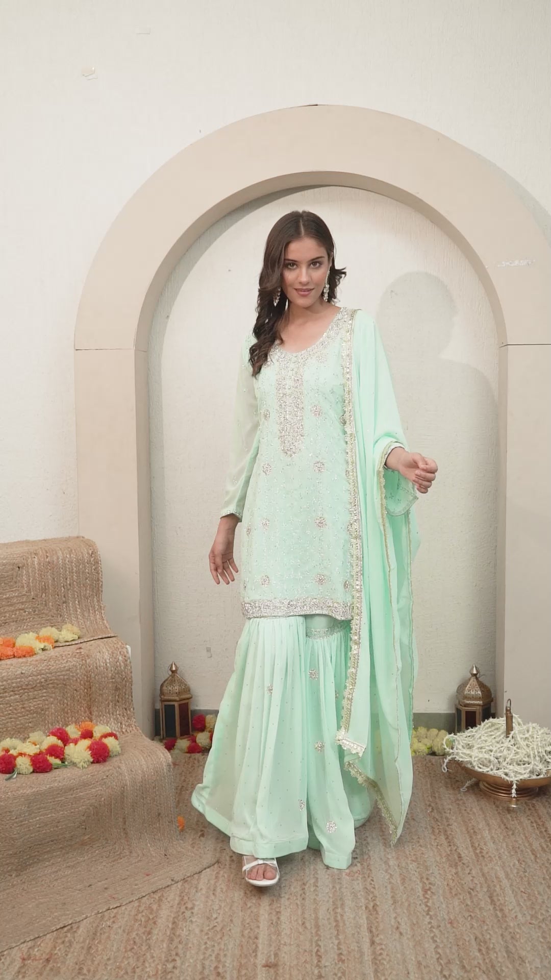 Unveil your regal charm with our light green Gharara set. This georgette kurta, paired with embroidered Gharara and a matching georgette dupatta, showcases Thread and Crystal work, topped with elegant embroidery for a graceful finish.