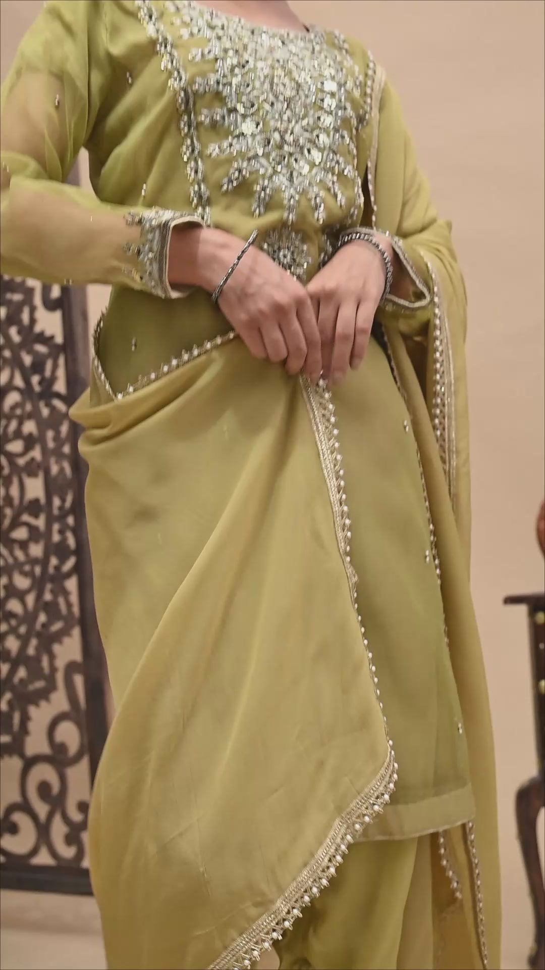 Reveal your glowy charm with our mehndi green Kurta Set, styled with a light organza dupatta, a richly curated organza kurta, and a matching crepe bottom. The intricate zardozi, dabka, and sequin embellishments showcase its enduring beauty.