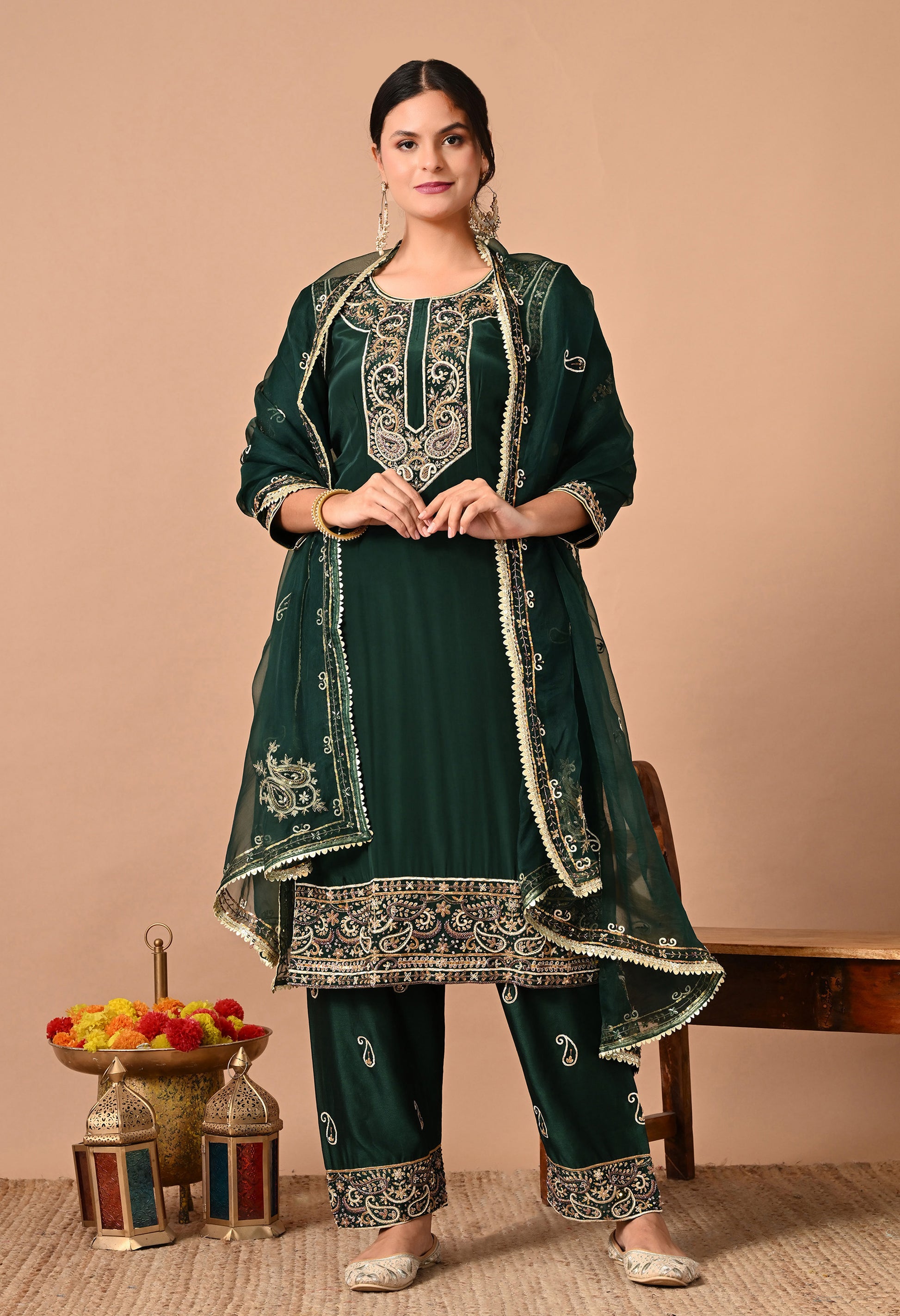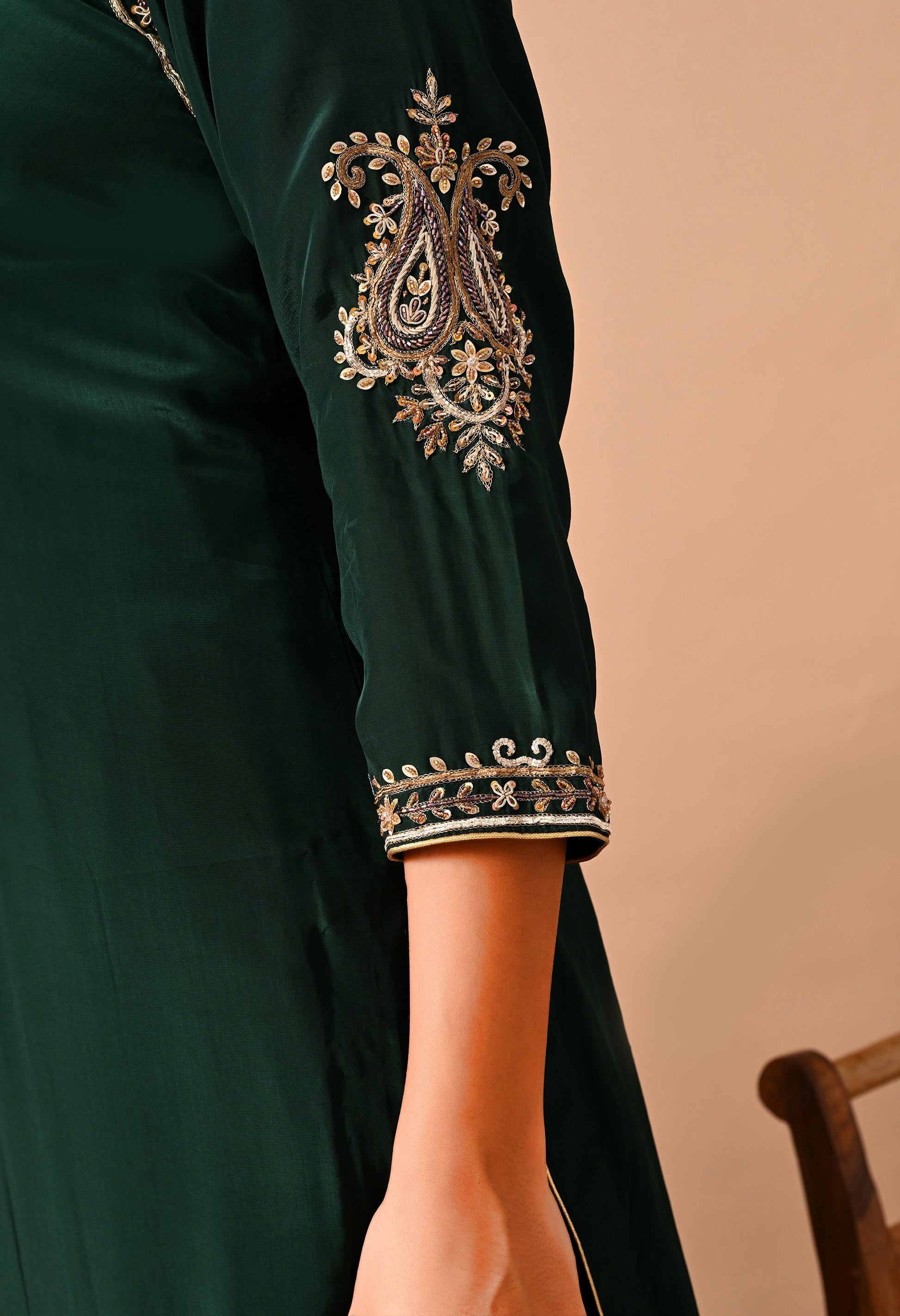 Mesmerising Bottle Green Kurta Set with Intricate Zardozi Work