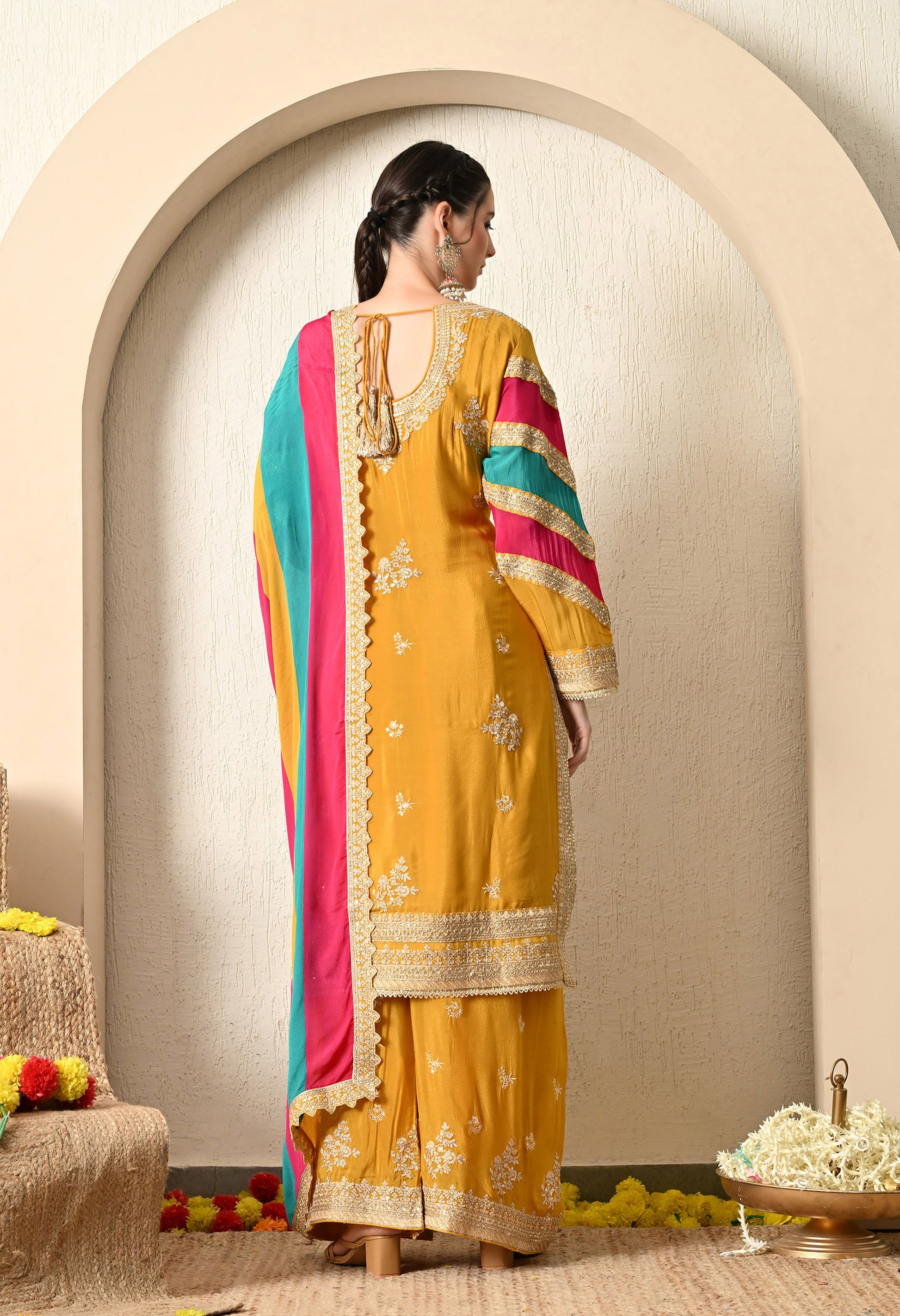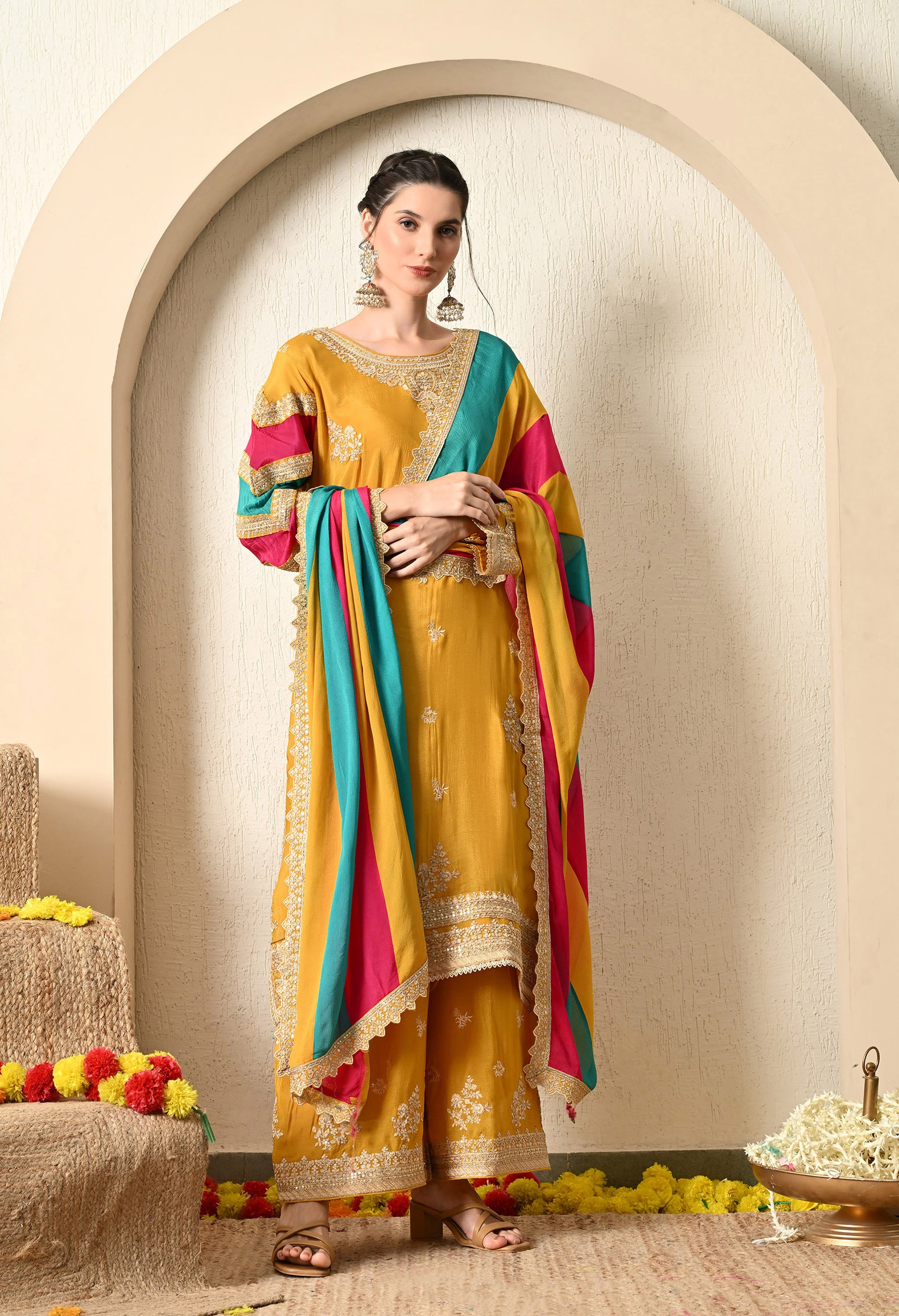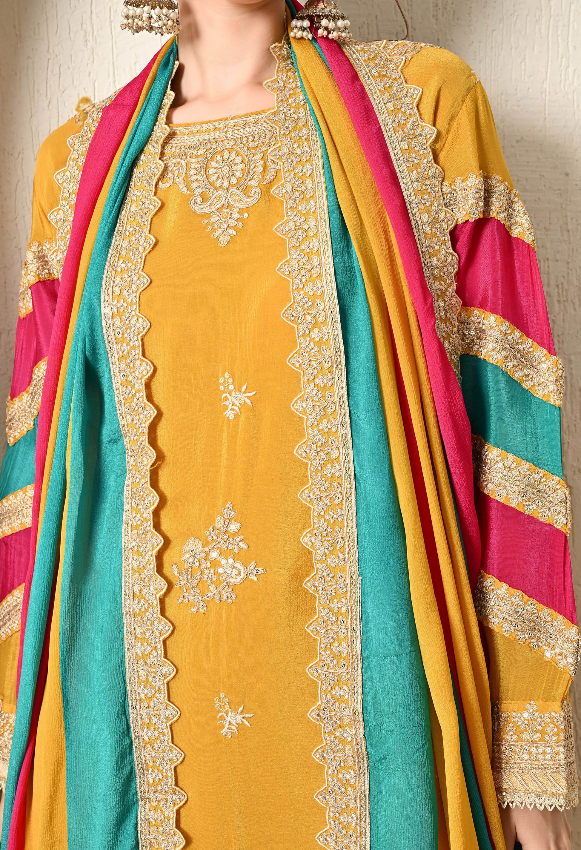 Embrace the culture and tradition of Indian craftsmanship with our beautiful three-piece kurta set. Crafted from luxurious organza fabric, the kurta showcases elegant hand and machine embroidery in a mesmerizing mustard yellow. The organza dupatta with astonishing embroidery and crepe bottom truly takes the breath away. Perfect to add elegance to an individual’s personality.