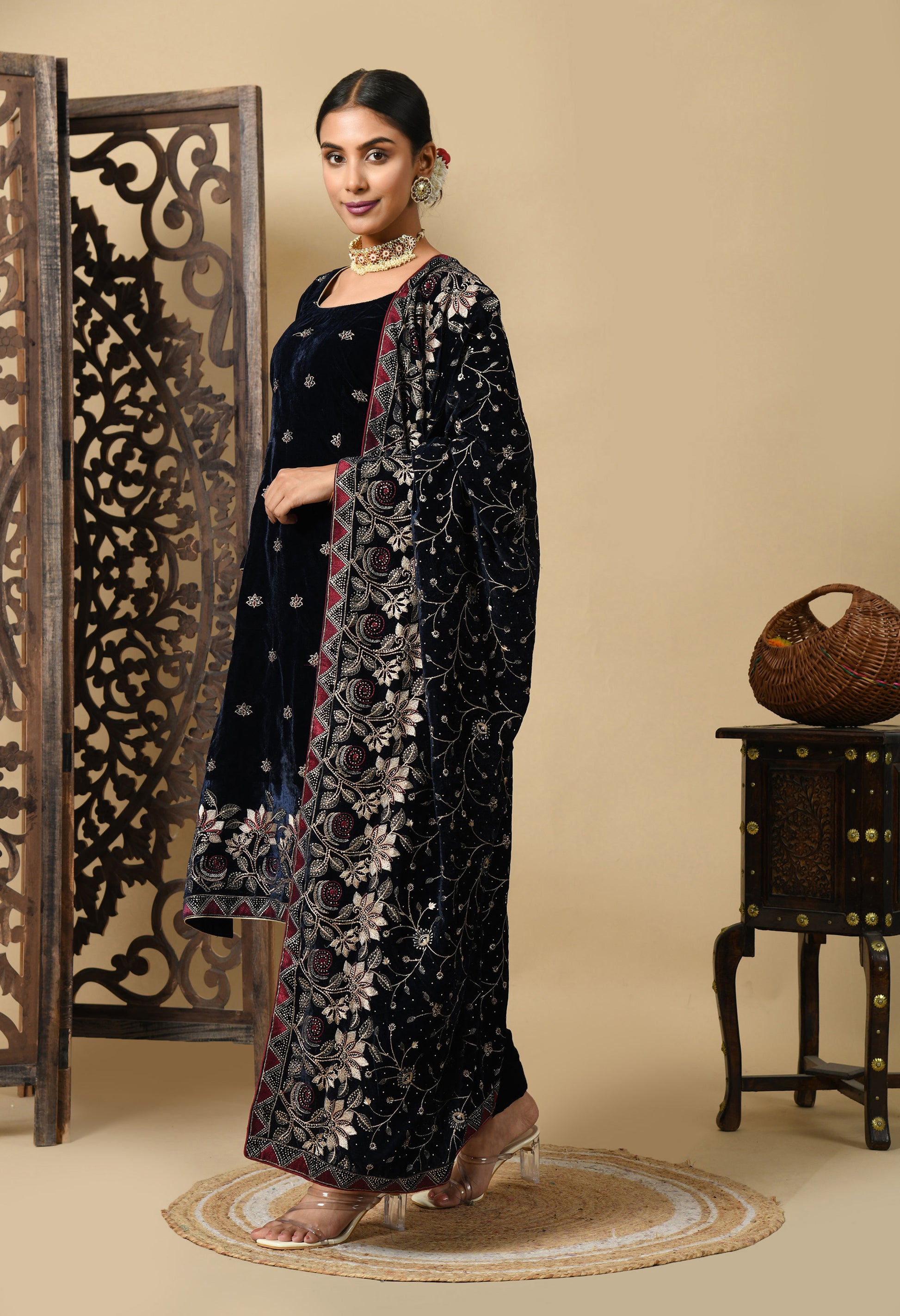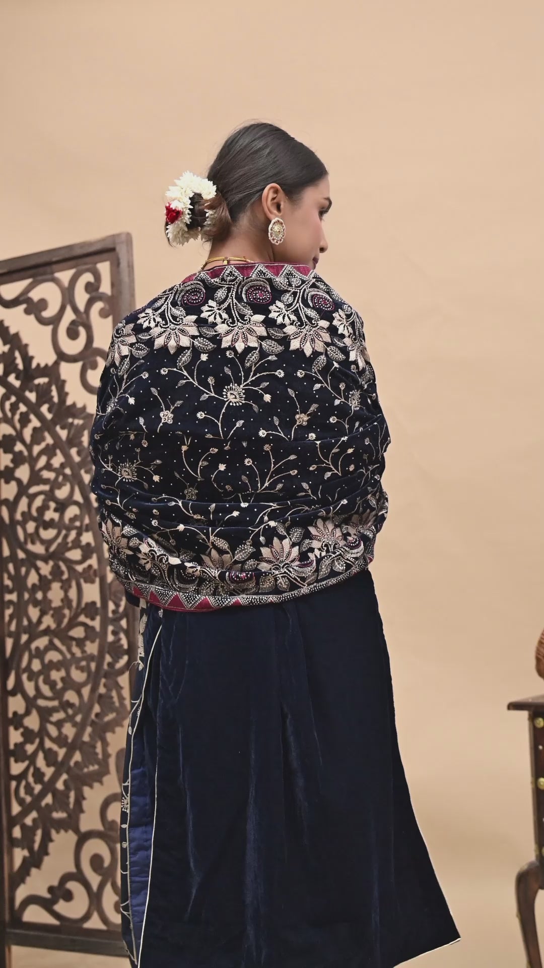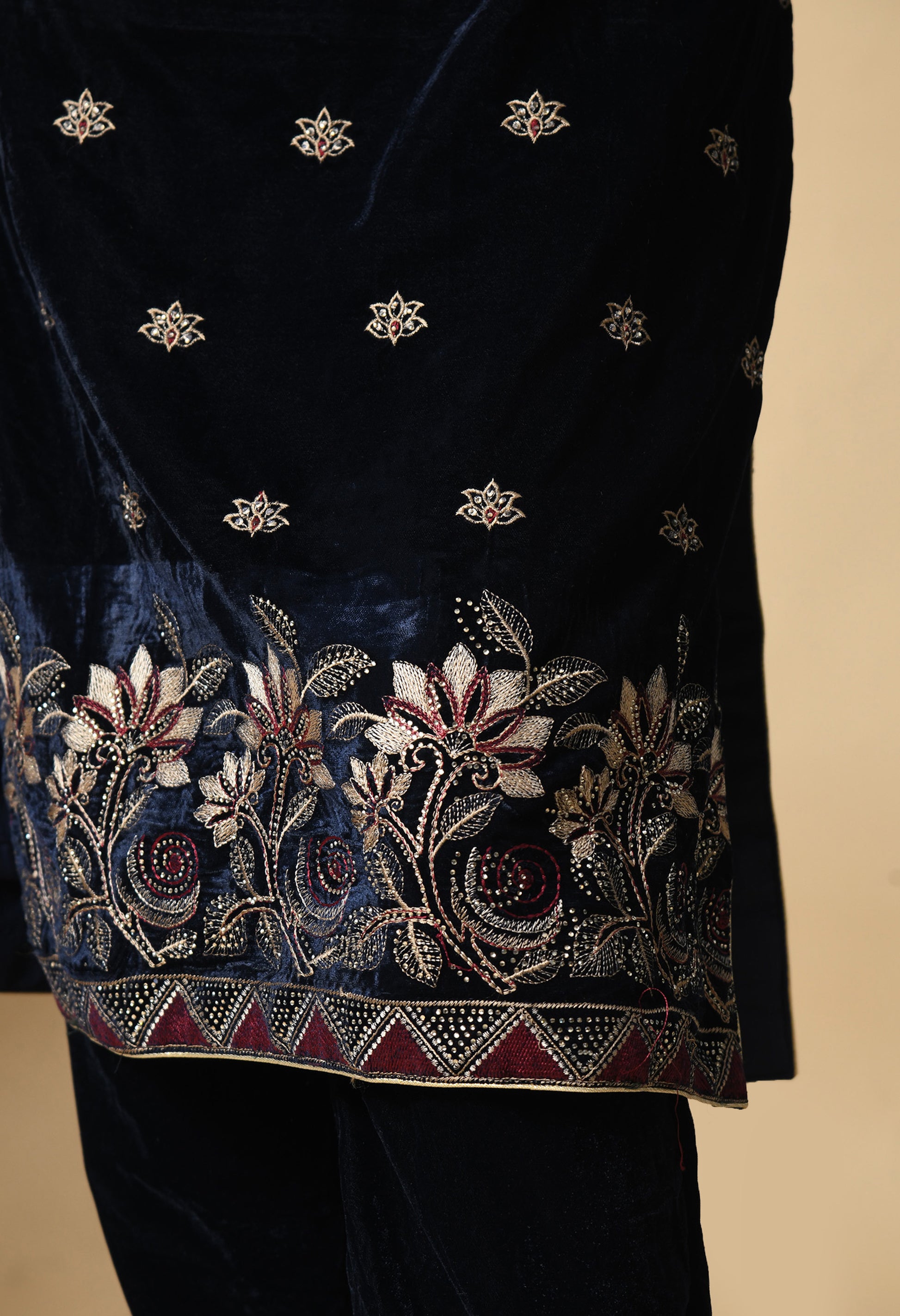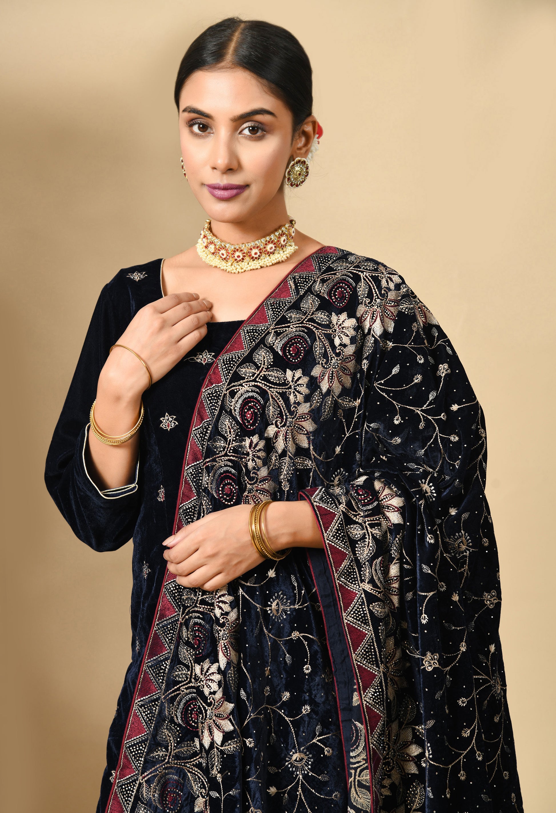 Embrace the essence of tradition with our navy blue hue Kurta Set, featuring a lush velvet dupatta, a richly embroidered velvet kurta, and a matching velvet bottom. The delicate zardozi, thread, and crystal accents add a refined, timeless touch.