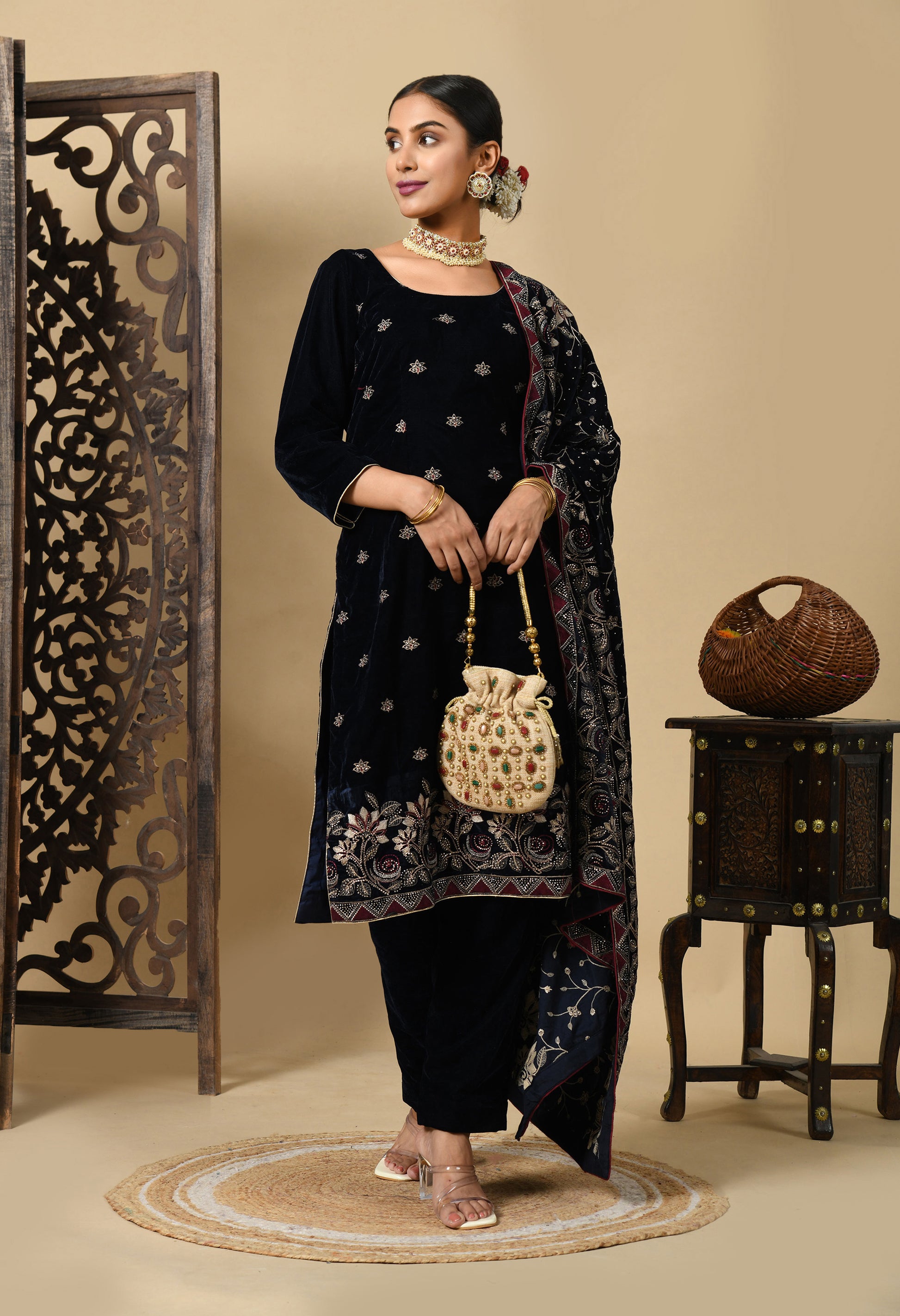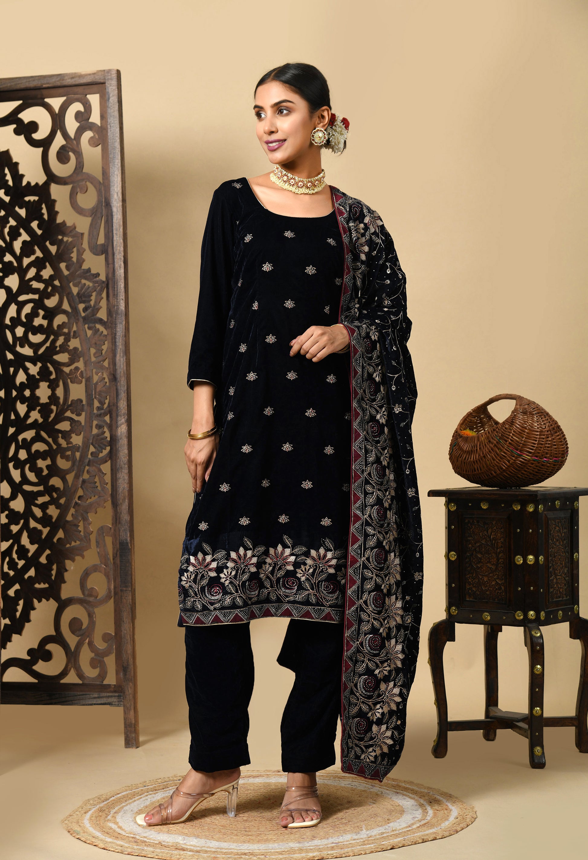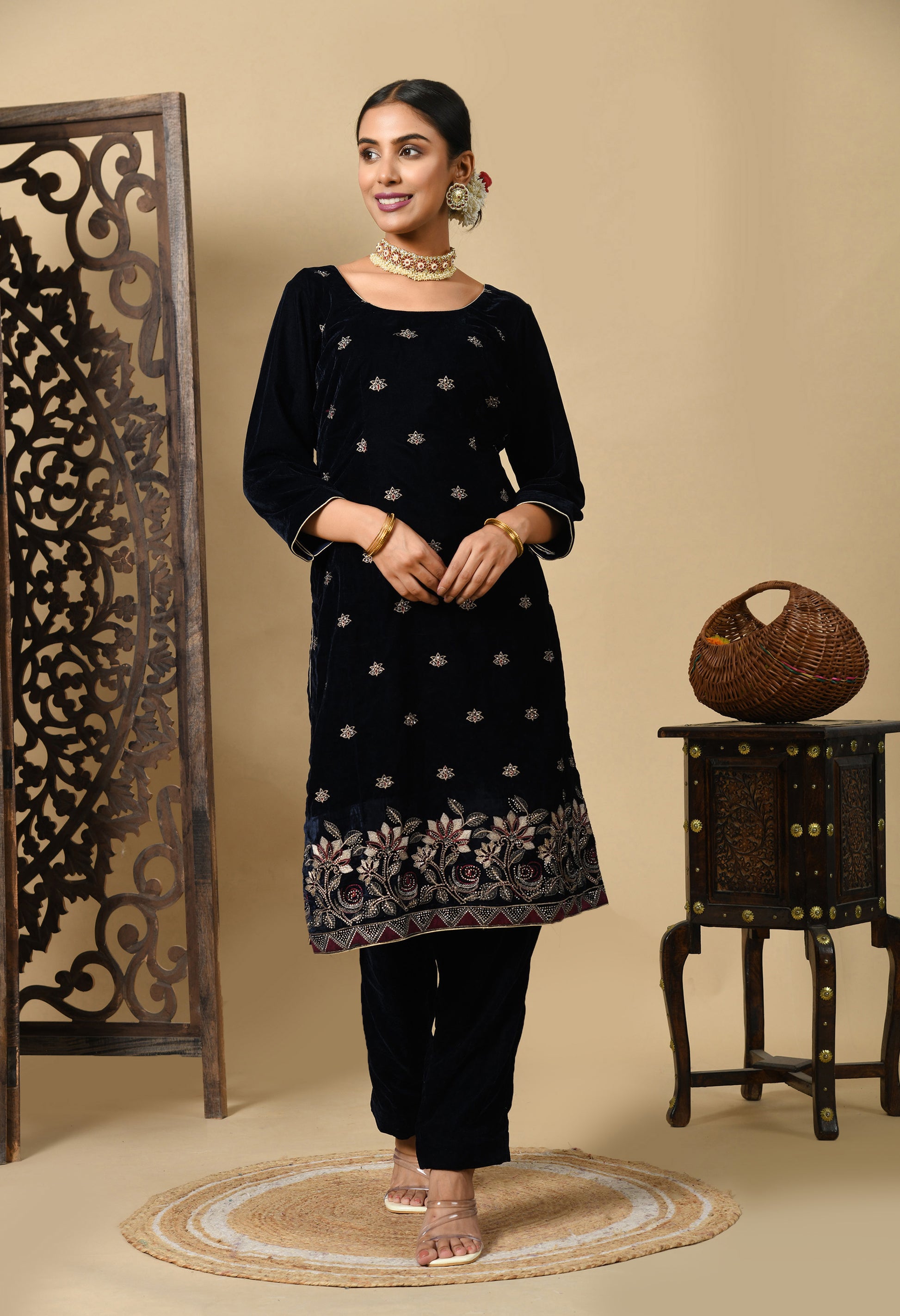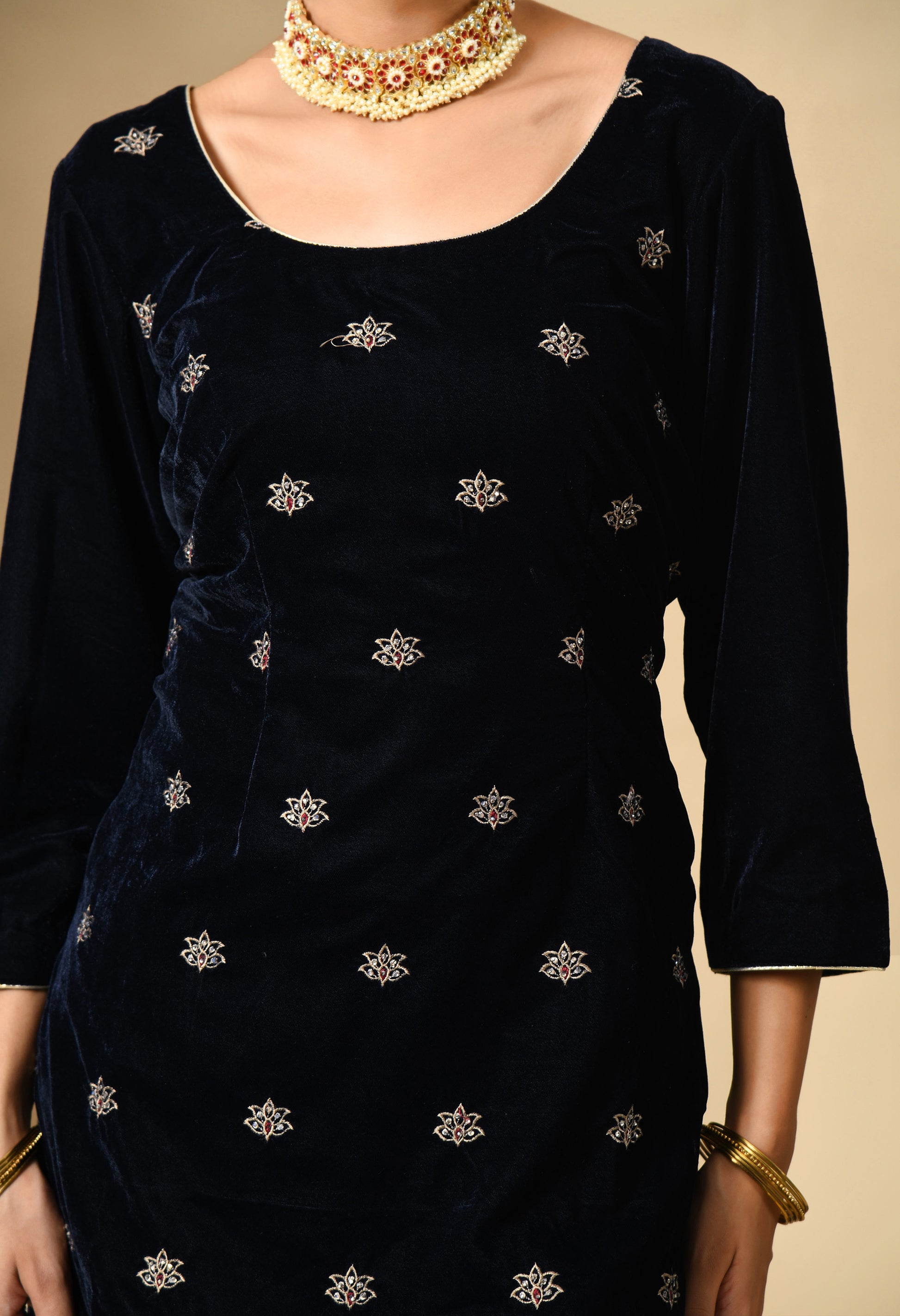 Embrace the essence of tradition with our navy blue hue Kurta Set, featuring a lush velvet dupatta, a richly embroidered velvet kurta, and a matching velvet bottom. The delicate zardozi, thread, and crystal accents add a refined, timeless touch.