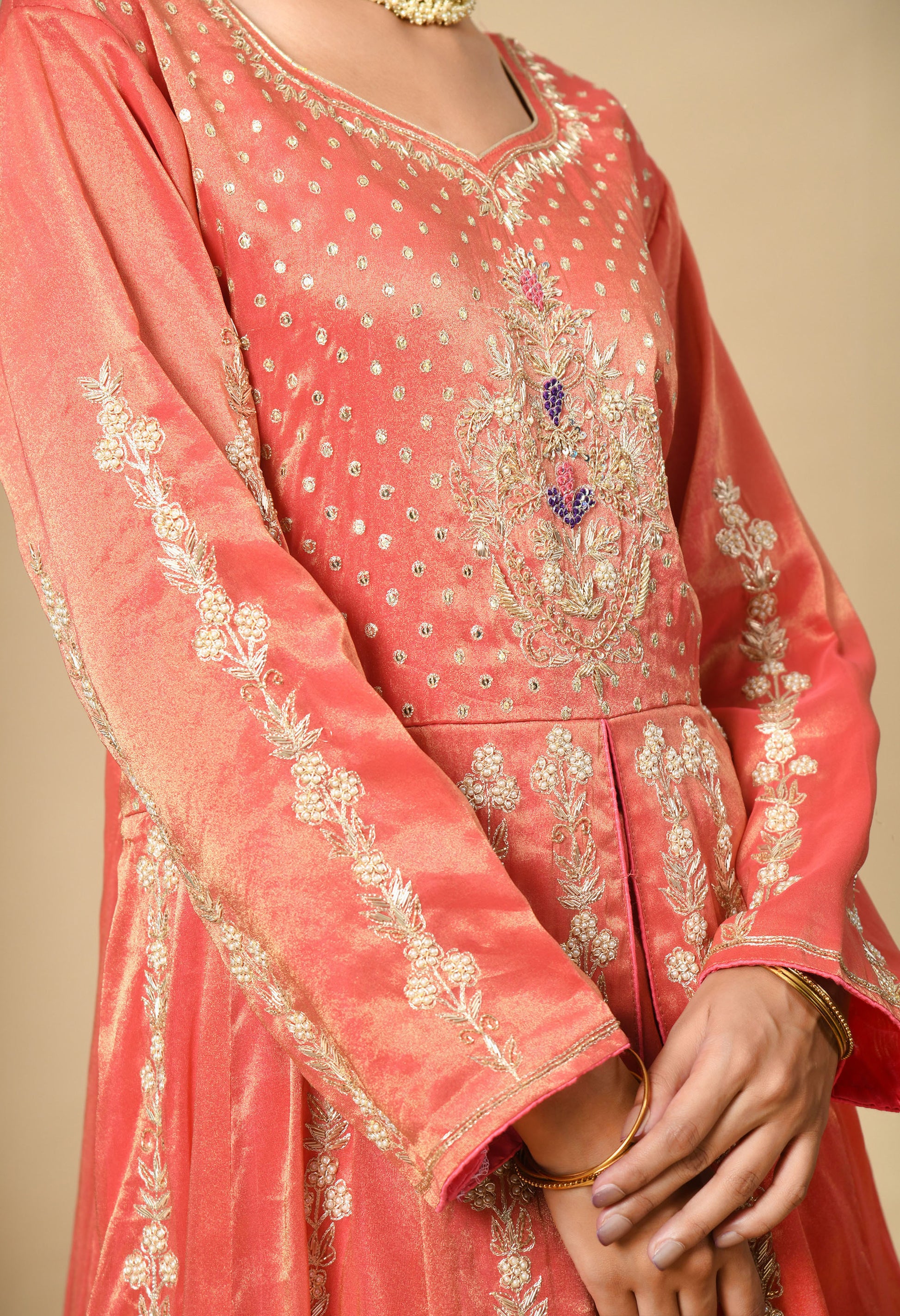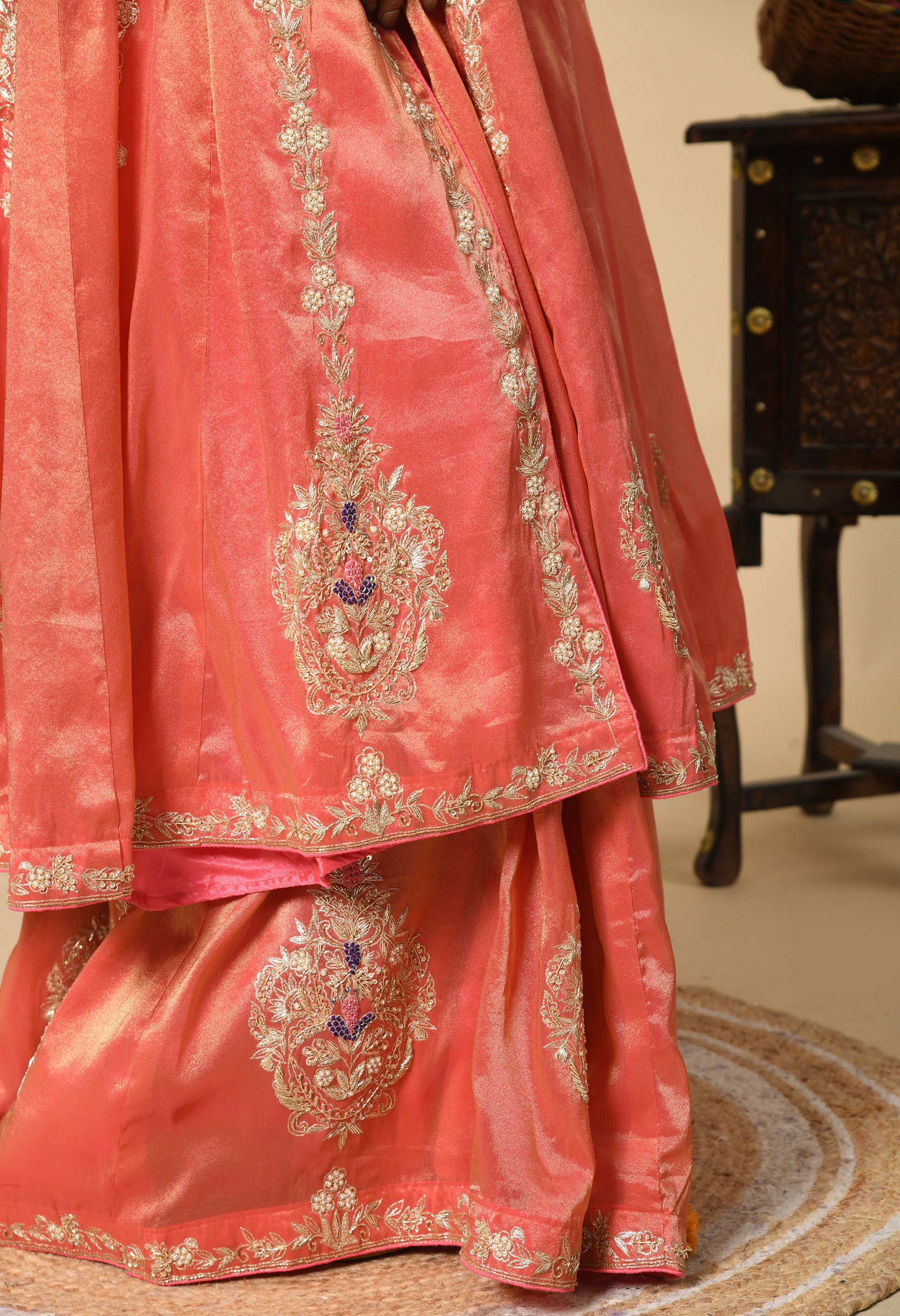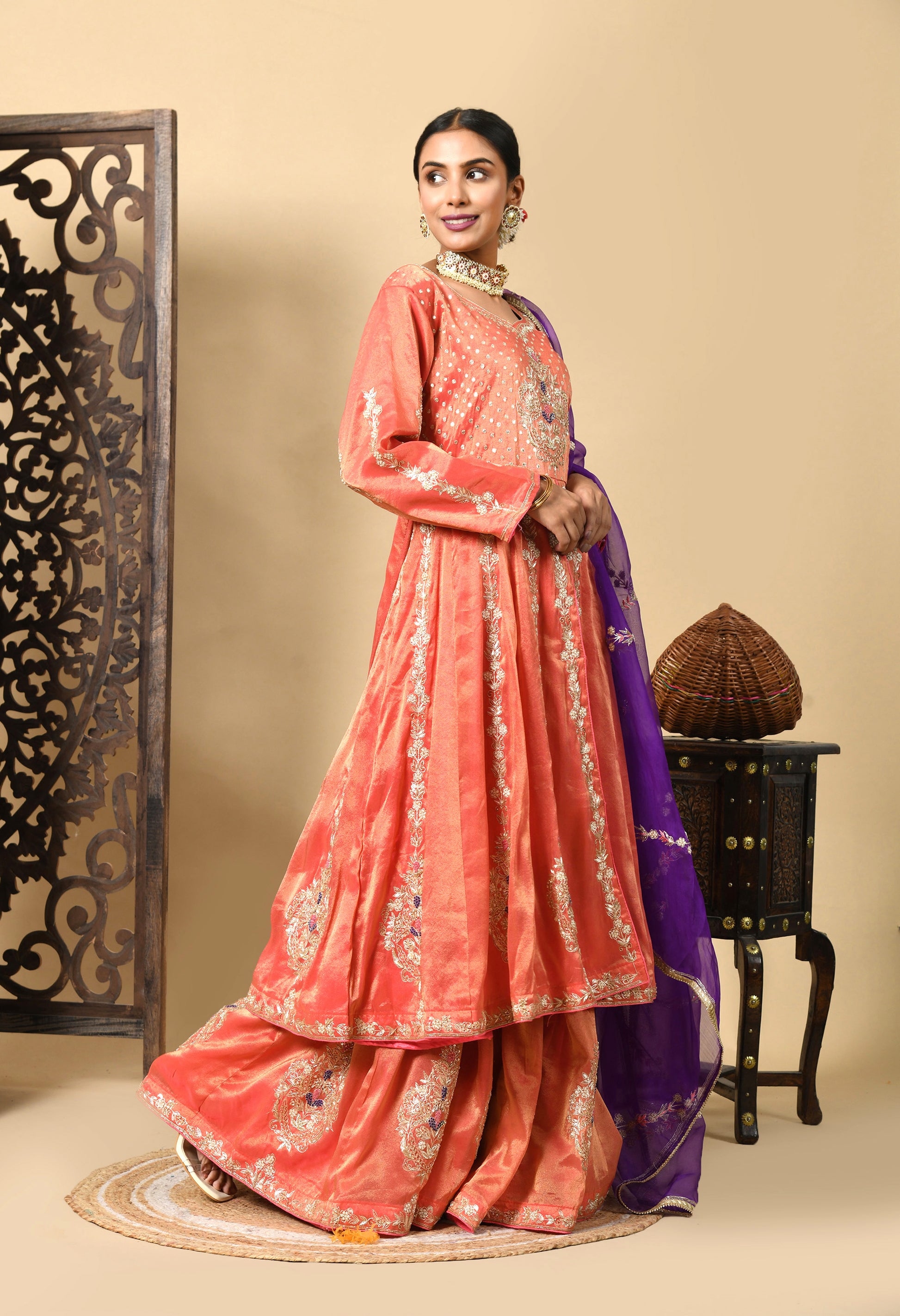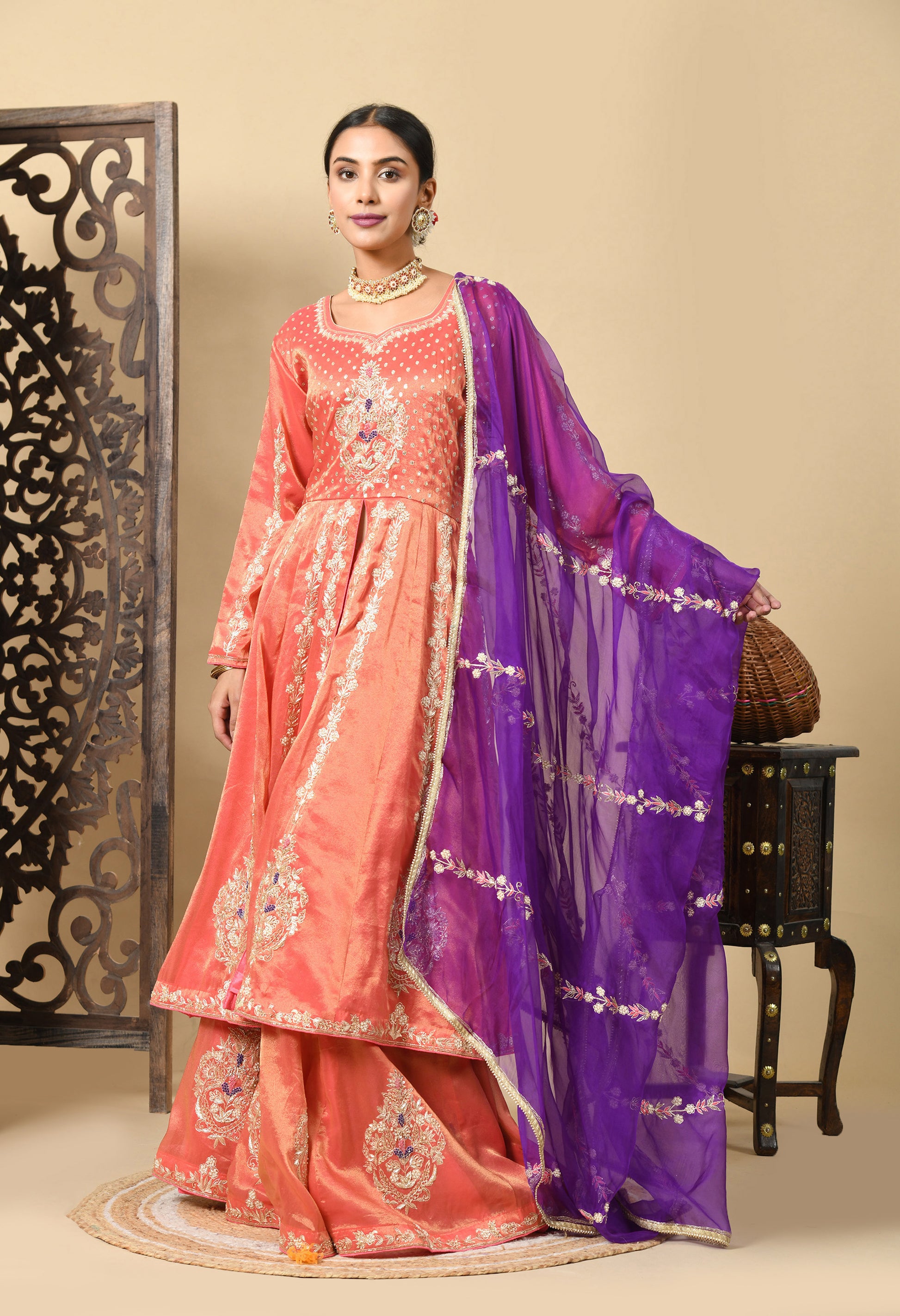 Redefine elegance with our striking orange Anarkali Set, complete with a breezy purple contrast organza dupatta, a detailed embroidered tissue organza anarkali, and a tailored tissue organza skirt. The zardozi, dabka, sequin, and thread embellishments exude sophistication.