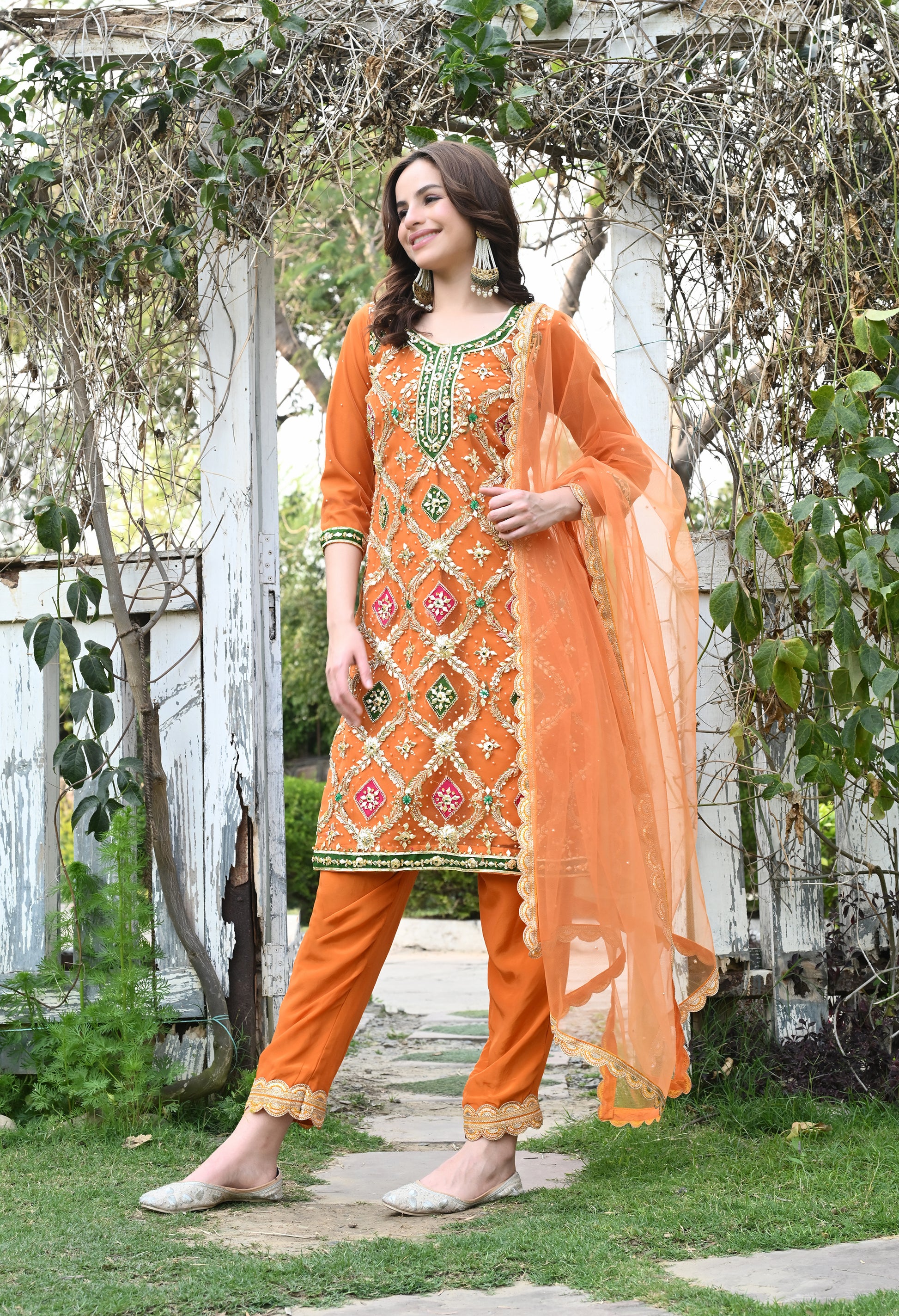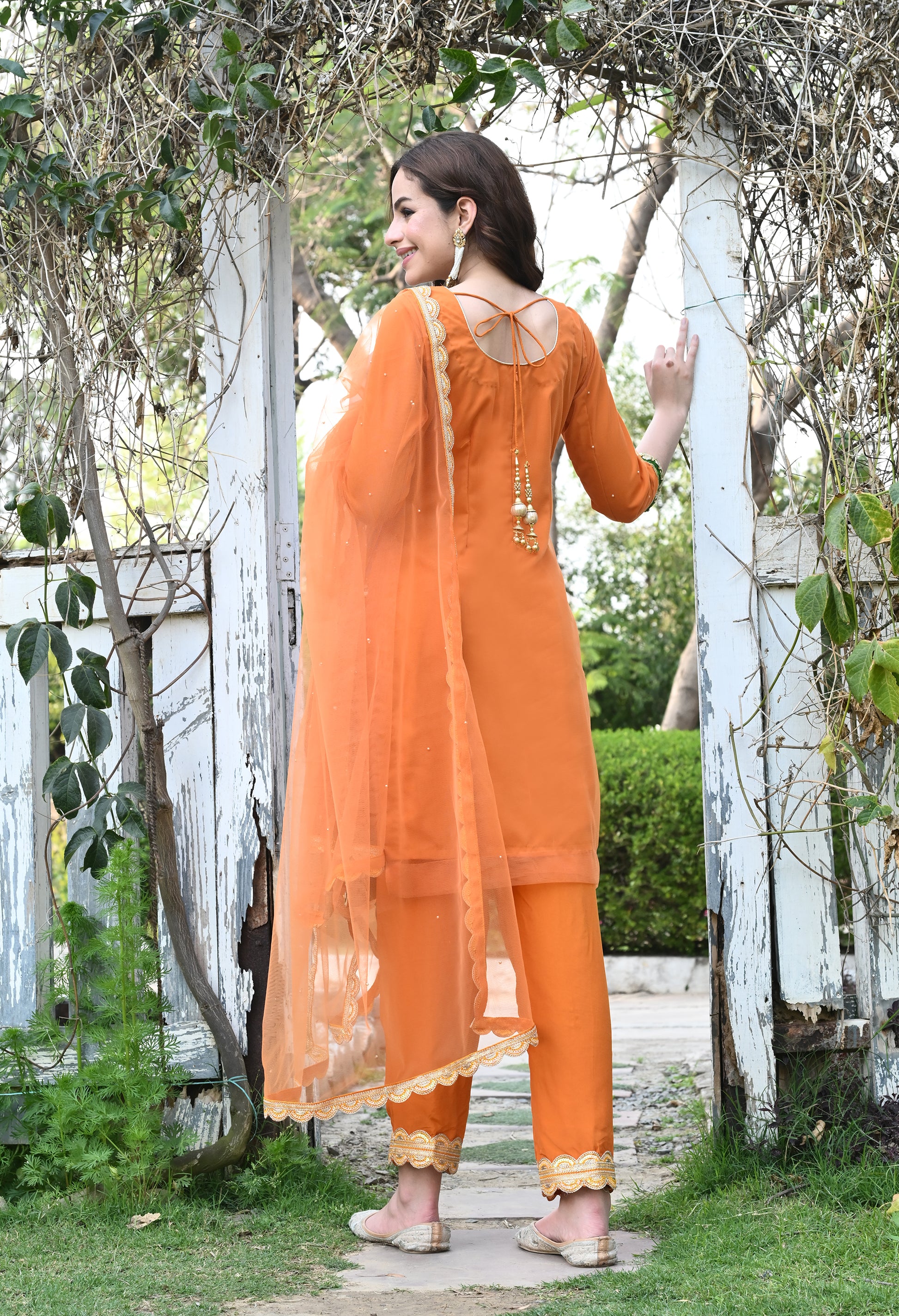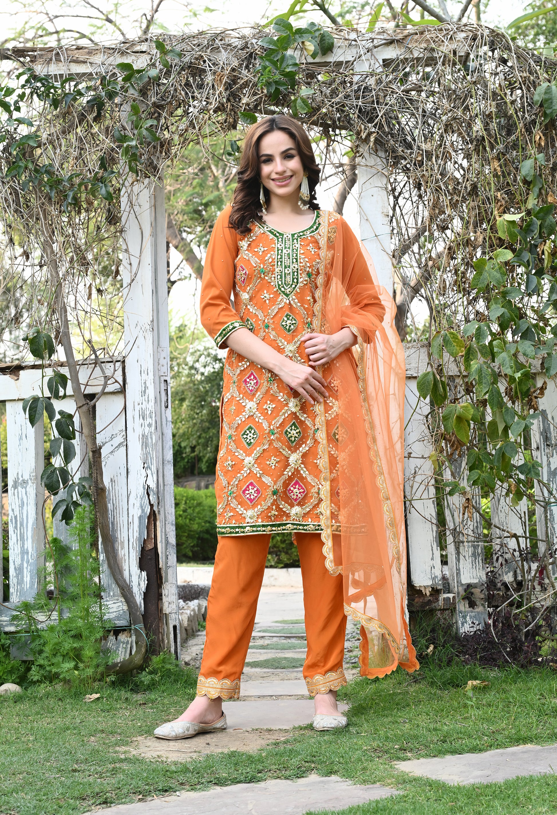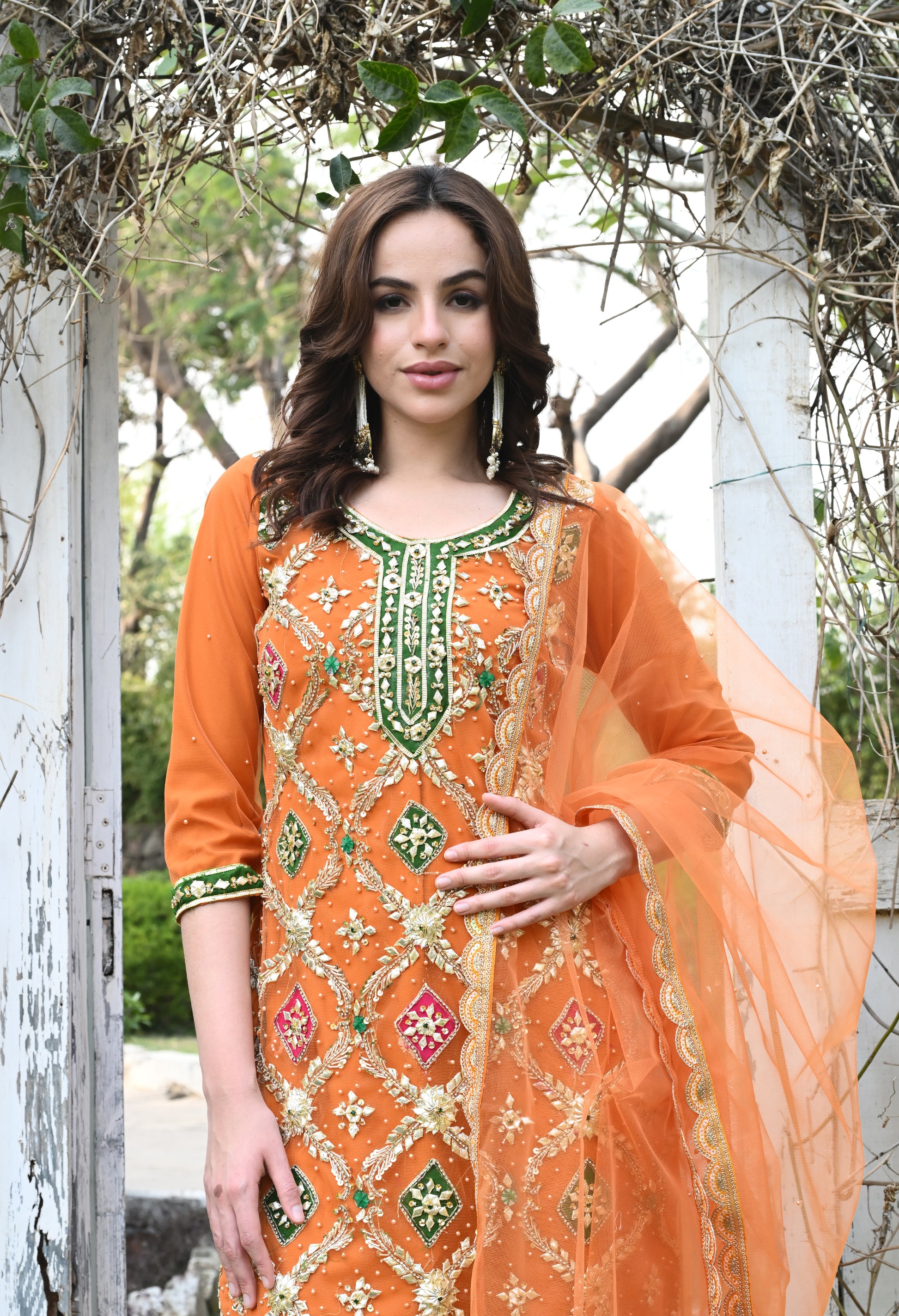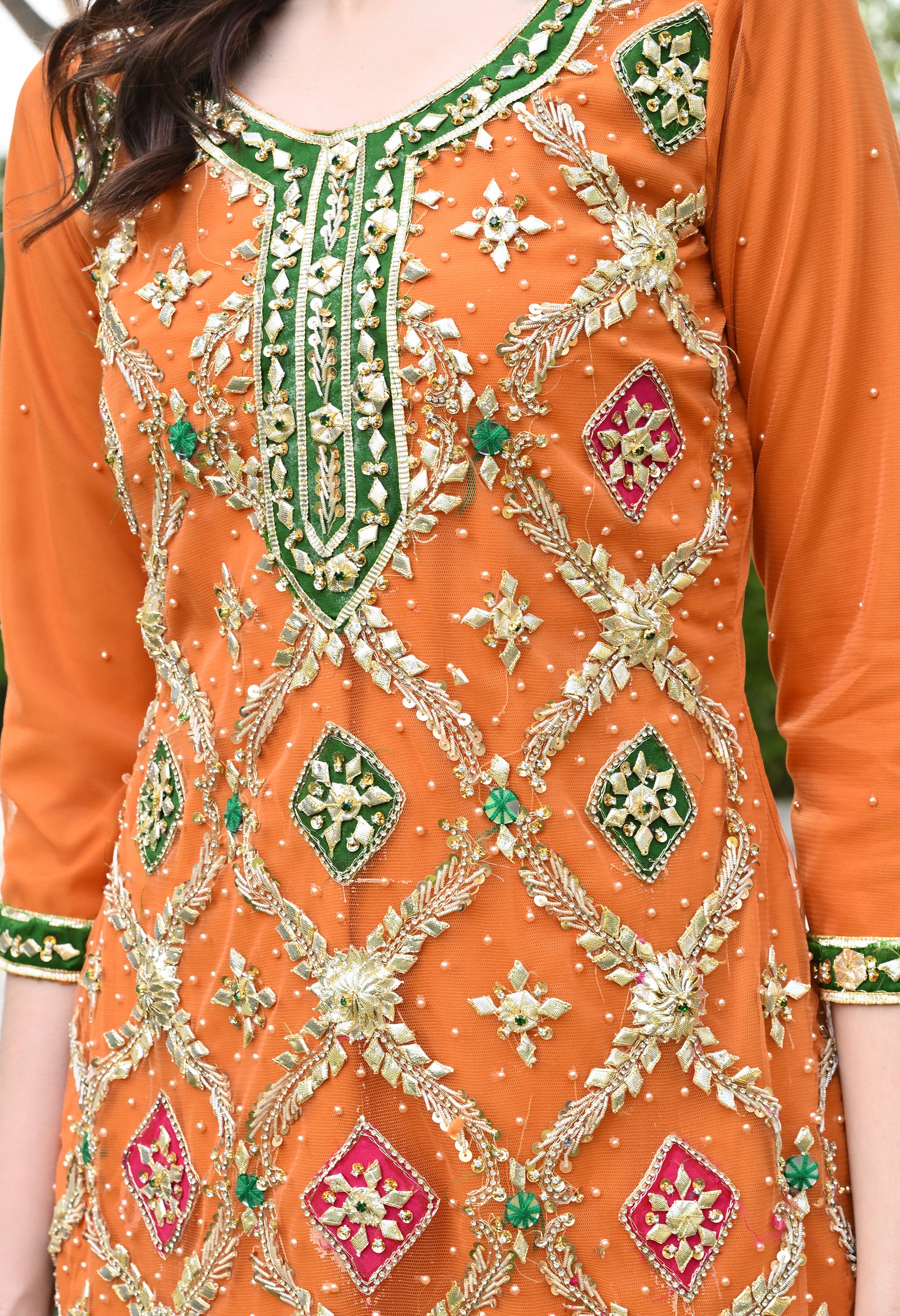 Stunning orange net kurta set with crystal, applique, and gotta embroidery. A stunning match for Haldi or festive gatherings.