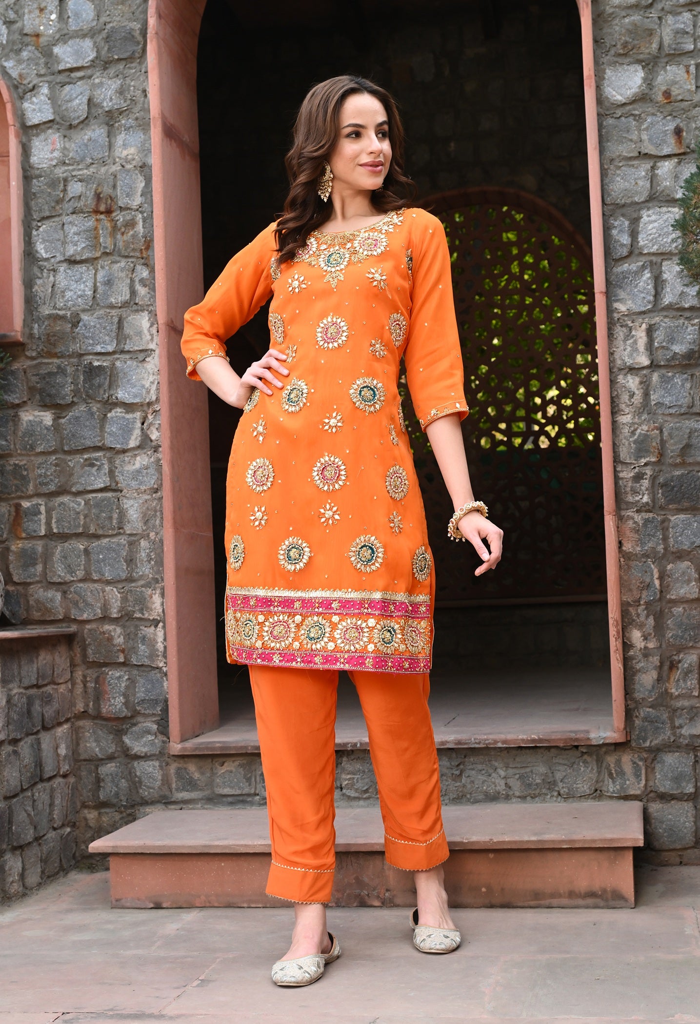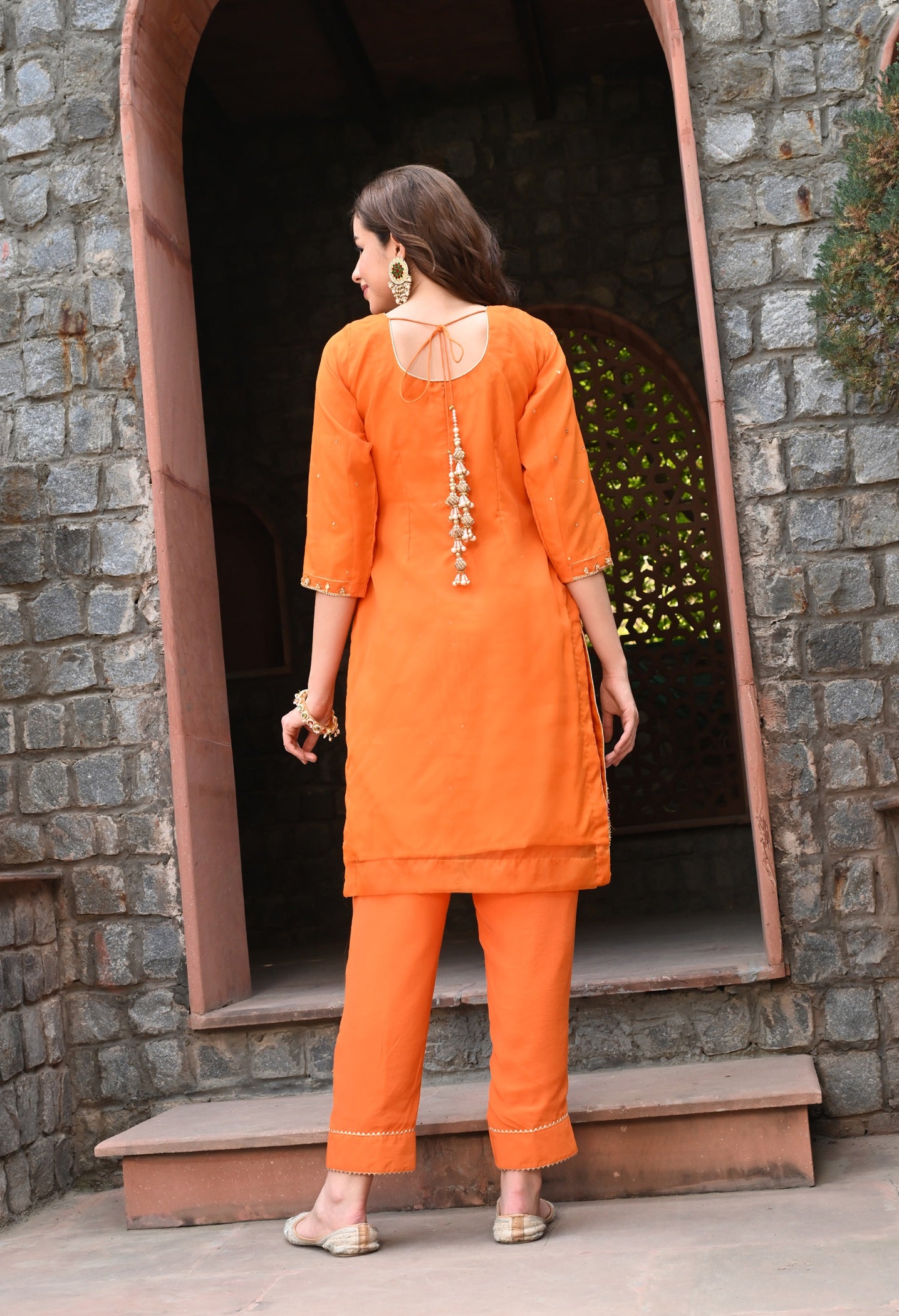 Orange Organza Kurta Set with Pearl Embroidery