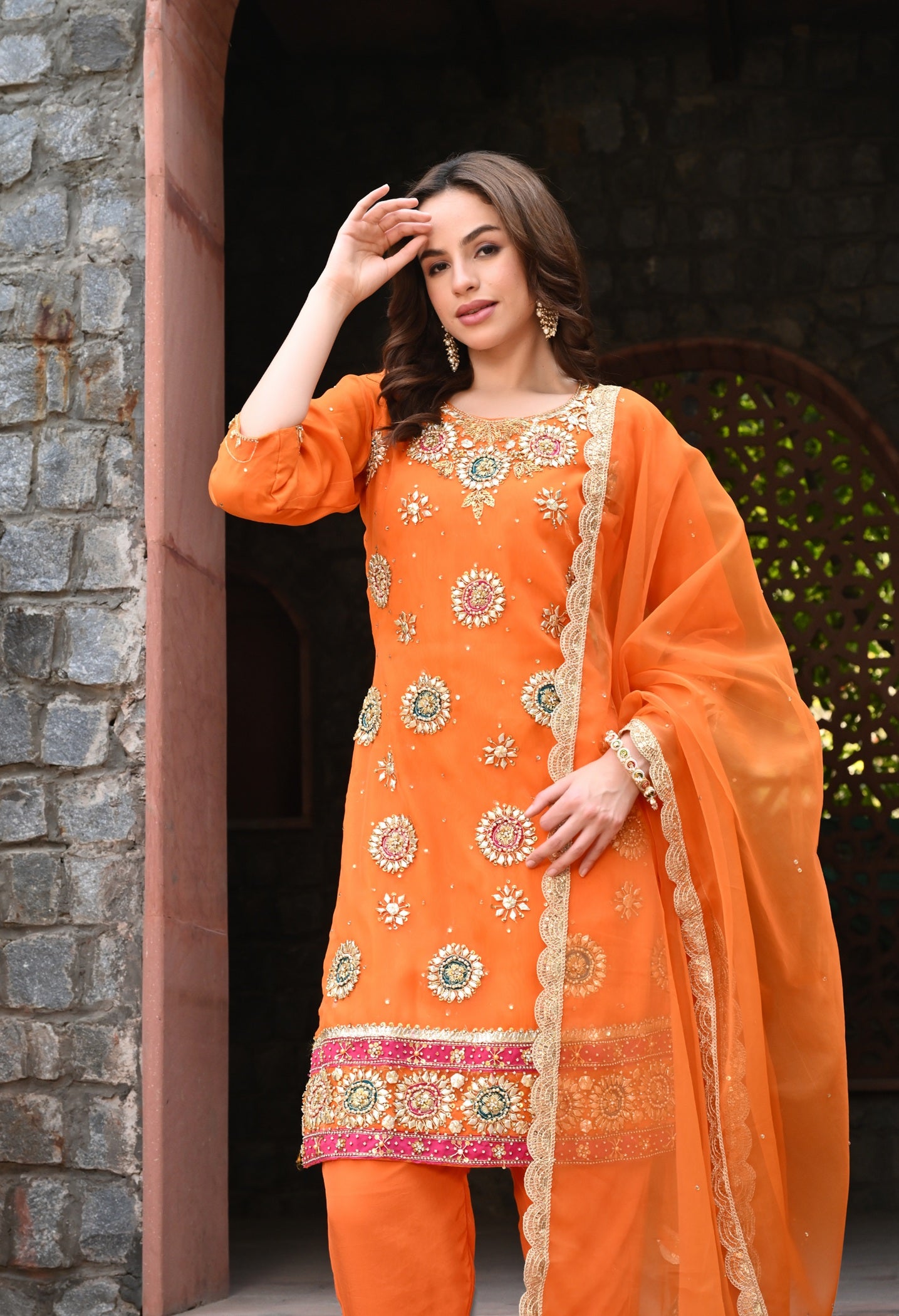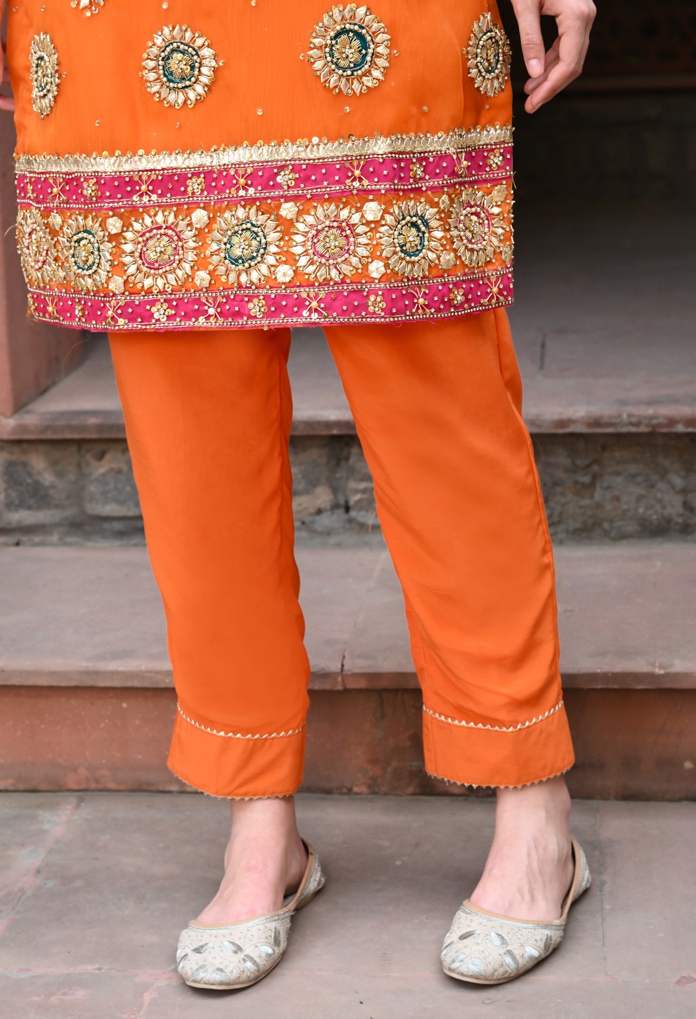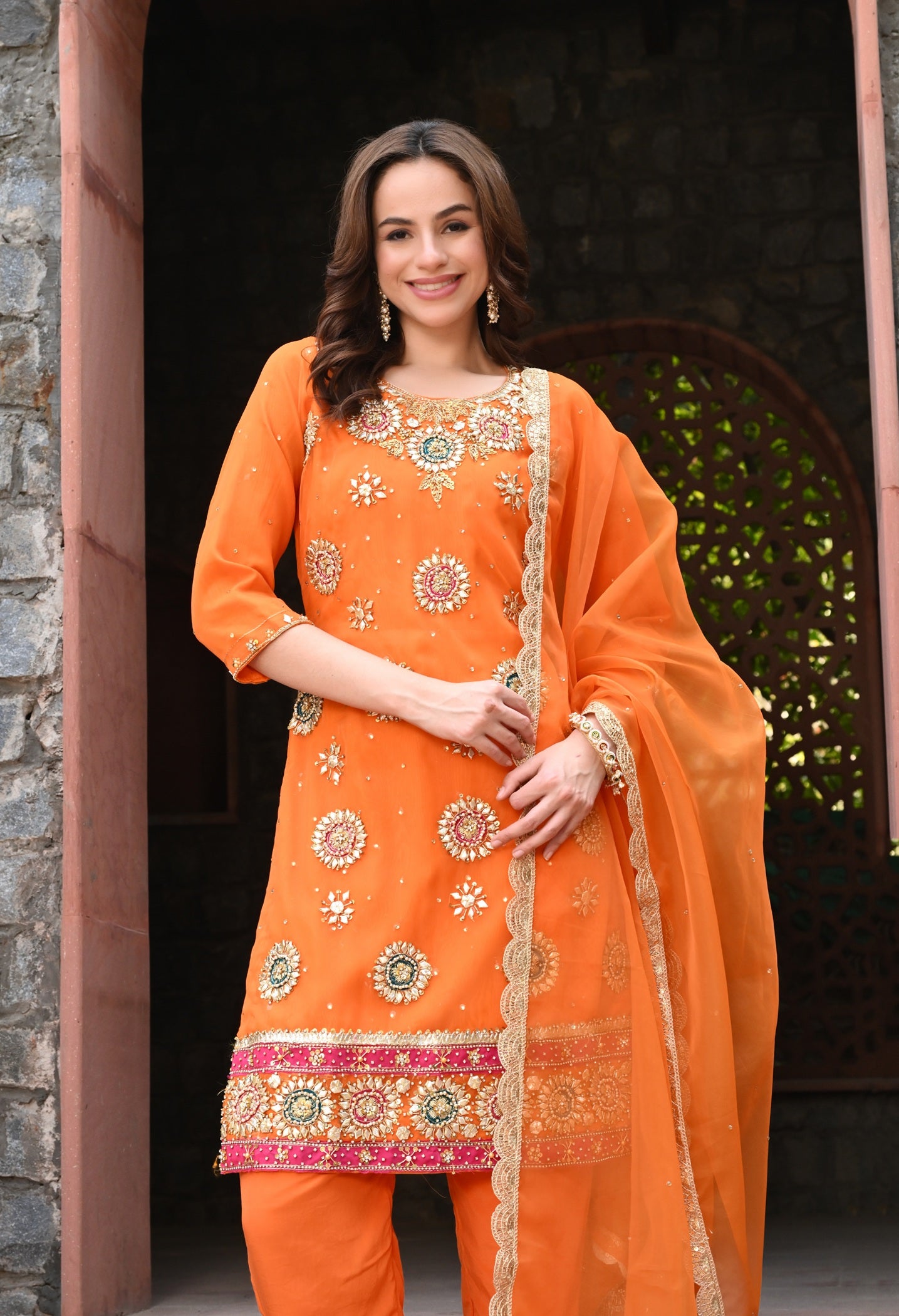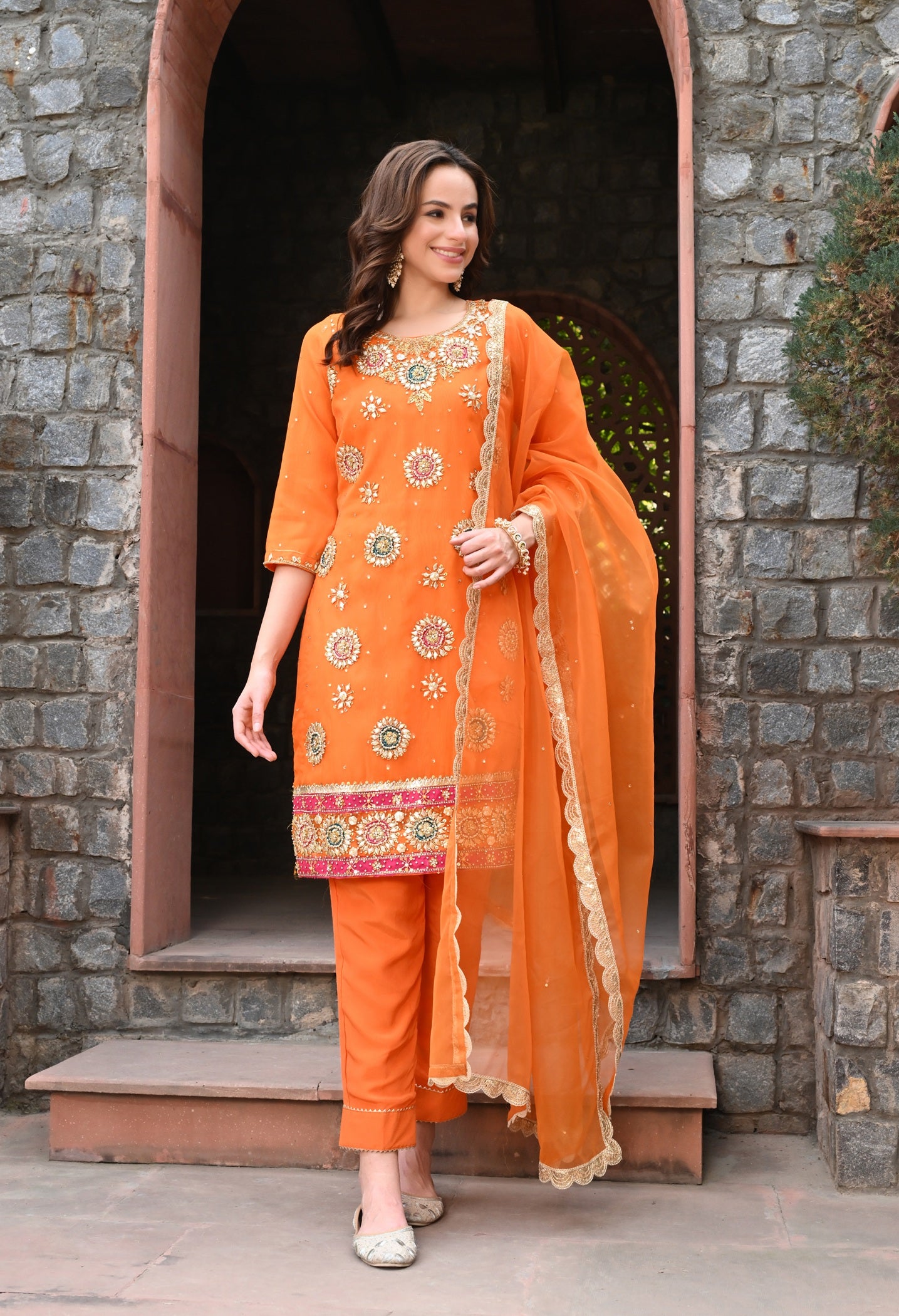 Make an entrance in this orange organza kurta set, enriched with Gota , Dabka, pearl and crystal embroidery. For festive moments that call for radiance.