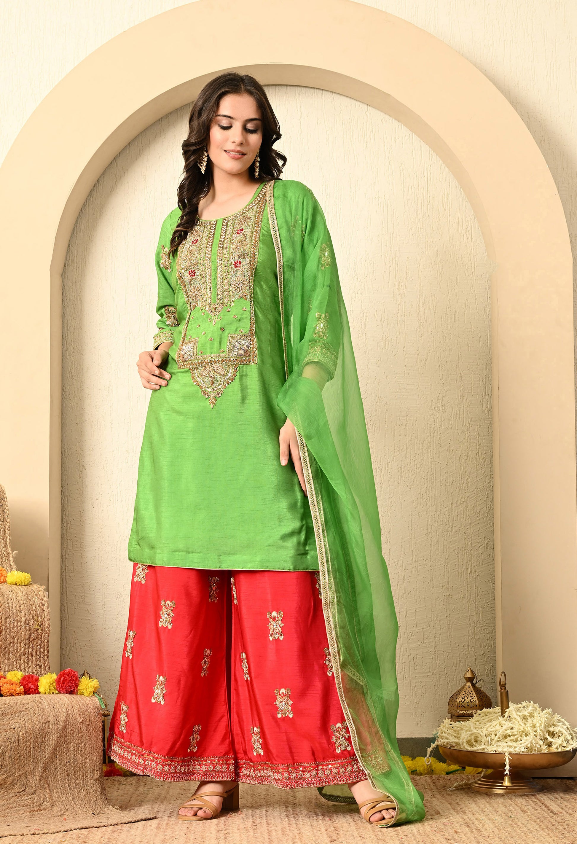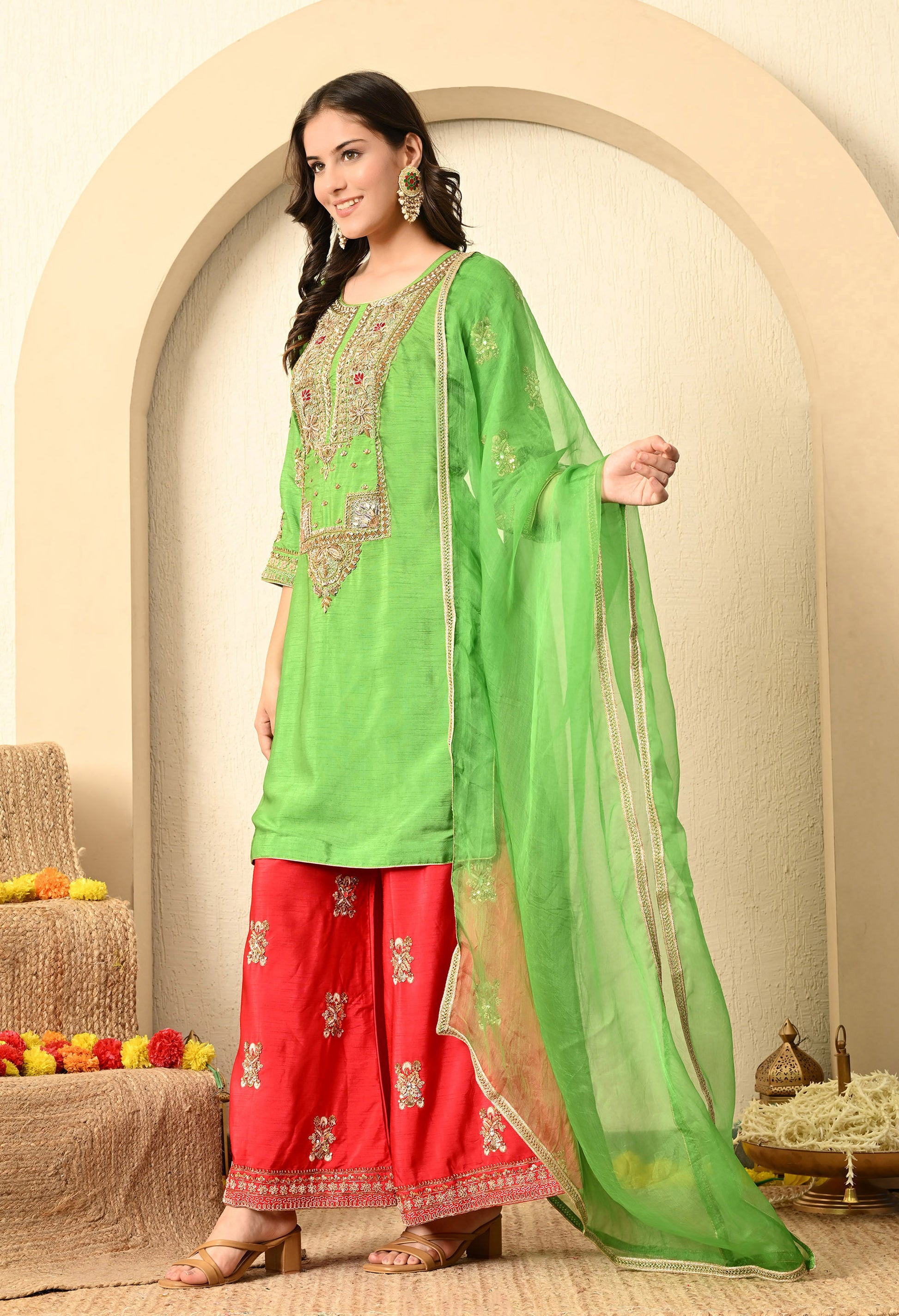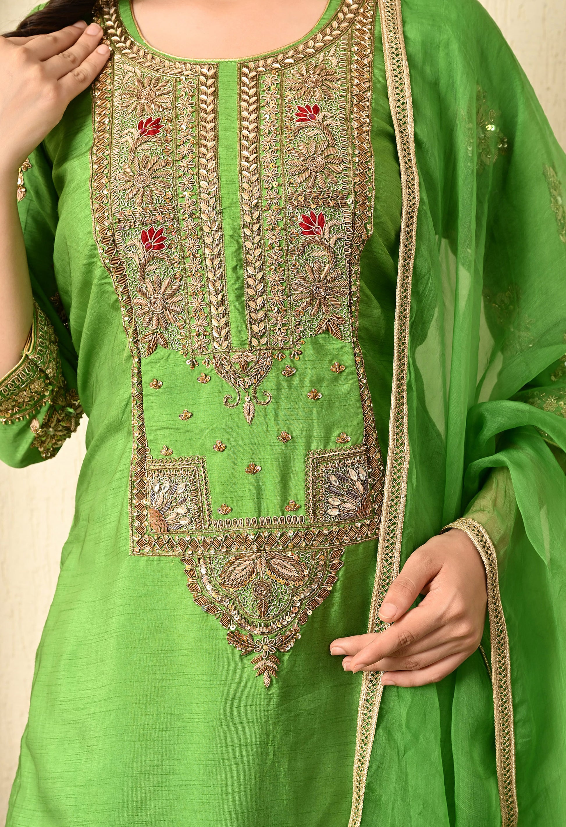 Unveil your inner queen with our parrot green hue kurta ensemble. The silk kurta and straight plazzo, accented with an organza dupatta, feature Zardozi, Stone, and Sequemnce work, with delicate embroidery enhancing your every move with grace.