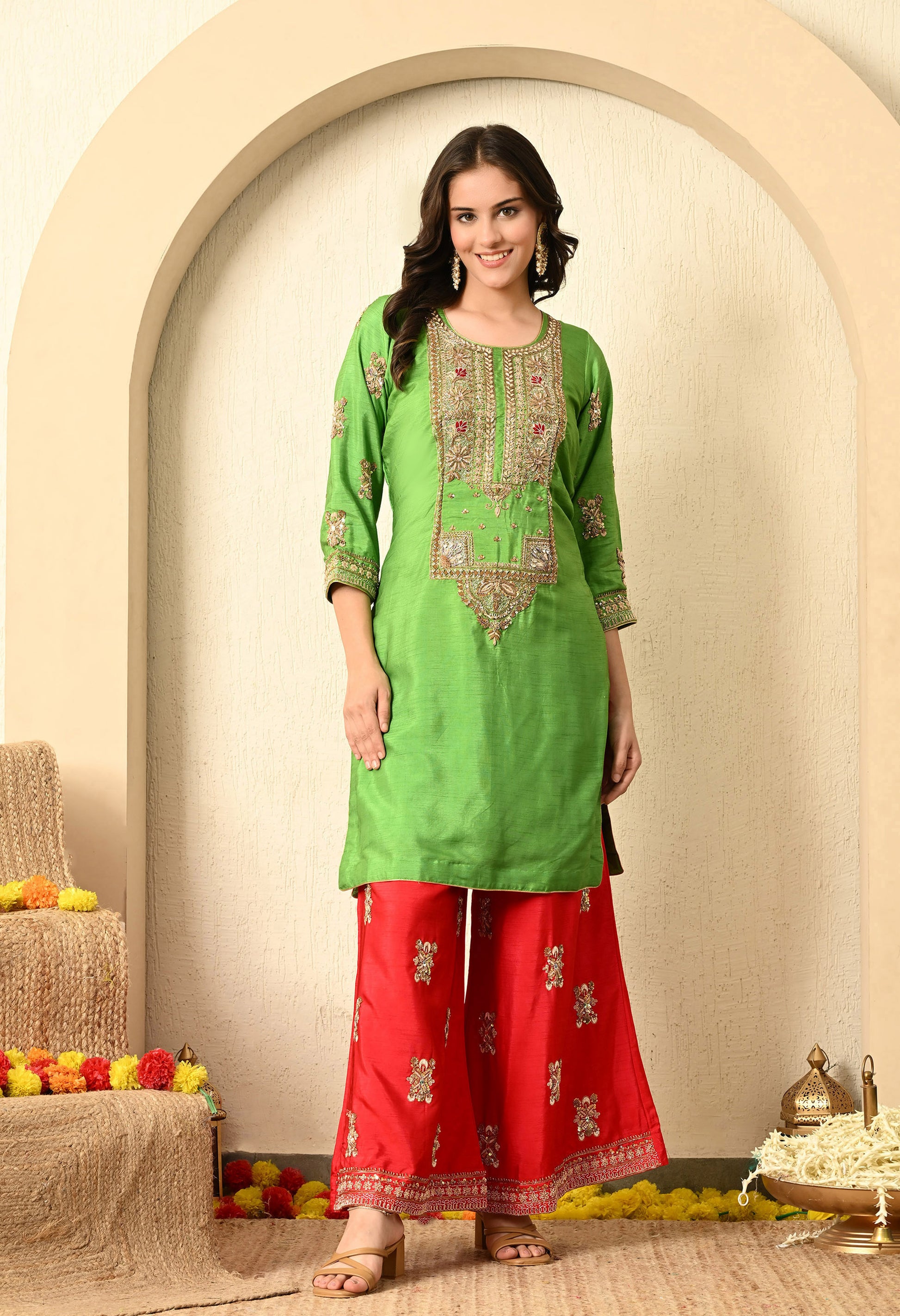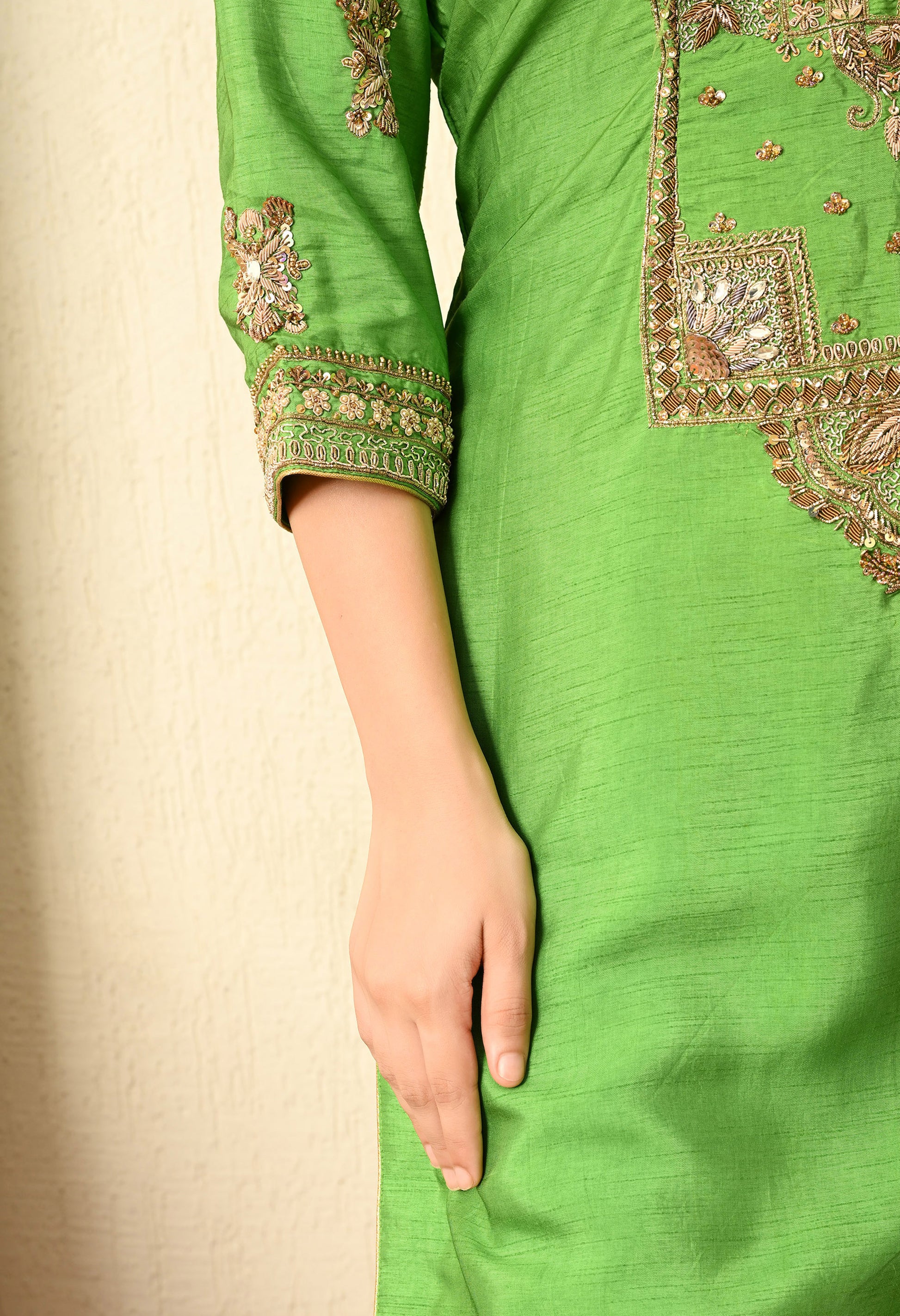 Parrot Green Kurta Set with Zardozi, Stone, and Sequence Work