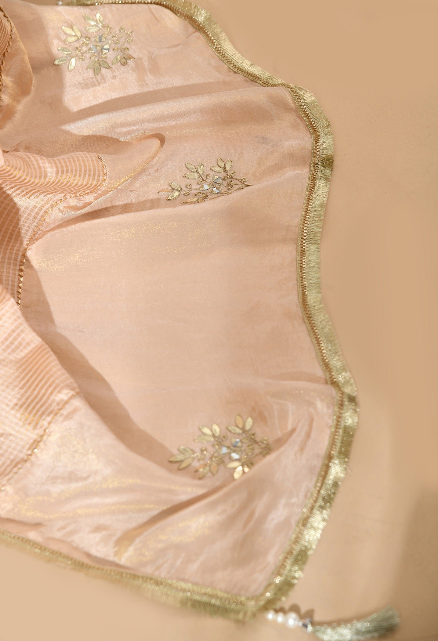 Glow softly in this peach tissue silk kurta set featuring rich gotta, mirror, and zardozi embroidery. Comes with a matching dupatta and crepe salwar. Tailored fit. Customisable. Dry-clean only.