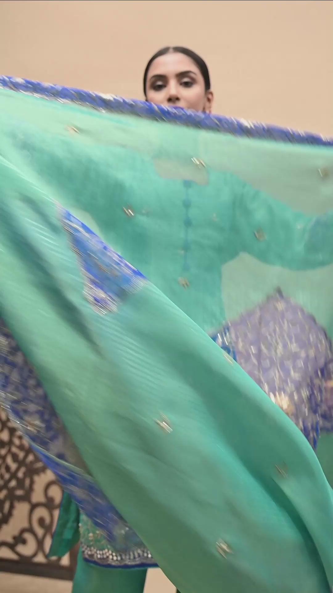 Channel effortless elegance with our peacock green Kurta Set, paired with a flowing organza dupatta, an intricately detailed tissue organza kurta, and a complementing tissue organza bottom. The exquisite zardozi, dabka, sequin, and thread work add a regal finish.