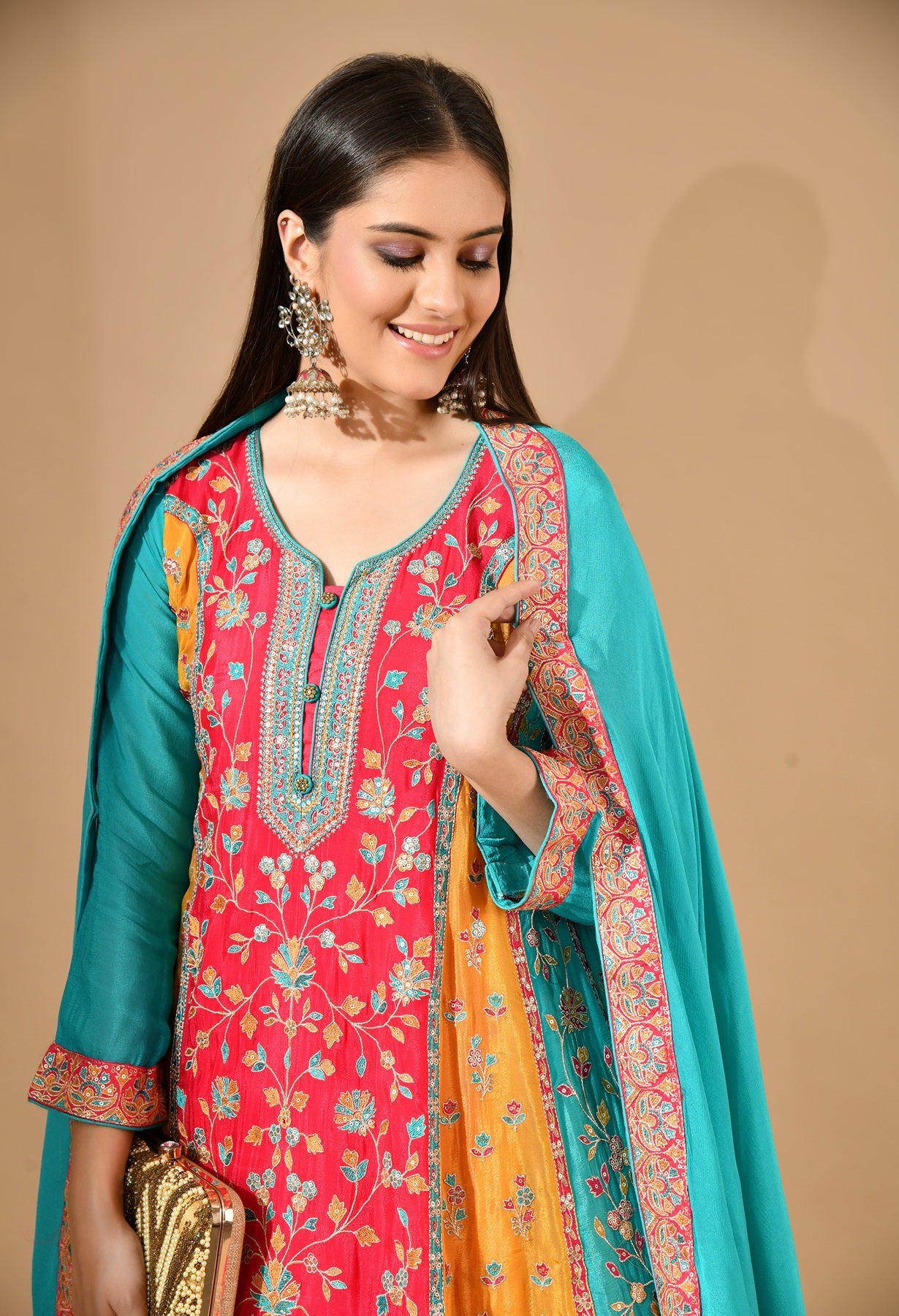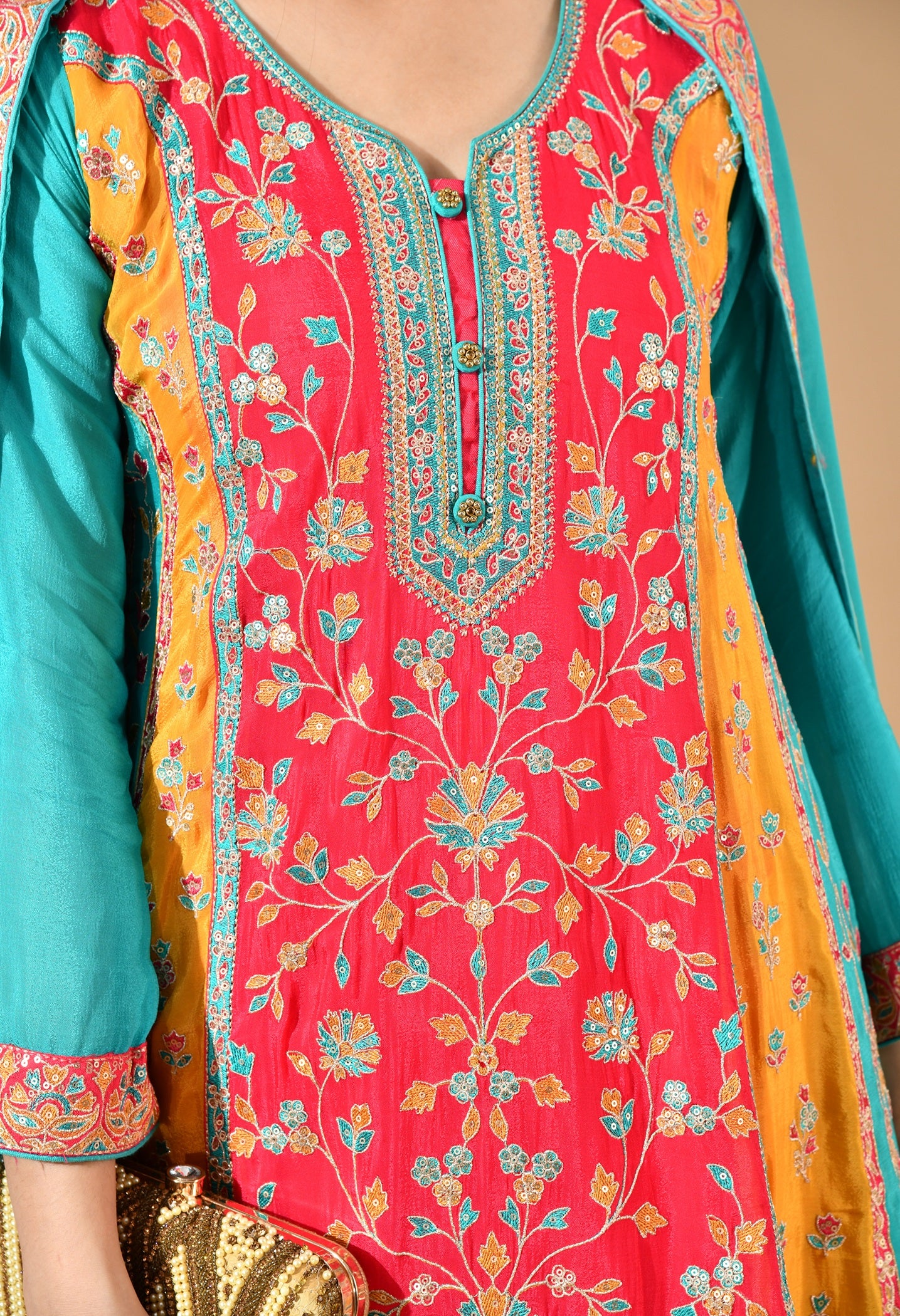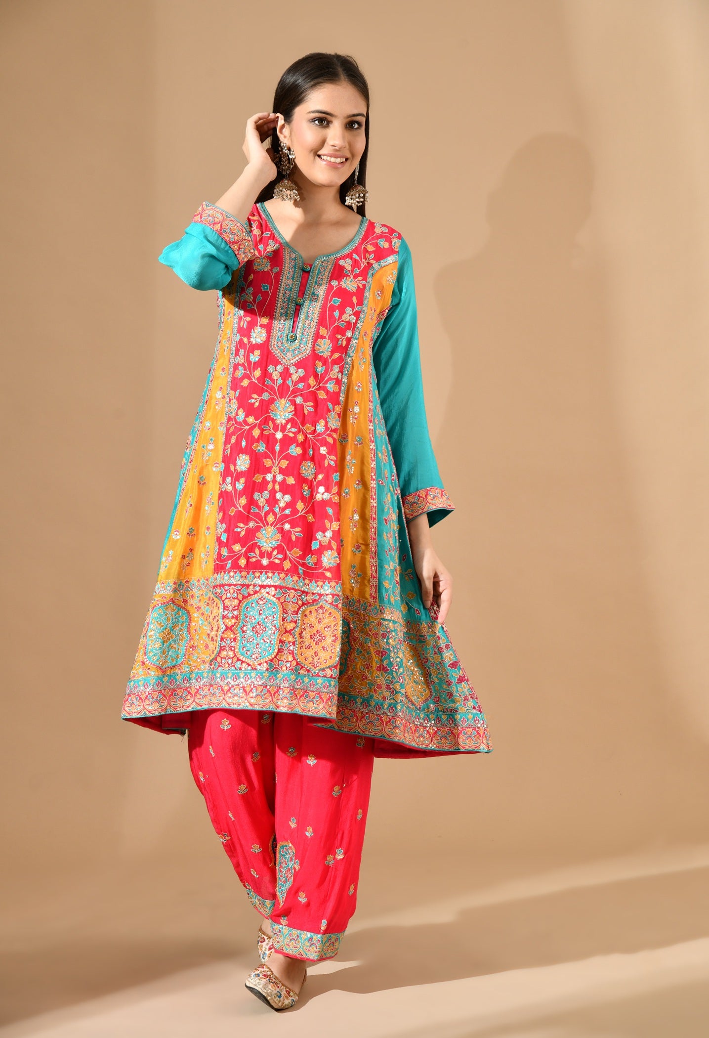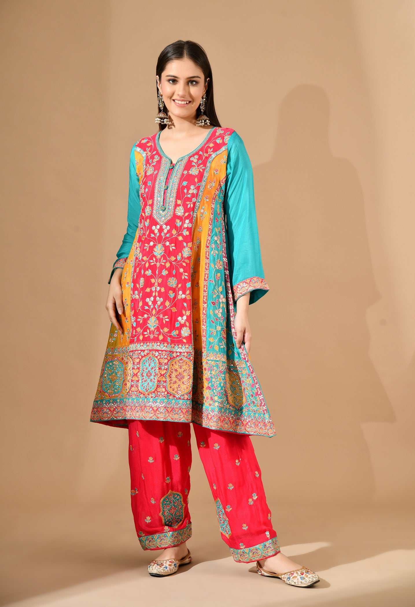 - Crafted in rich Chinon, this multicolour dark pink kurta set is a festive favourite with vibrant thread, zardozi, and sequin embroidery.