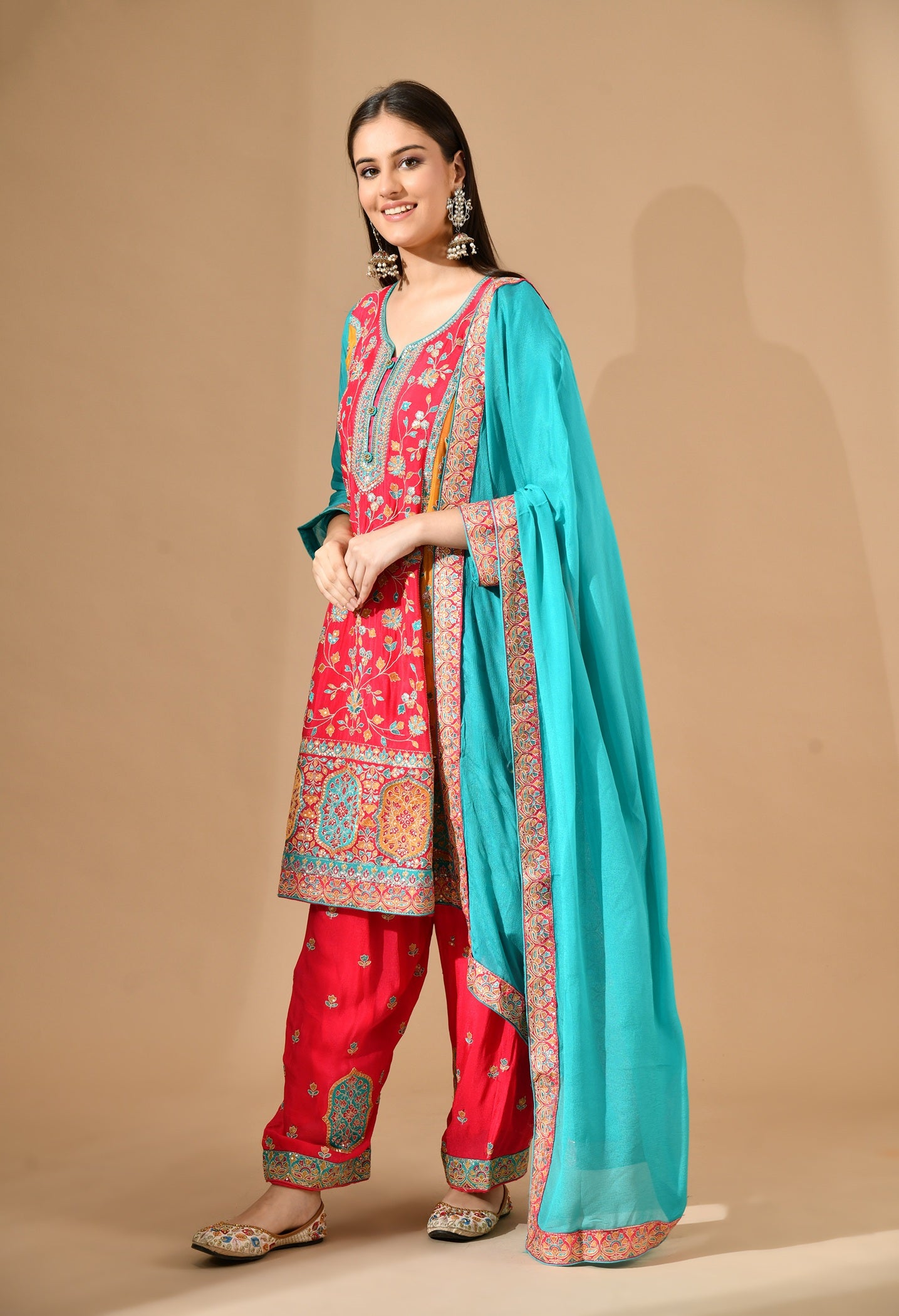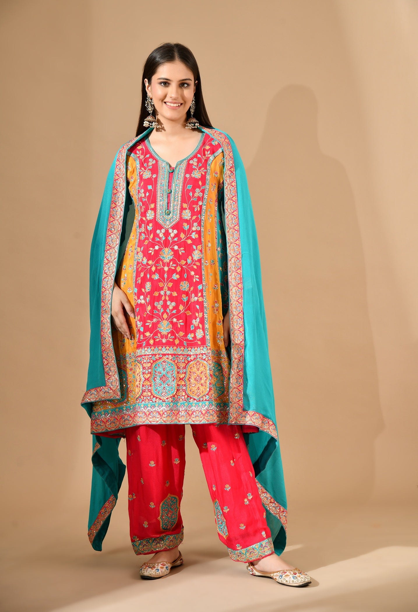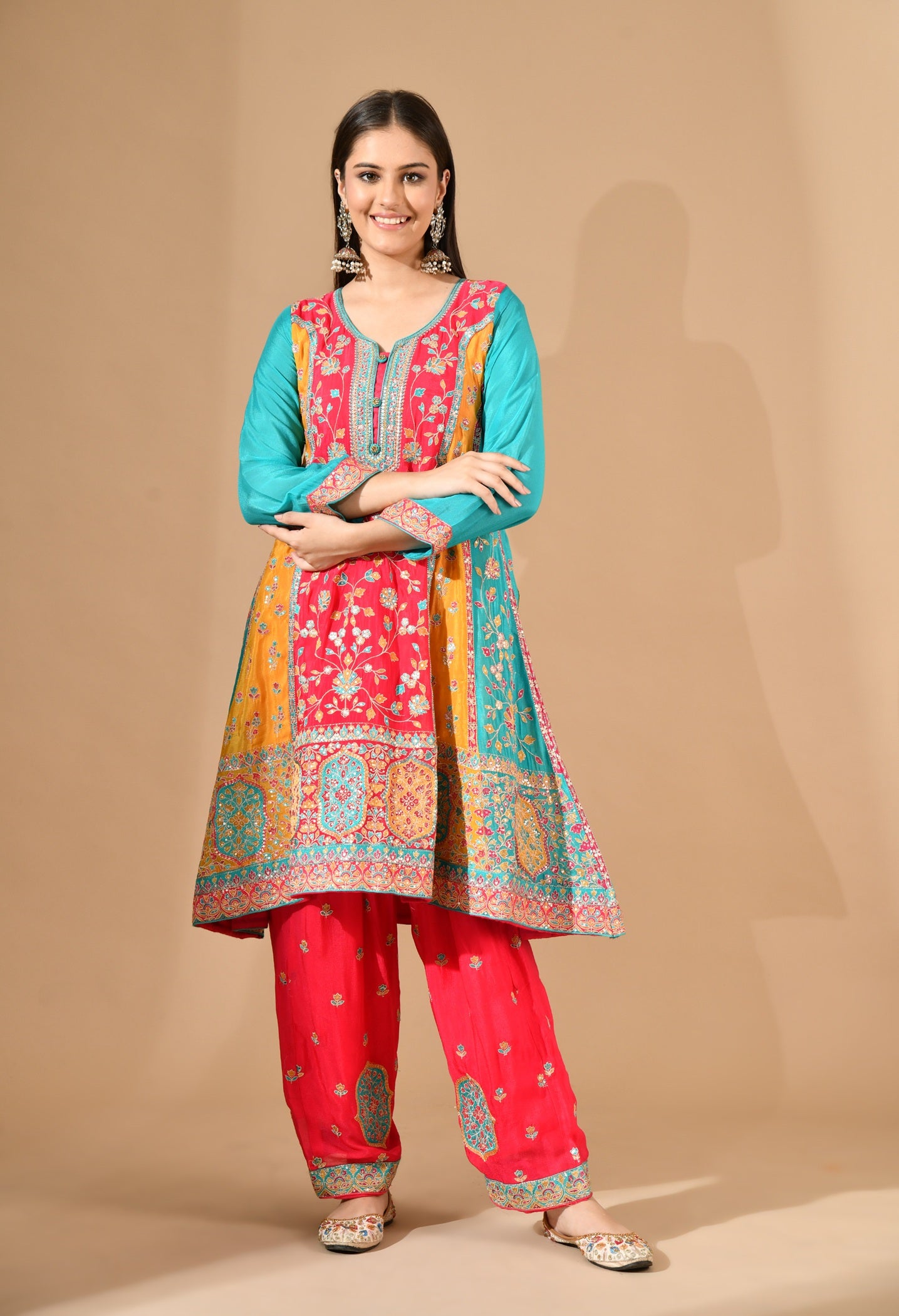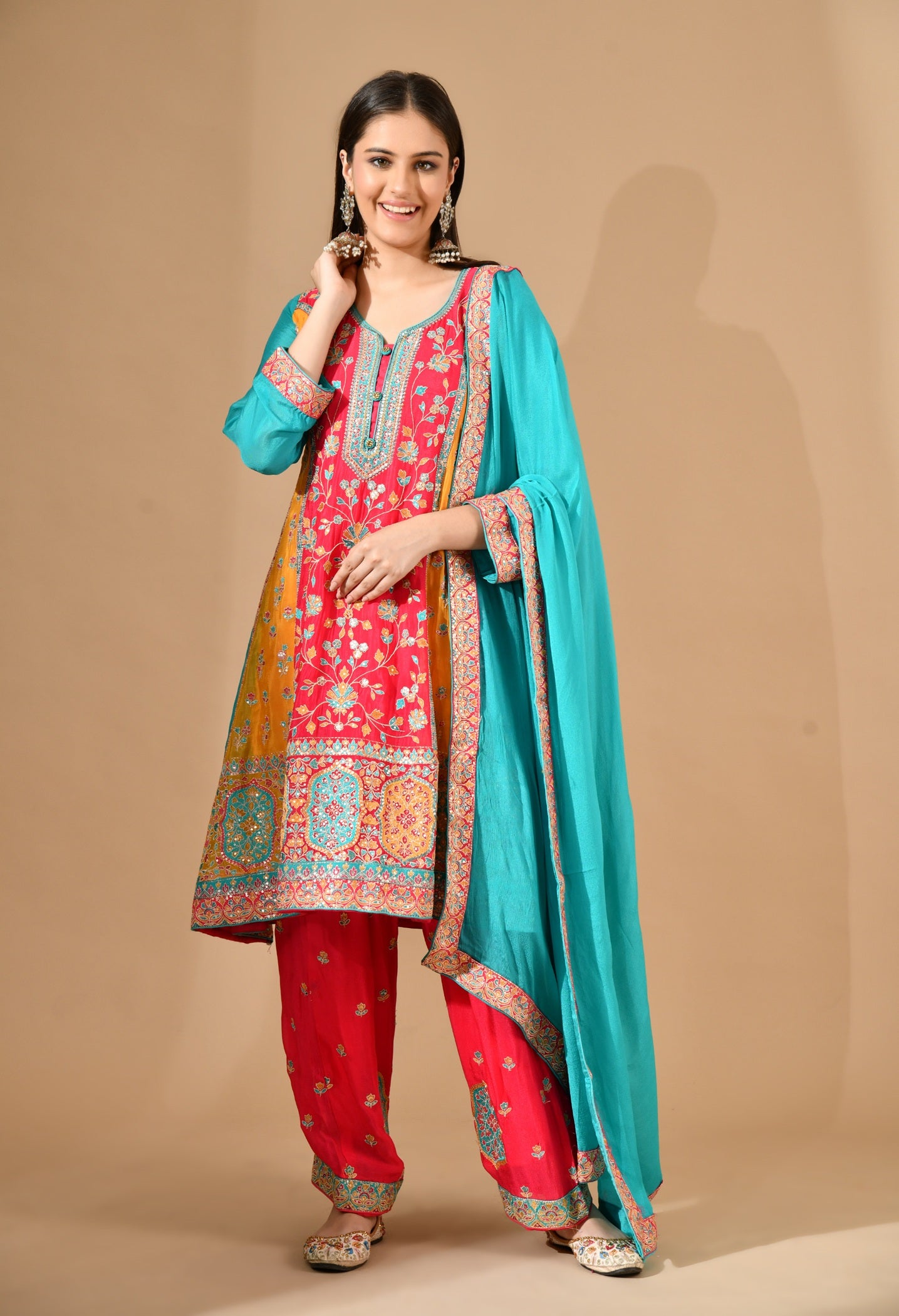 - Crafted in rich Chinon, this multicolour dark pink kurta set is a festive favourite with vibrant thread, zardozi, and sequin embroidery.