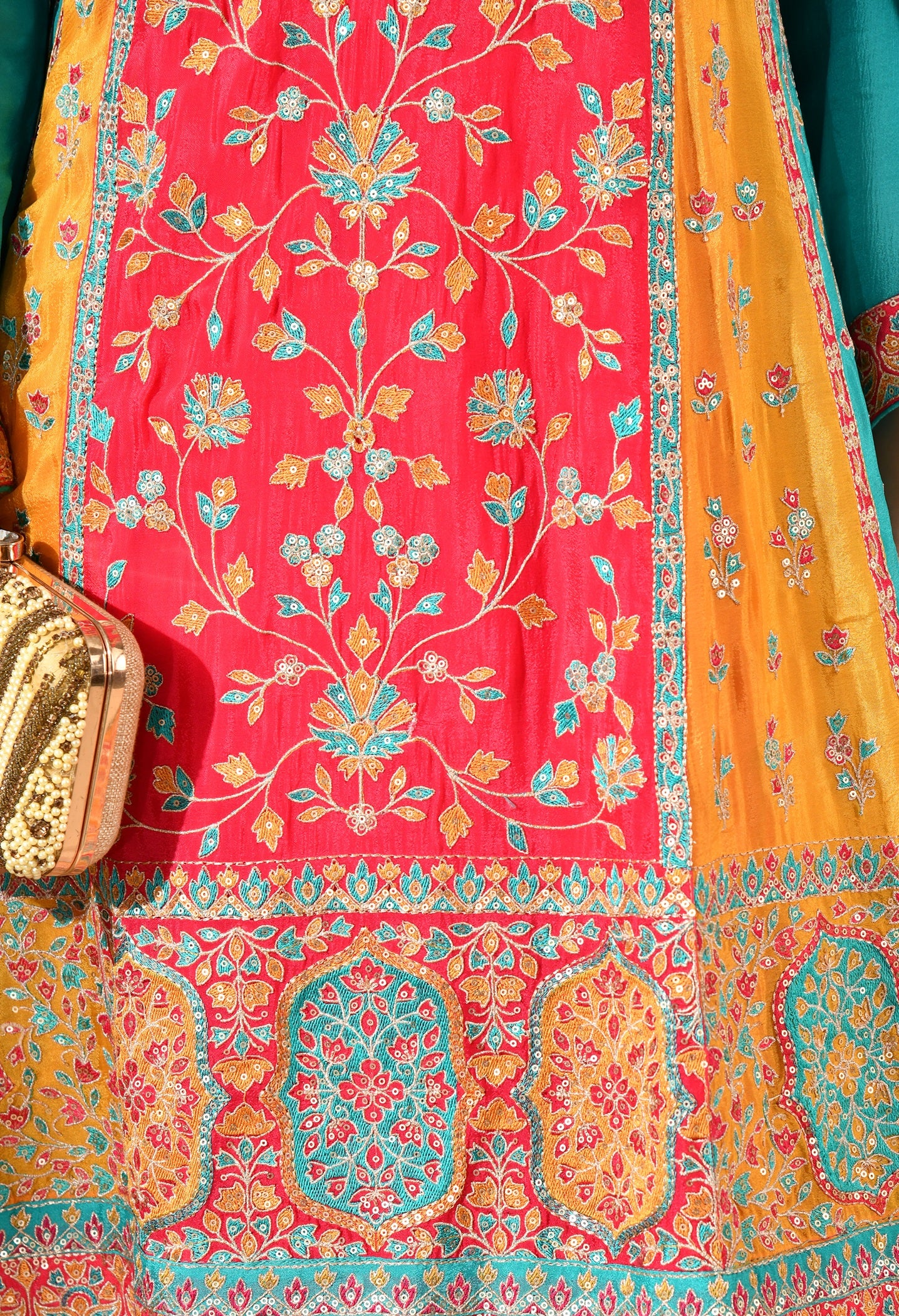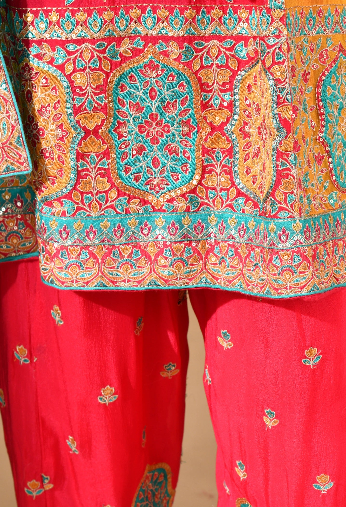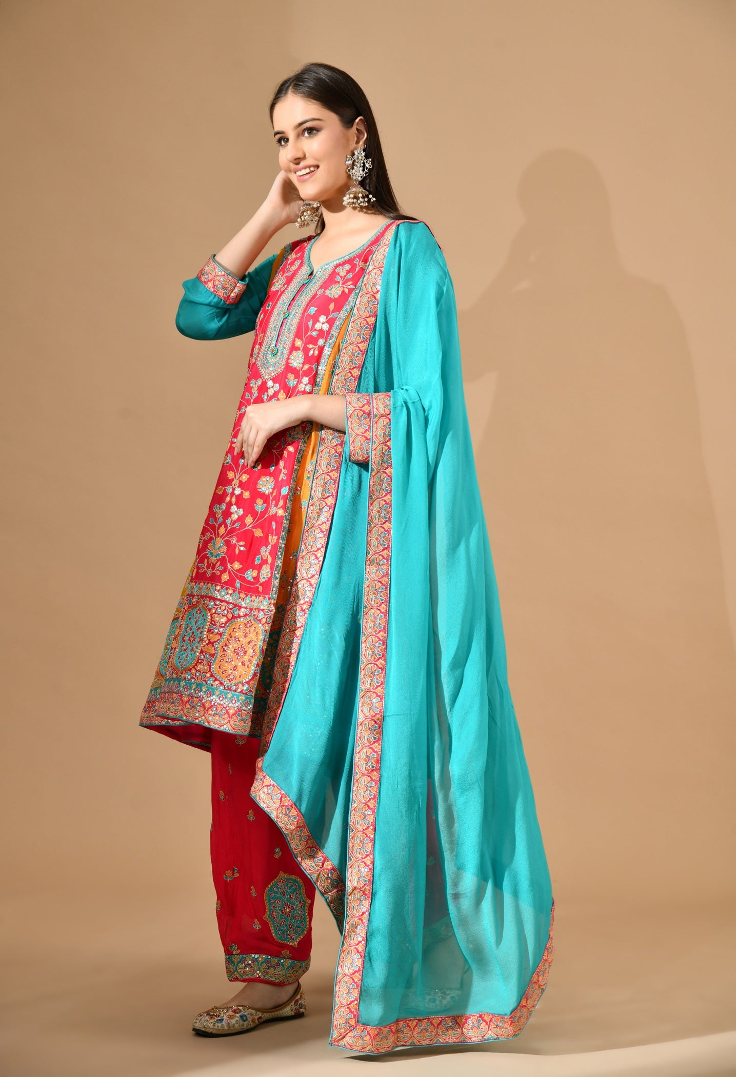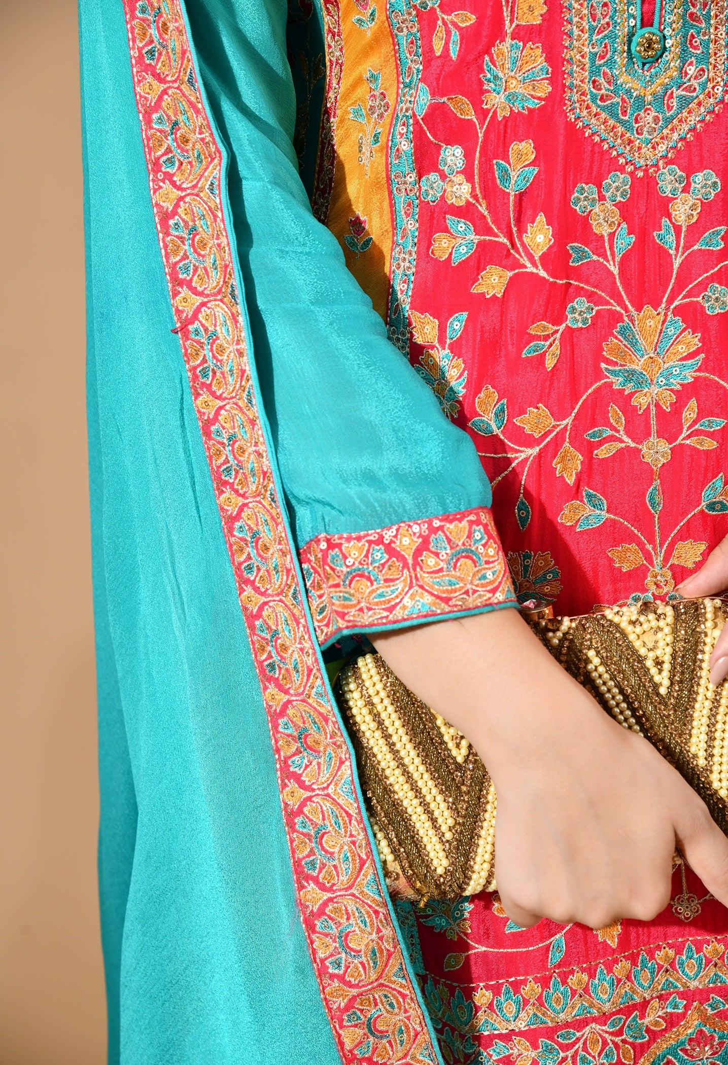 - Crafted in rich Chinon, this multicolour dark pink kurta set is a festive favourite with vibrant thread, zardozi, and sequin embroidery.