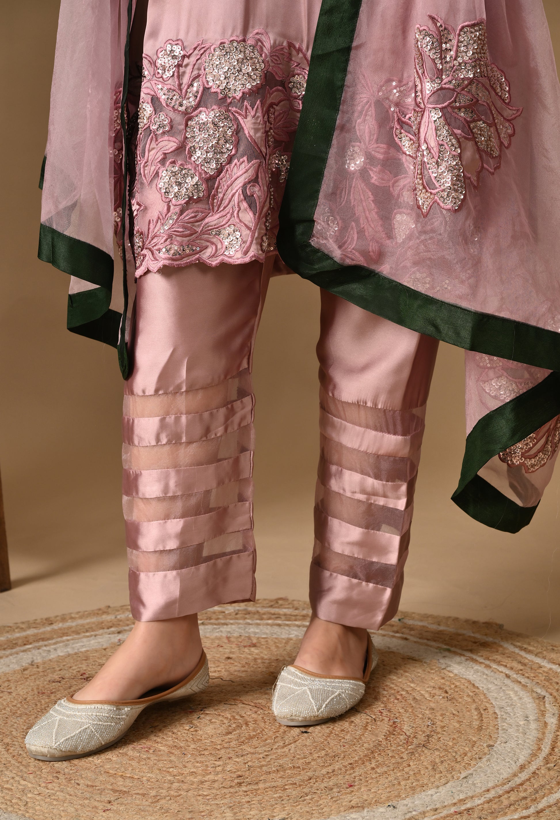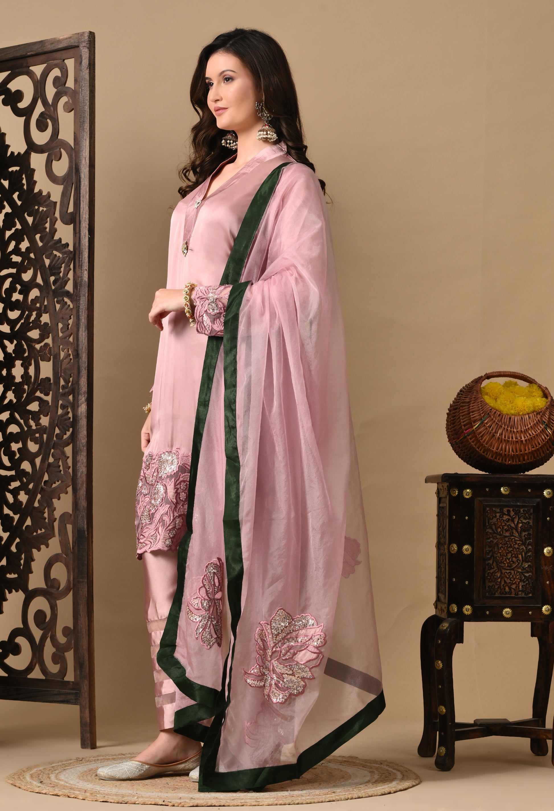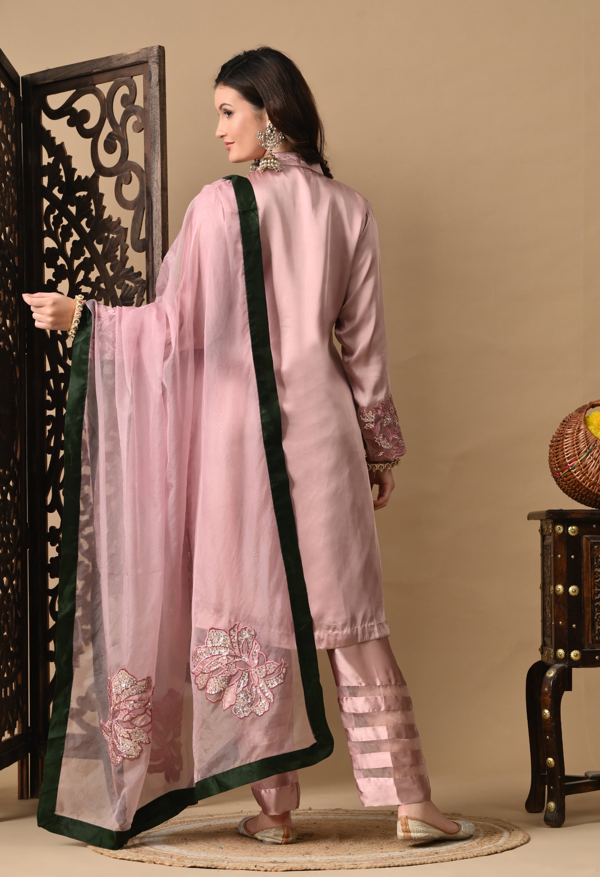 A pink silk kurta set featuring intricate thread, sequin and pearl embroidery. With organza dupatta, it’s made for celebration-ready elegance.